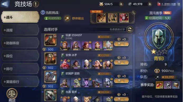 竞技场是目前的主要PVP玩法,在中间界面可选择战力相当的对手进行挑战,右侧会显示目前的段位、积分、队伍战力、赛季奖励等内容。在参与竞技场时,我们还要通过左侧的“防御阵容”提前设定自己的竞技场防御阵容。竞技场每周的挑战不同,例如“群体输出挑战”,就建议选择AOE伤害较高的英雄,更容易获得胜利。