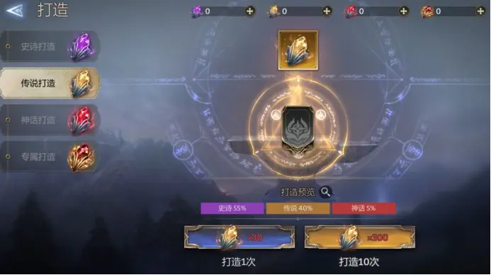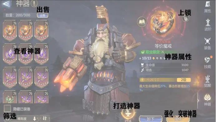 打造神器:消耗材料打造神器;神器打造要消耗对应品质的材料,传说打造有40%概率获得传说神器、5%概率获得神话神器。强化/突破:可提升装备属性,突破后可升级神器技能。