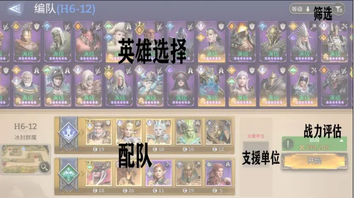 在挑战战役时会进入一个编队界面,我们可以选择相应的英雄挑战副本。界面下方是已选择的配队方案,双击已选择英雄可下阵对应目标,长按可进入这名英雄的养成界面;右上角可根据类型、阵营来筛选英雄,大家在挑战之前可看一下右下角的战力评估,每个关卡有推荐战力,提示危险就代表难度较高。主线推图一般是先提升战力,再推图,这样会事半功倍。