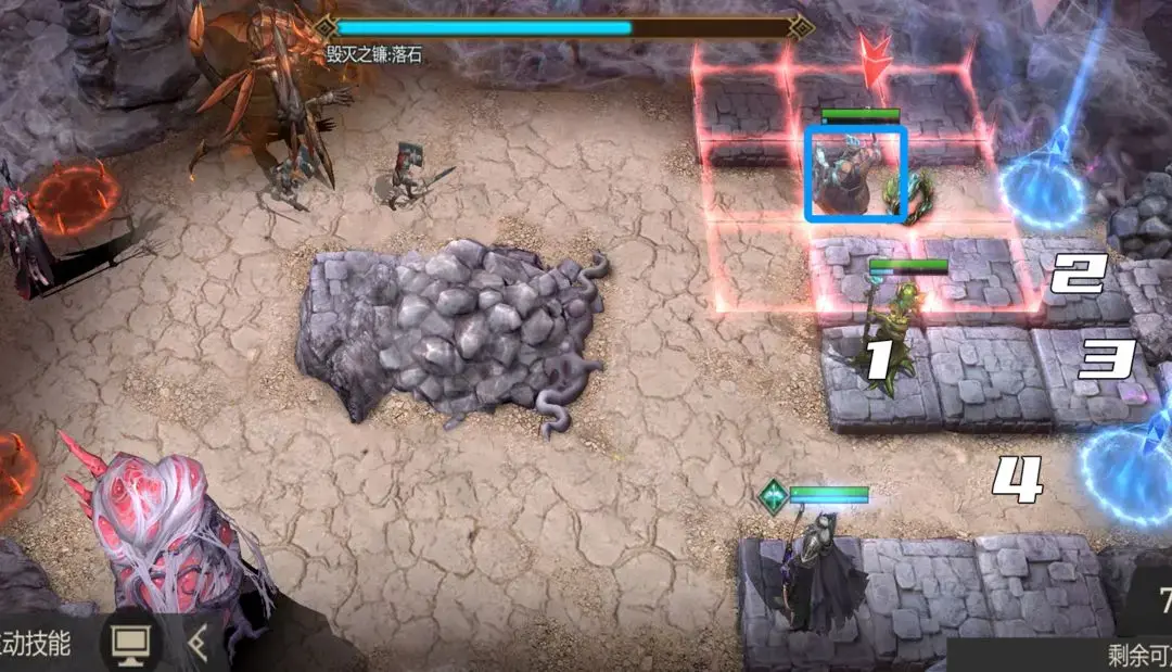 毁灭之镰会对守护者9宫格释放落石,所以一定要防止一名守护者承受攻击(如果没有守护者,会攻击全体),这关一般是有两种过法。一种是守护者9宫格不放置英雄,其他位置放置输出位;另一种是有强力奶妈,就可以顶着落石提供高额奶量,这样我们也不会被减员。