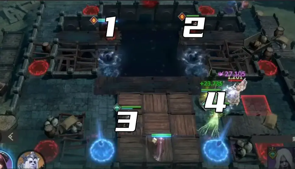 1、开场时在2号位置放置守护者,左侧的毁灭之镰会优先攻击右侧的守护者;我们可以在左侧3号位置放置射手(小丑、新郎),防御左侧敌人;毁灭之镰倒计时结束后会进攻,届时解掉即可。这边如果没有小丑、新郎,也可以用弋德莉尔或其他远程射手代替(有贯星领主加射程才能打到)。