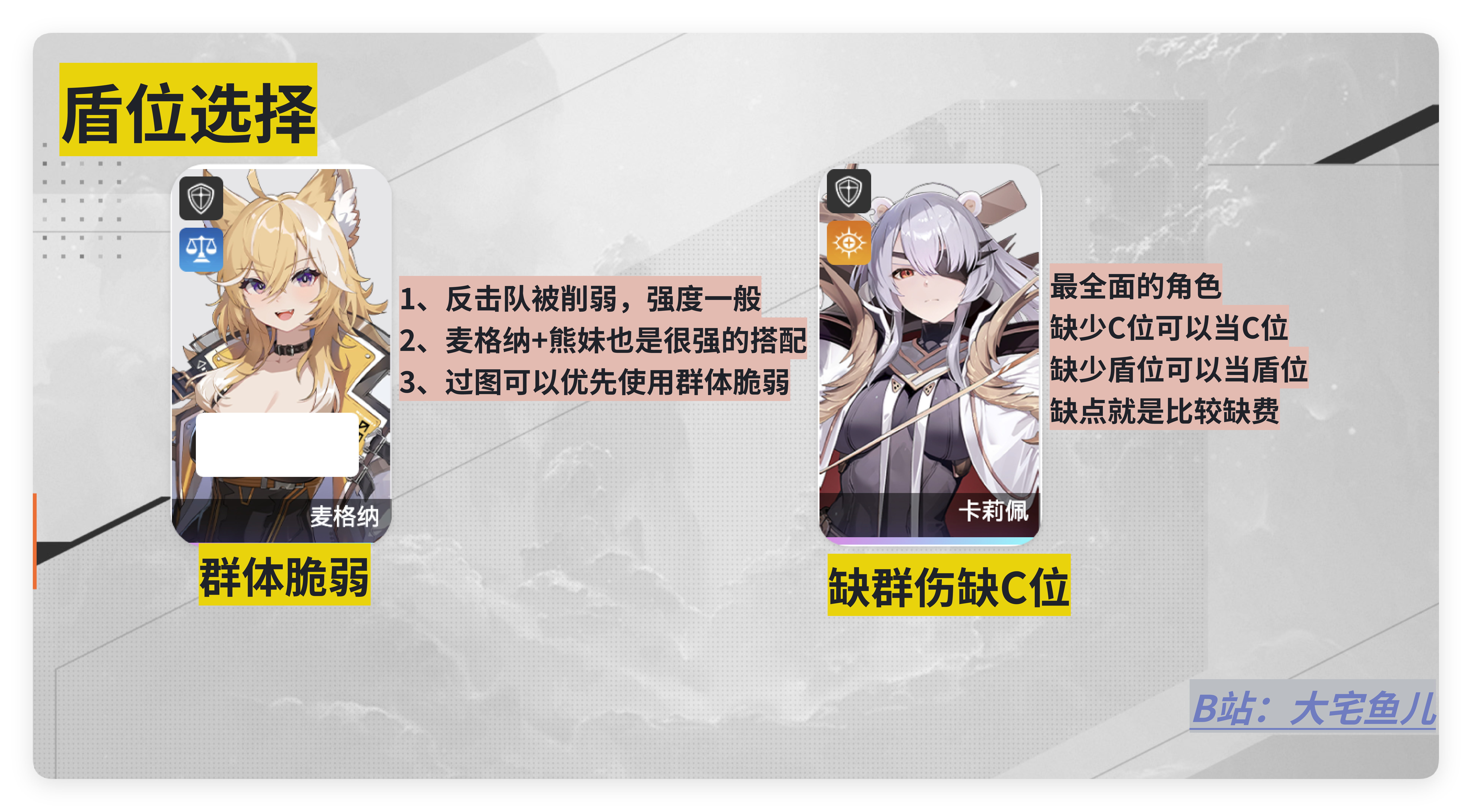 首先有必要提一下的是游戏中的两个五星盾卫,盾卫在游戏中是比较全面和万金油的存在,特别是卡利佩这名角色。只要你缺少群攻C或者需要盾卫坦克,那卡利佩就可以入队,而麦格纳在泛用性和强度上相比卡里佩稍弱,但如果抽到也不是不能养成的存在,她的核心机制在于1费卡补充寒气(盾100%,群体脆弱2)。而由麦格纳与卡里佩组成的双盾体系同样也是可以玩的套路,唯一要注意的是 卡利佩的核心输出技能秃鹰发射需要队友打出2费以上的卡才能触发,总之卡利佩的配队想当灵活 如果拿不准就毫不犹豫的带上她就好!