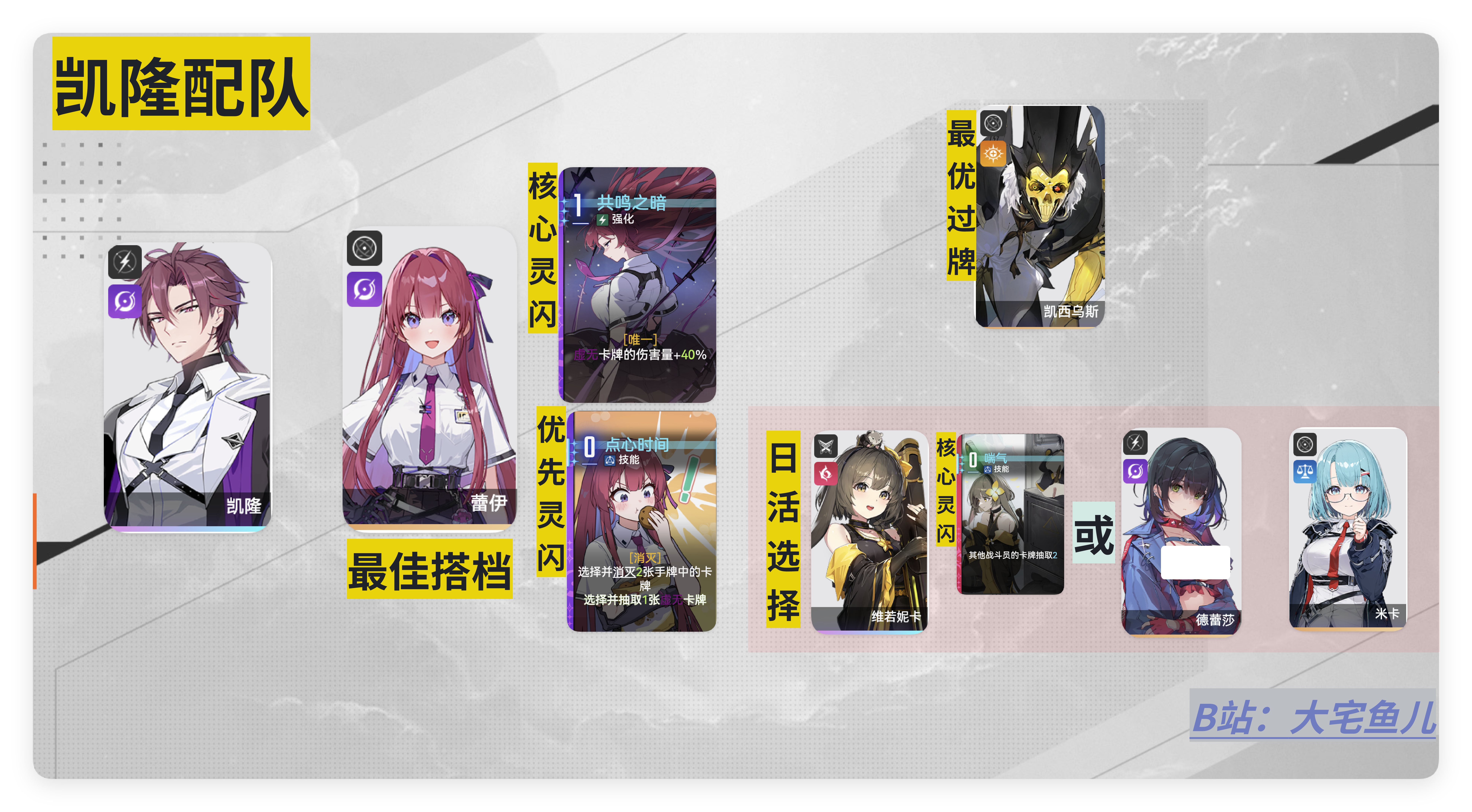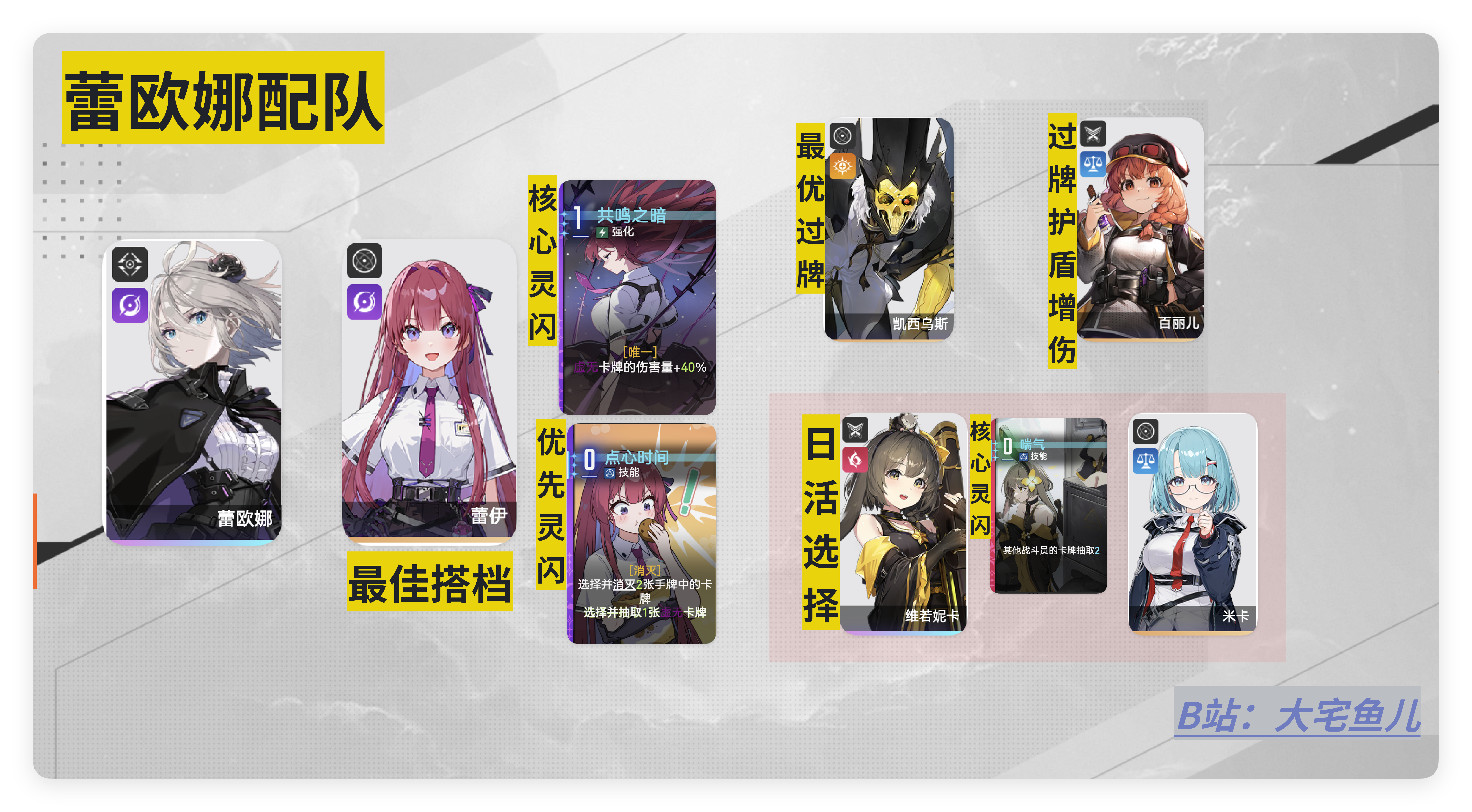 接下来来到虚无三C的时间!酷炫往往需要代价,如果想要玩暗系角色,我们的蕾伊灵感一定要去努力刷取,因为这是游戏中最适配暗系角色的辅助,她的强化共鸣共鸣之暗和点心时间都是强化暗系的必备,无论是琳 凯隆 德蕾莎 都是刚需这些buff强化的。