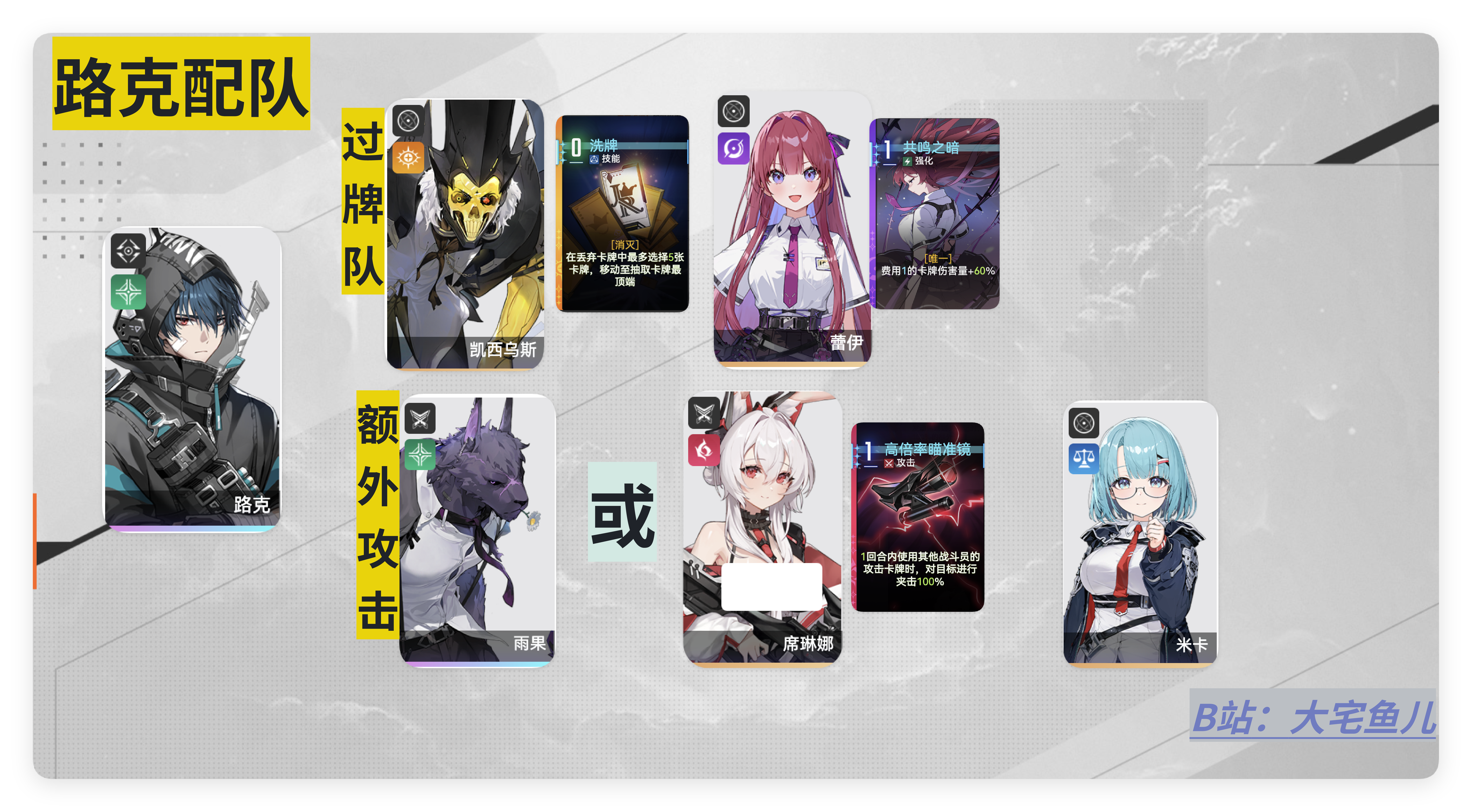 ②均衡队:游戏中万金油的组队模式 几乎适配所有主c队伍,选择鼠鼠(维若尼卡)与米卡为队友,维若尼卡是游戏中的顶级副C 补伤害+过牌为一体的角色,她的核心牌【喘气】也可以帮助友记触发效果,米卡就不多说了,游戏中最万金油的辅助,集合补费 回血为一体的角色。这个队伍的上限可能没有过牌队高,但胜在稳定 高效 且下限更高。