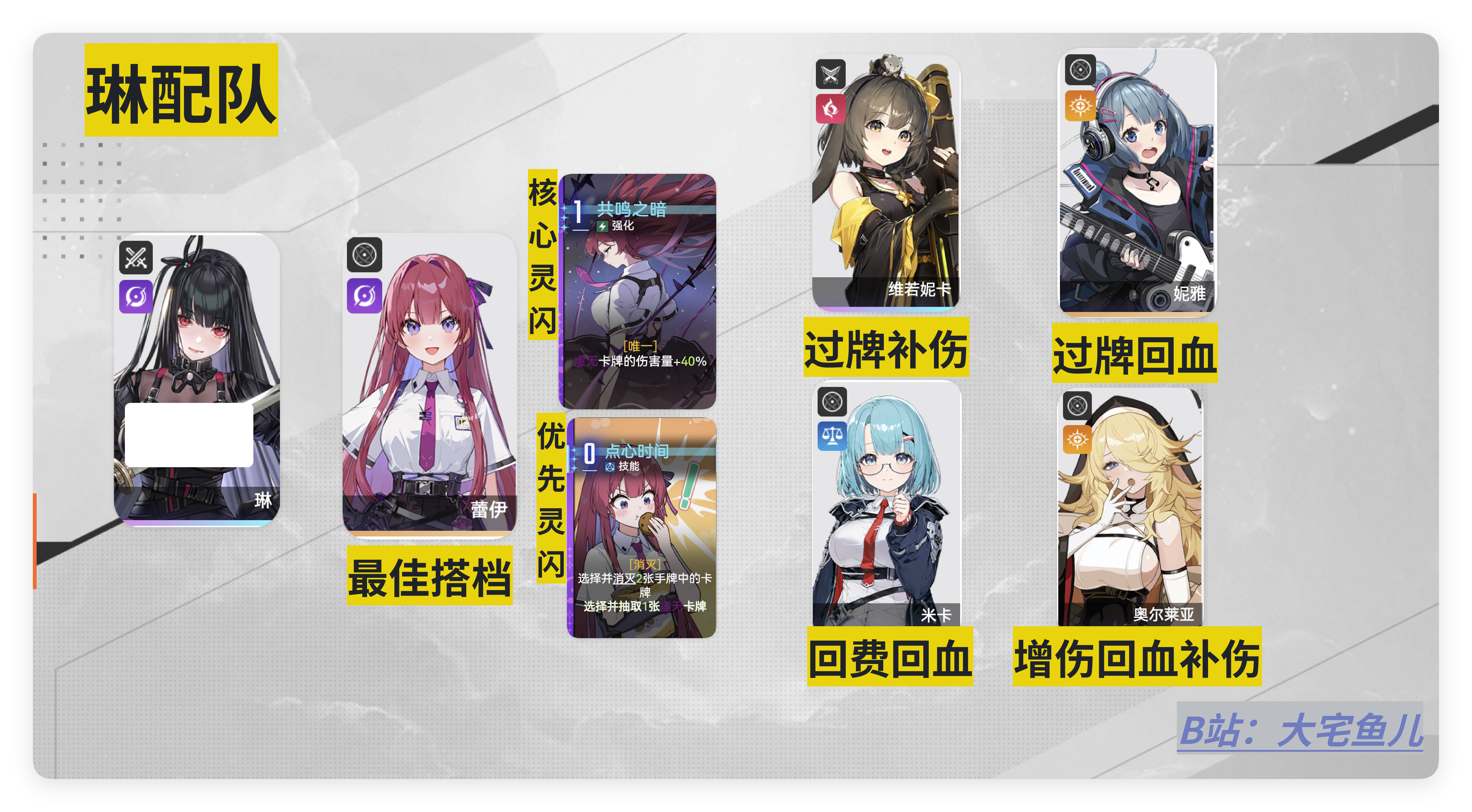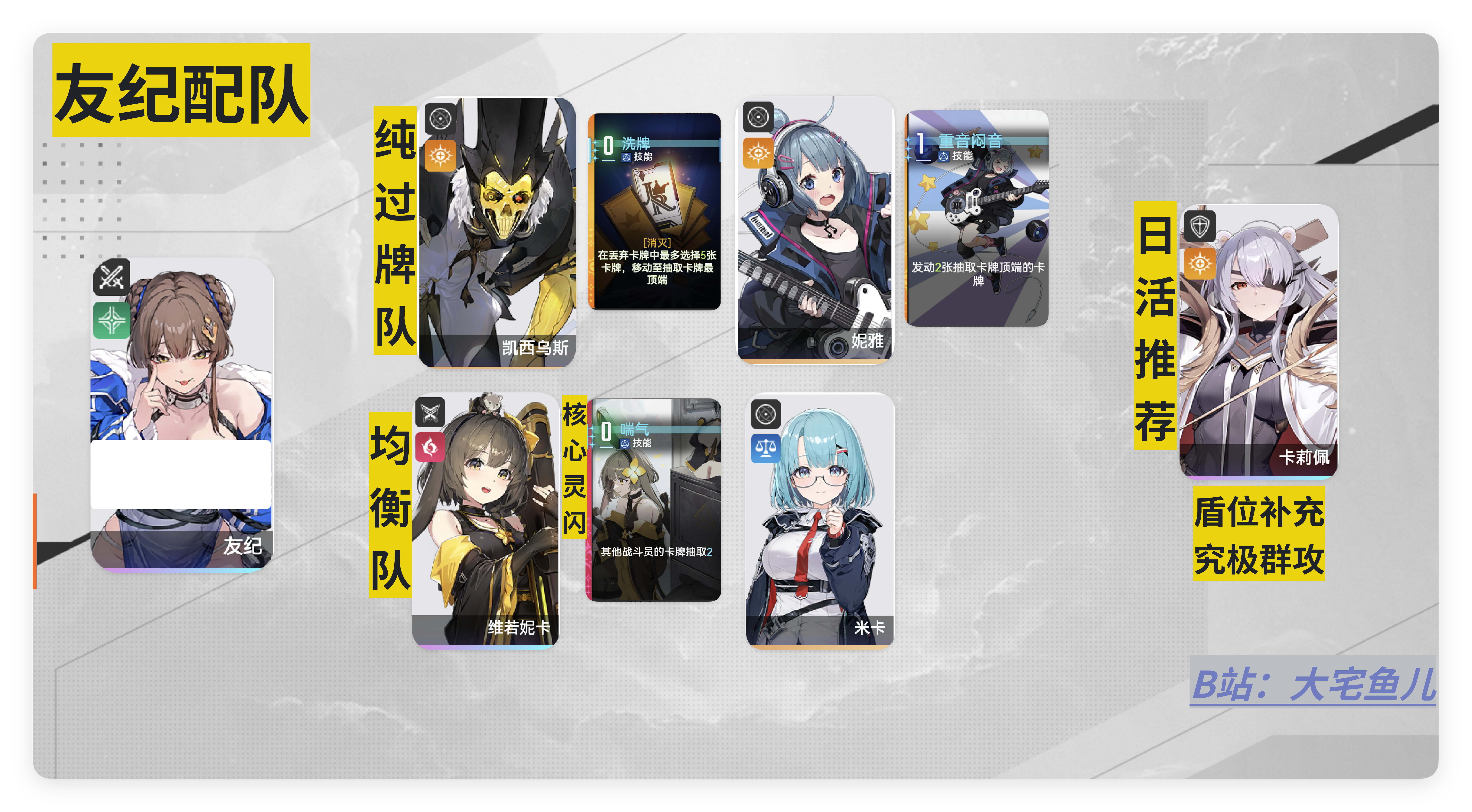 ①纯过牌队:刚需小丑与妮雅作为队友,依靠他们强大的过牌能力不断触发友记的灵感强化,如果选择此队友 小丑【洗牌】与妮雅【慢板】【G和弦】的灵感一闪也可以有意识刷取,可以组成丢牌自选——移动顶部——触发灵感的强力combo