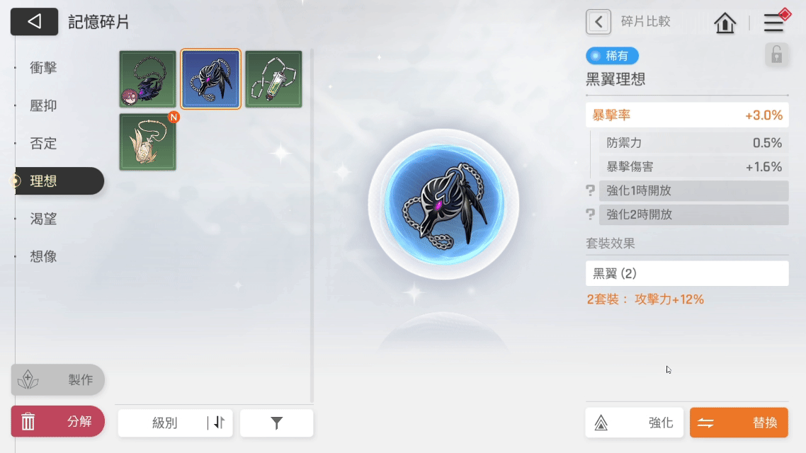 记忆碎片由低到高分为绿色(高级)、蓝色(稀有)、金色(传说)三种品质,区别在于其强化次数以及词条基础数值