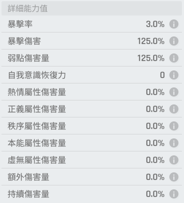可以看到,角色初始自带3%暴击率和125%的暴击伤害以及125%弱点伤害量(弱点克制时增加的伤害)