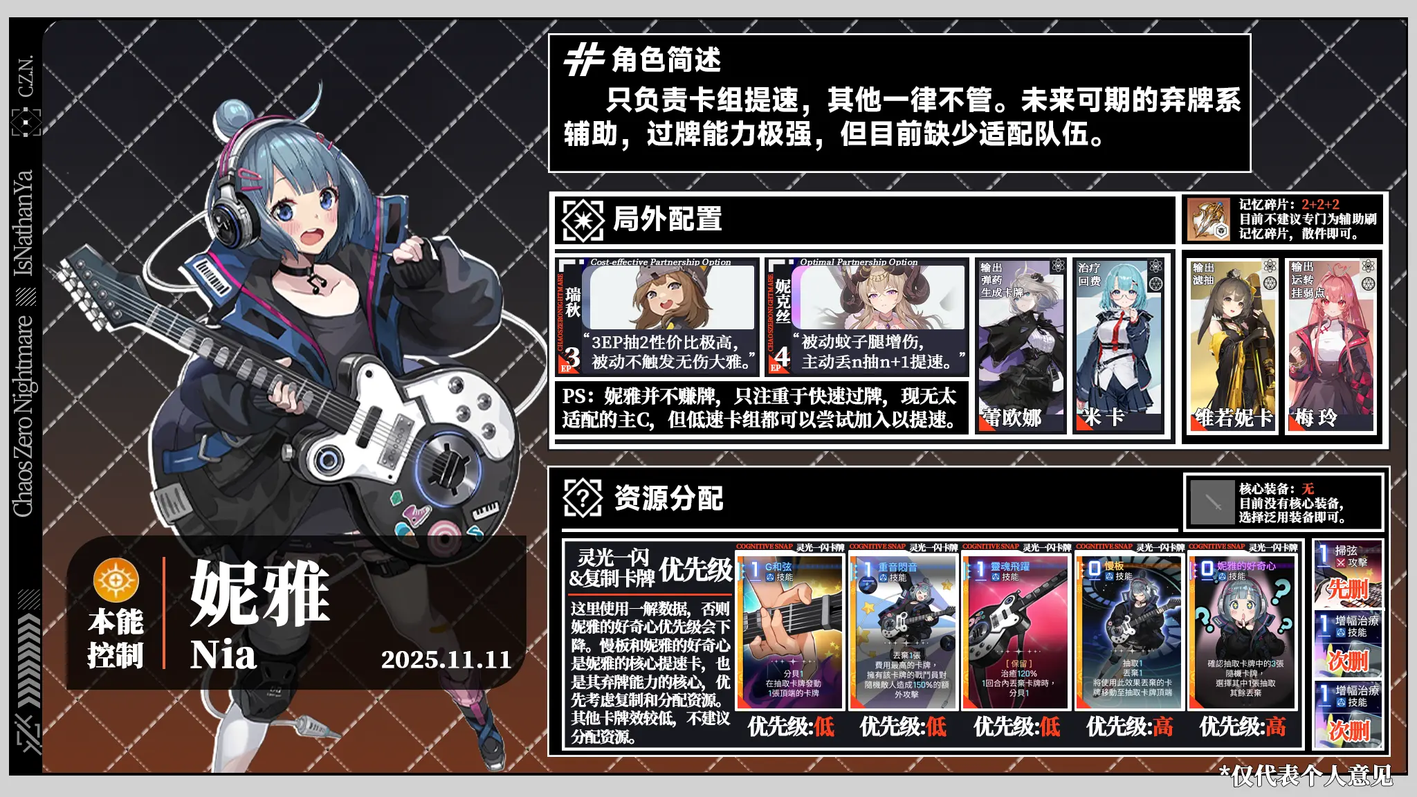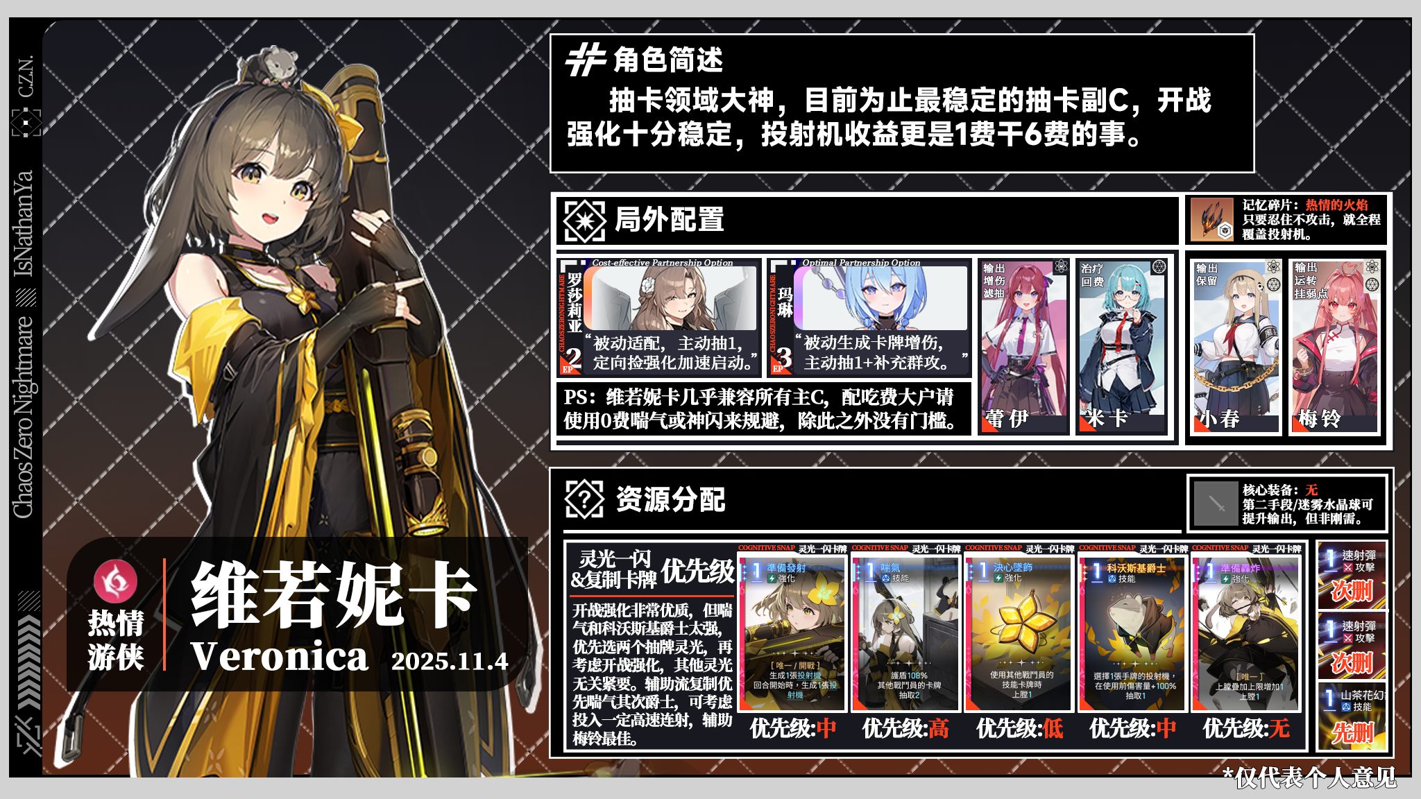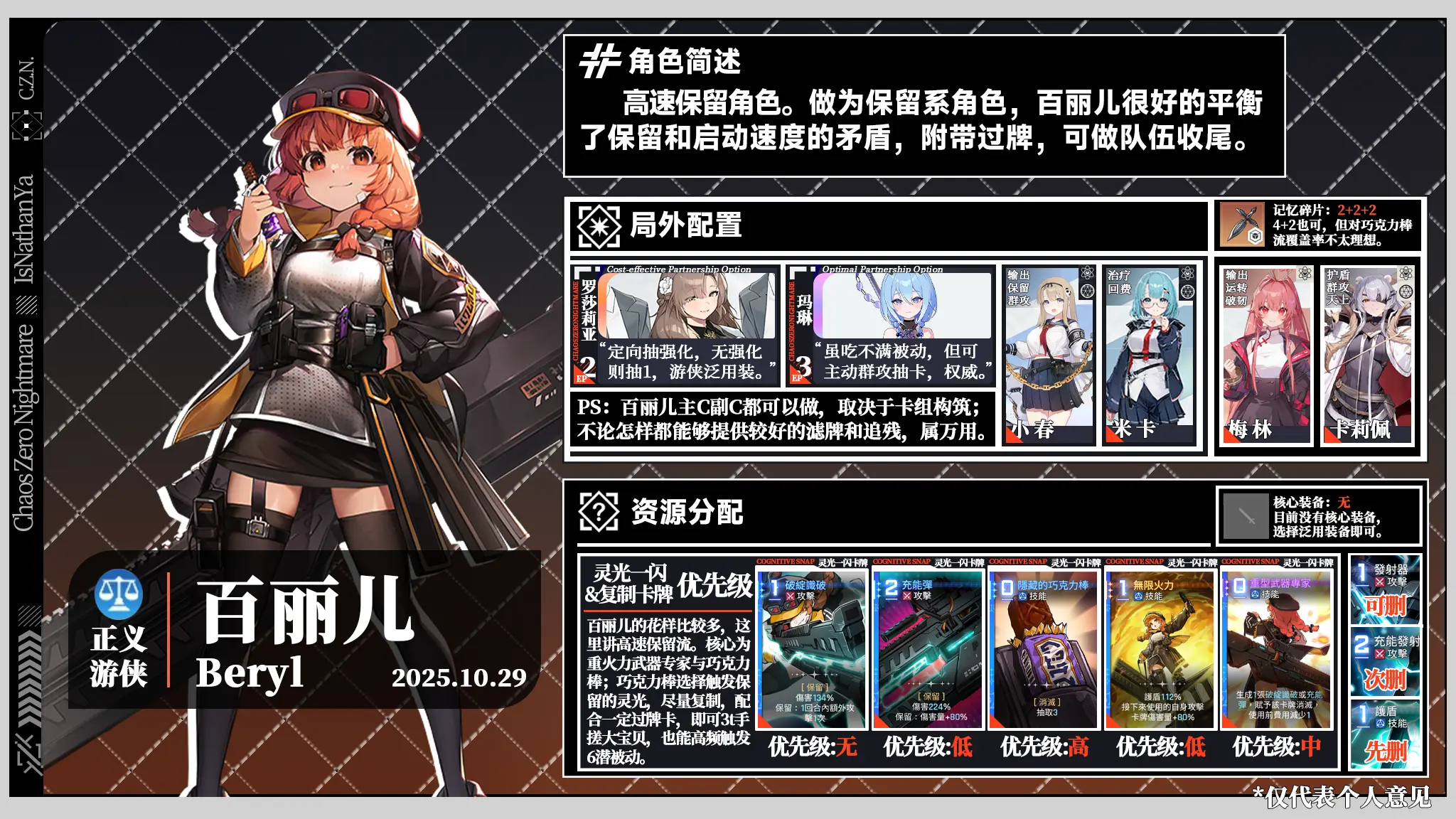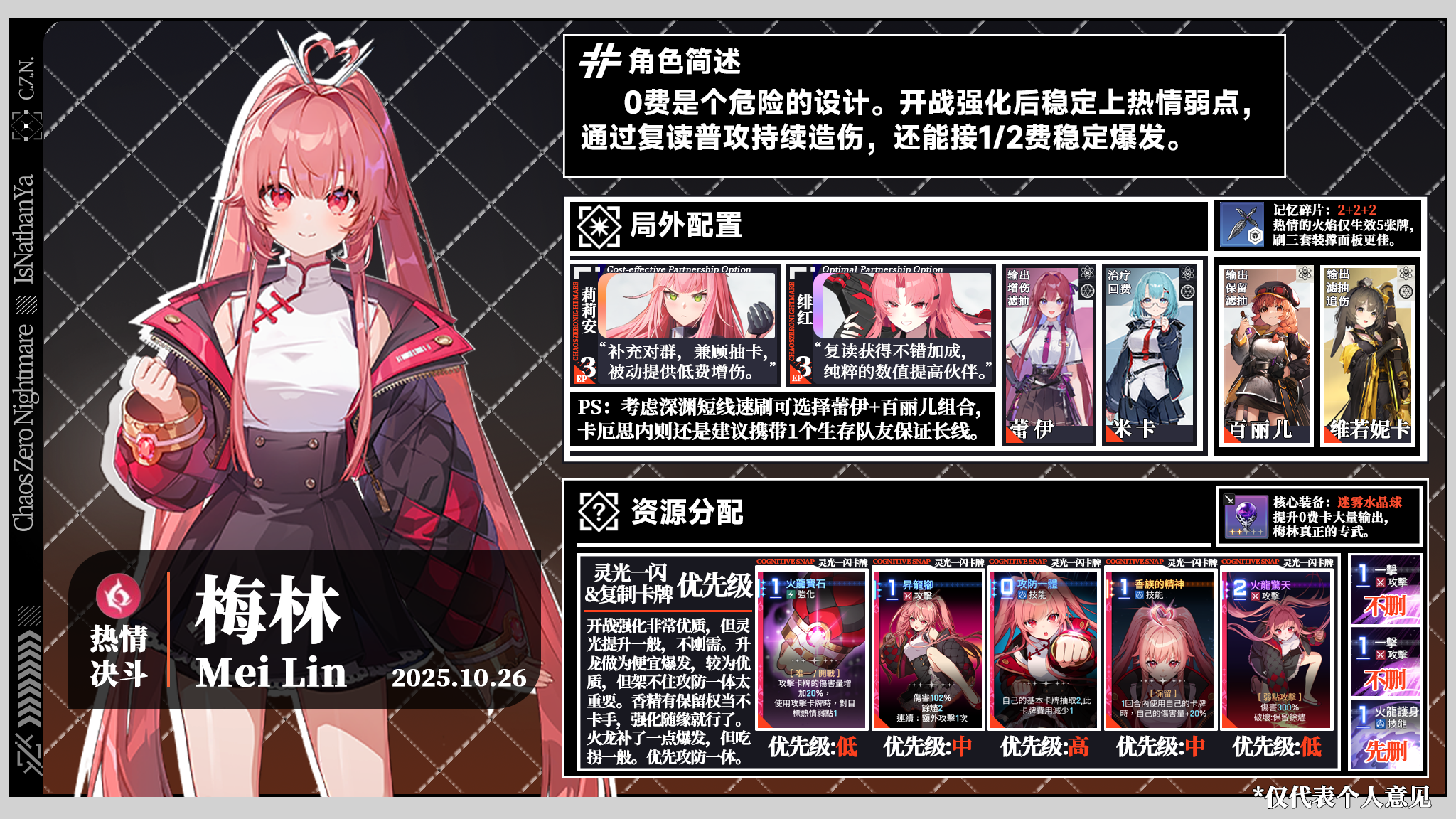 食用方法:队友左上角文字指代其特色,右上角角标表示其与图中角色的模式相性;删牌优先级先删>次删>可删>不删。