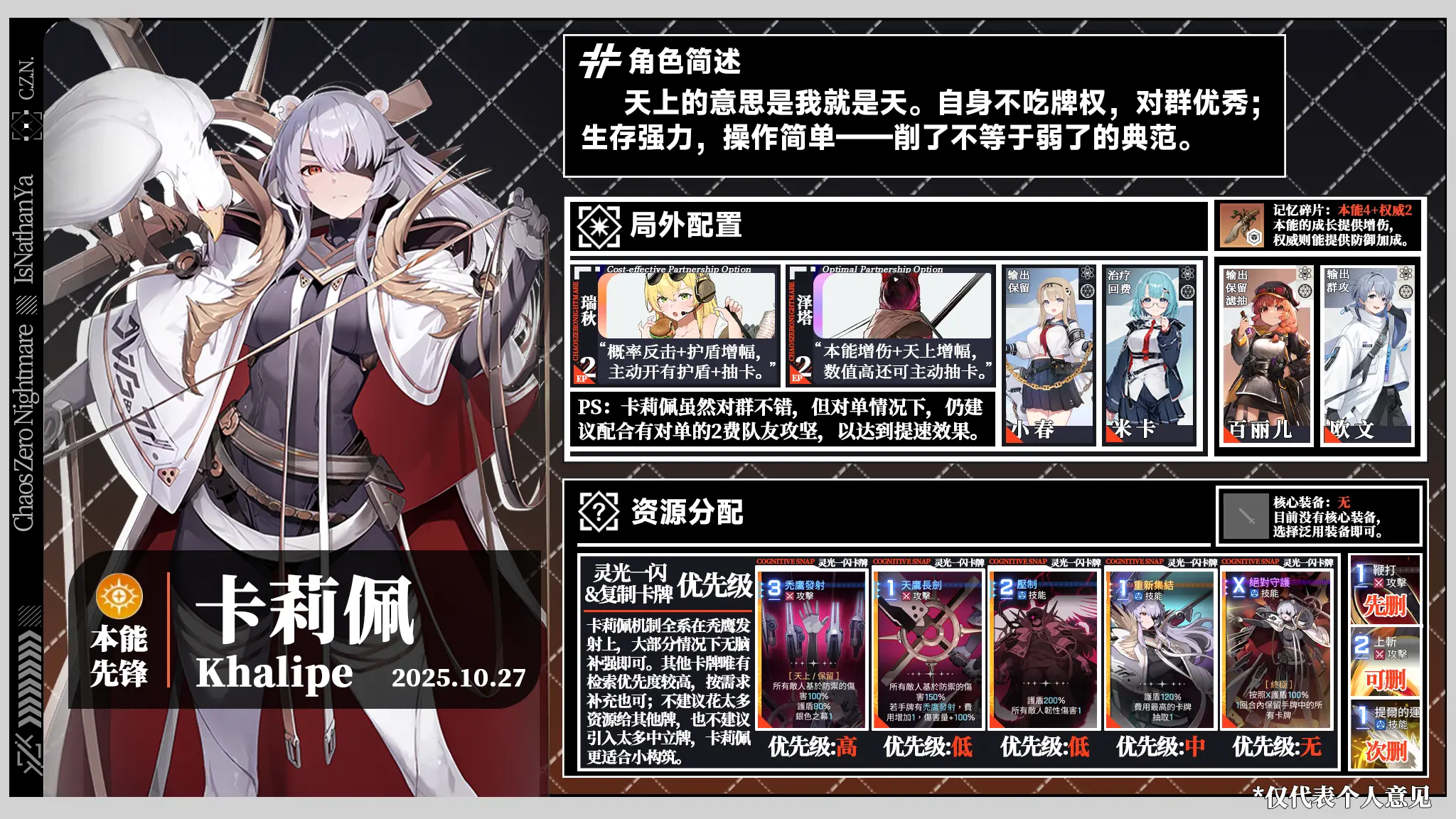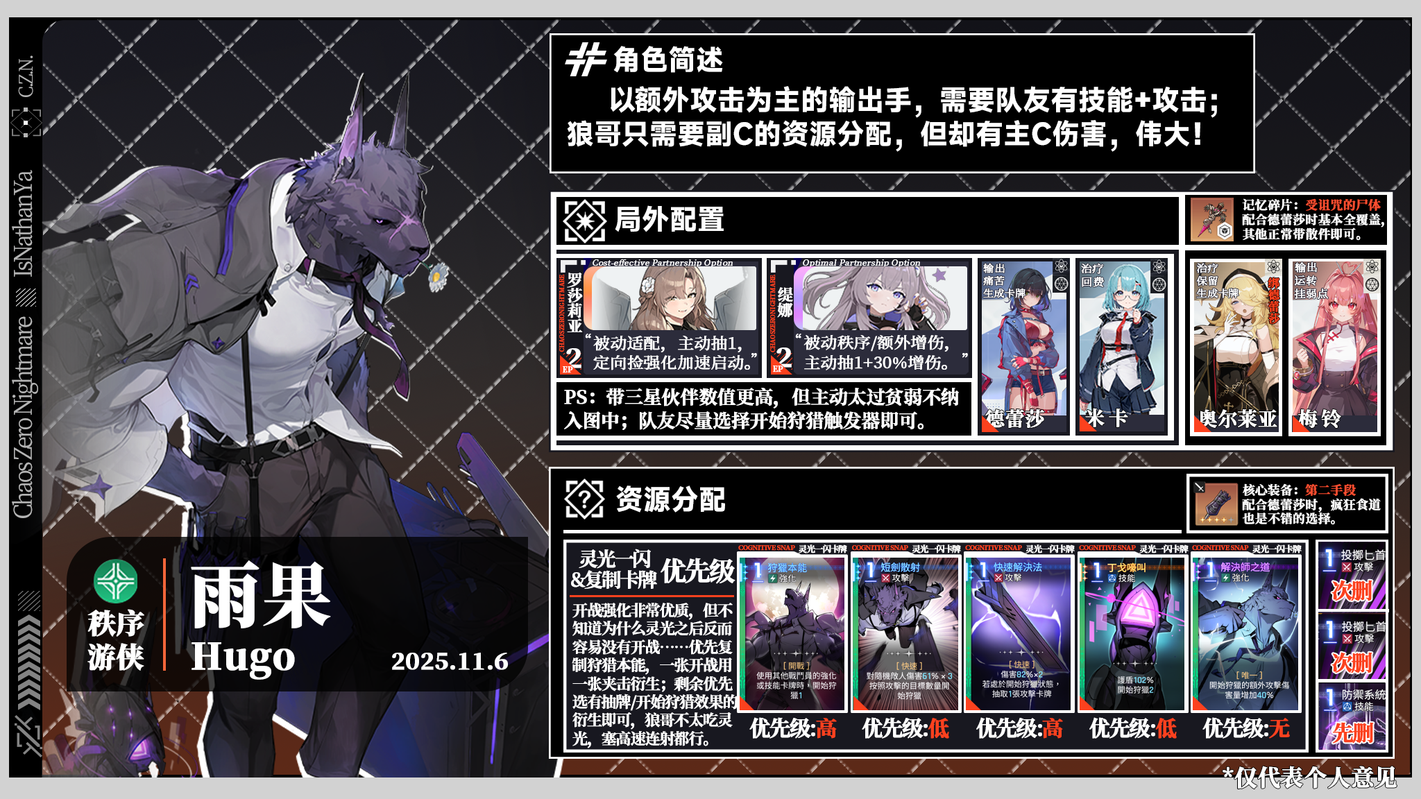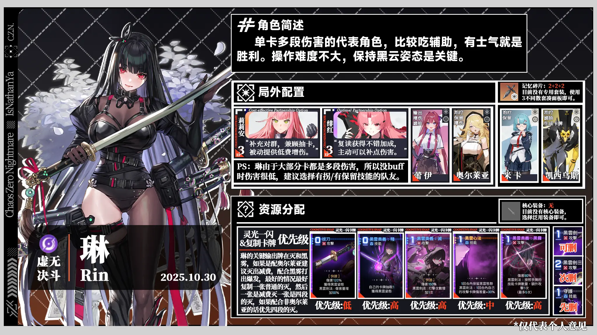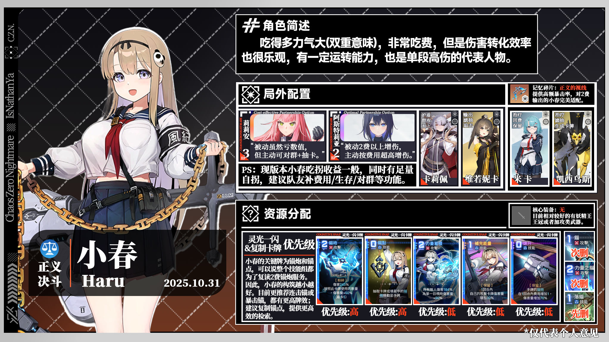 食用方法:队友左上角文字指代其特色,右上角角标表示其与图中角色的模式相性;删牌优先级先删>次删>可删>不删。