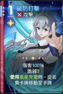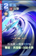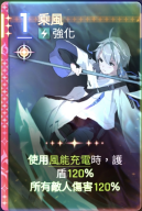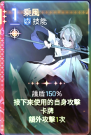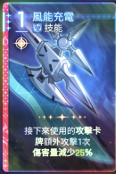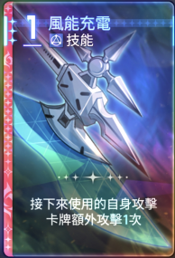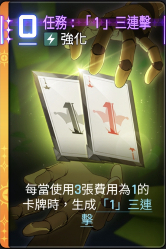 欧文核心卡,可以让欧文的所有攻击次数为1段的卡牌额外攻击一次,灵光一闪后变为全队,实际运用起来大部分情况下算是提升卡牌100%伤害一次,本质上是提升了欧文的输出频率,对欧文自己使用的中立卡生效,要注意的是在使用多段攻击的卡牌的时候,的效果会随卡牌攻击段数的提高而被稀释。例如中立卡打3下,每次造成50%的伤害,总计150%面板倍率。但在使用了之后,效果变更为了造成4次50%的伤害,总计200%面板倍率,提升幅度只有三分之一,并且卡牌的附加效果并不会多次生效(例如德蕾莎的飞刀只是伤害变高,但是痛苦不会附加两次)。这张卡灵光一闪的效果之强大,使得欧文能跻身当前版本前三水平的辅助(注:现在也就只有3个拐)。使用风能充电后,韧性伤害并没有变化
