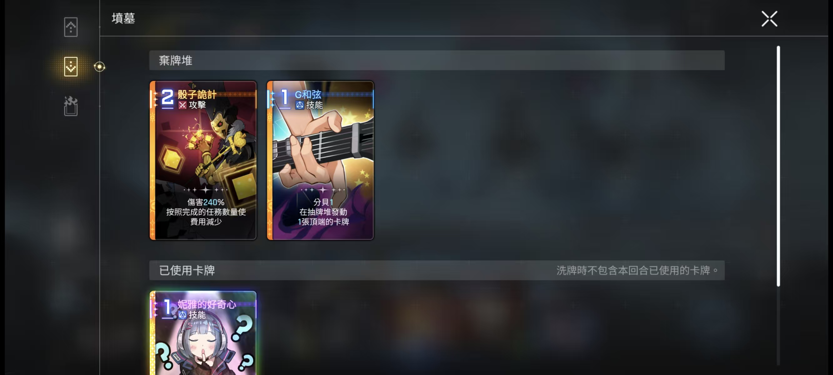 我们在局外的超空间环境时,由于有回合数限制,每回合抽牌的质量非常重要,而又因为存档PT的限制,删了很多牌的卡组不容易被从卡厄思里带出来。以下词条是战斗中常用的压缩牌库选择: