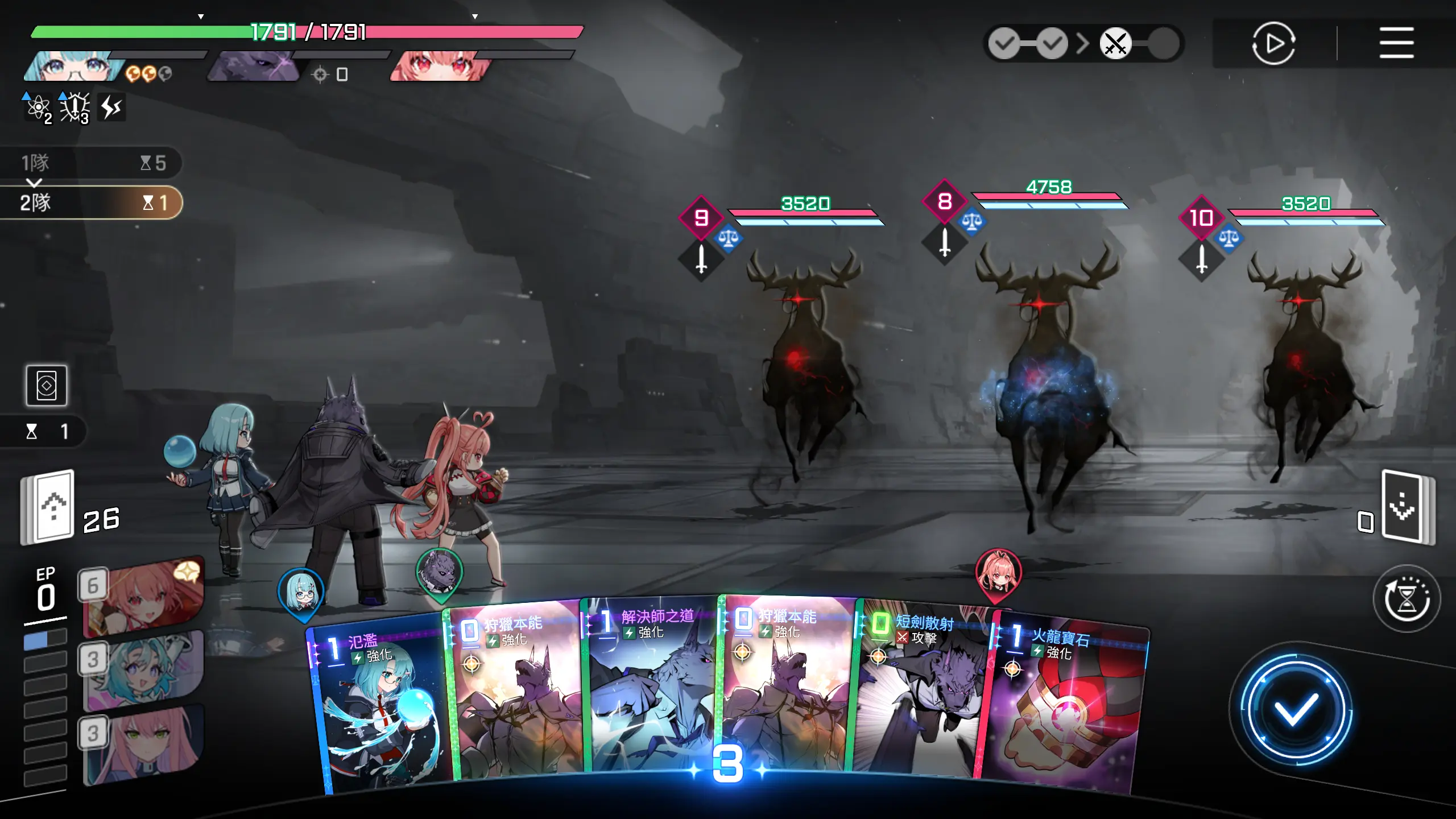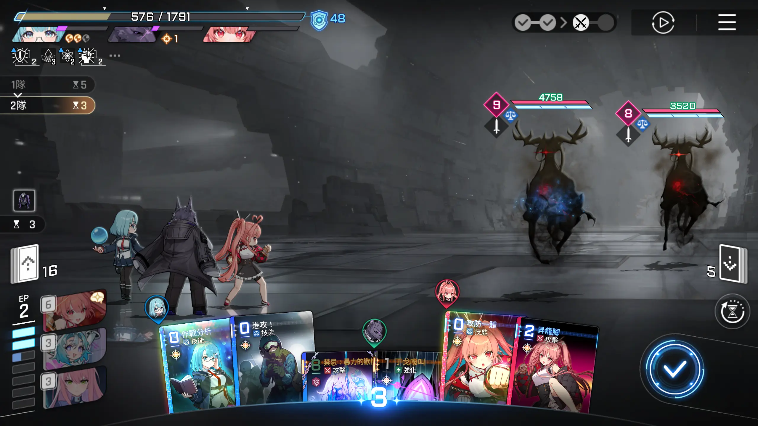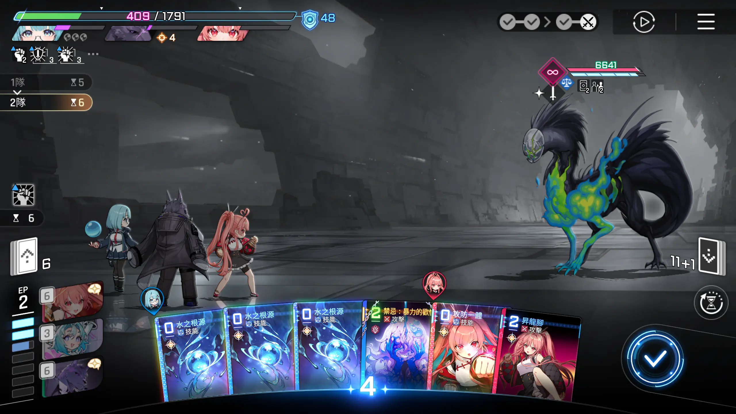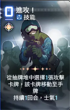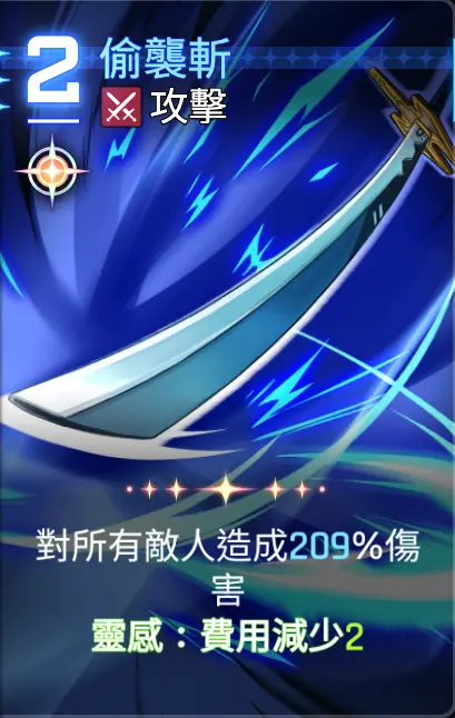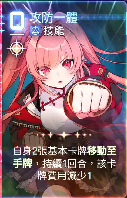 起手,可使用的卡牌的ap消耗为2点,有作战分析的水波的回复,实际可调用AP点为四点,所以可以用进攻选择一张1~2费的攻击卡牌,然后再使用攻防一体移动一击至手牌,这样可以多打出一些伤害。