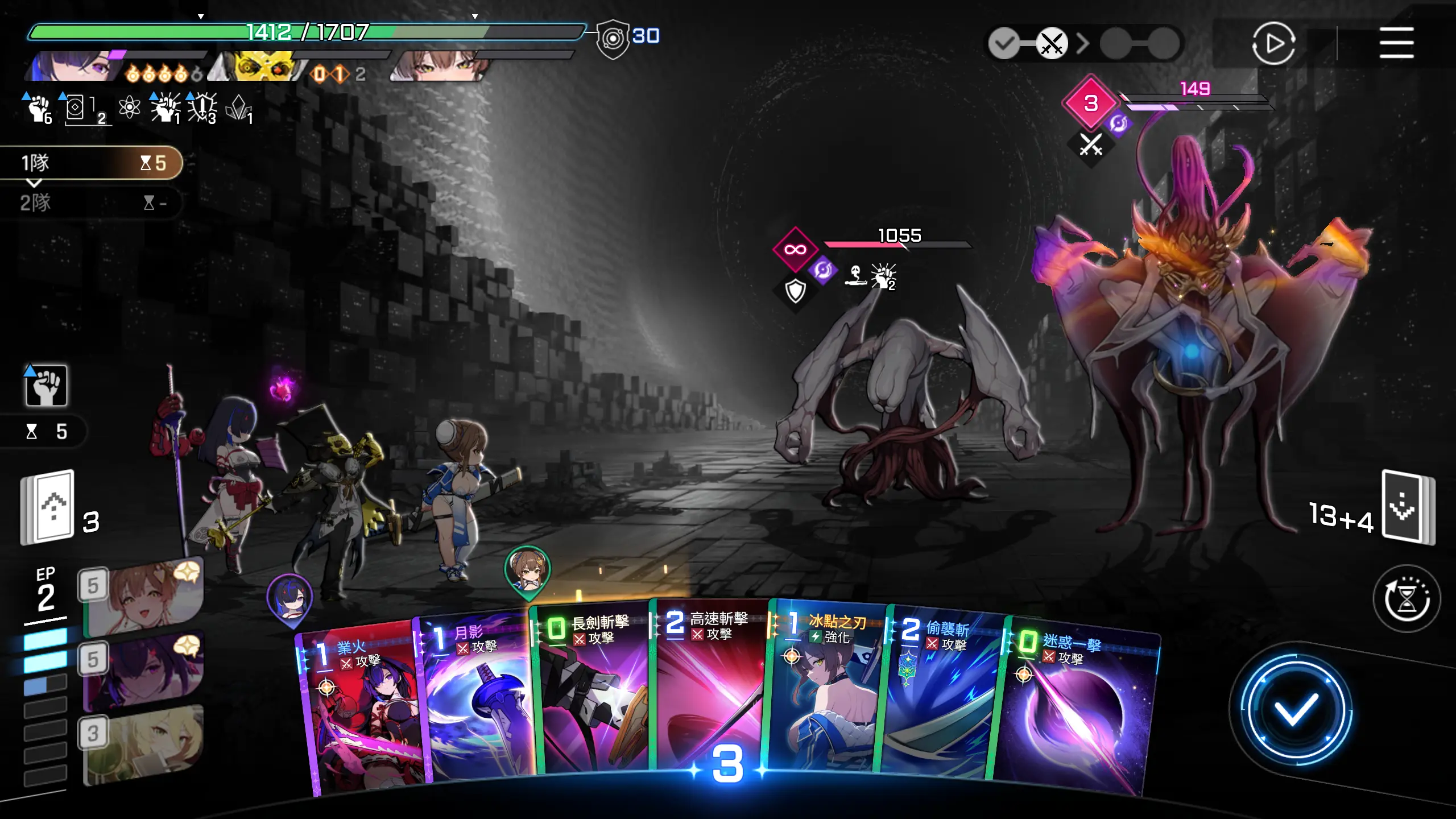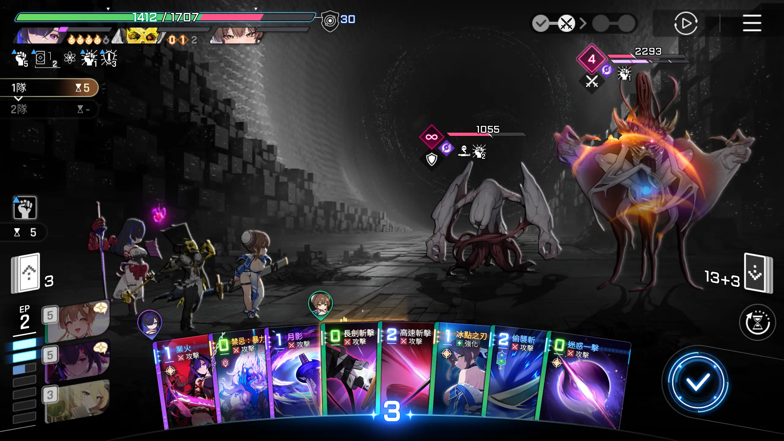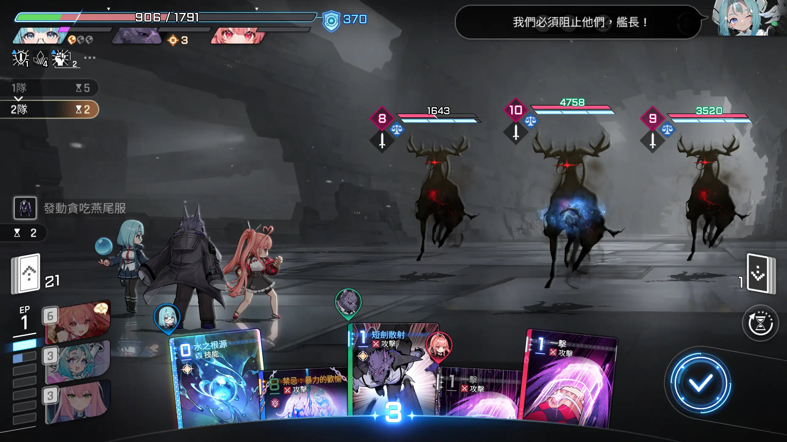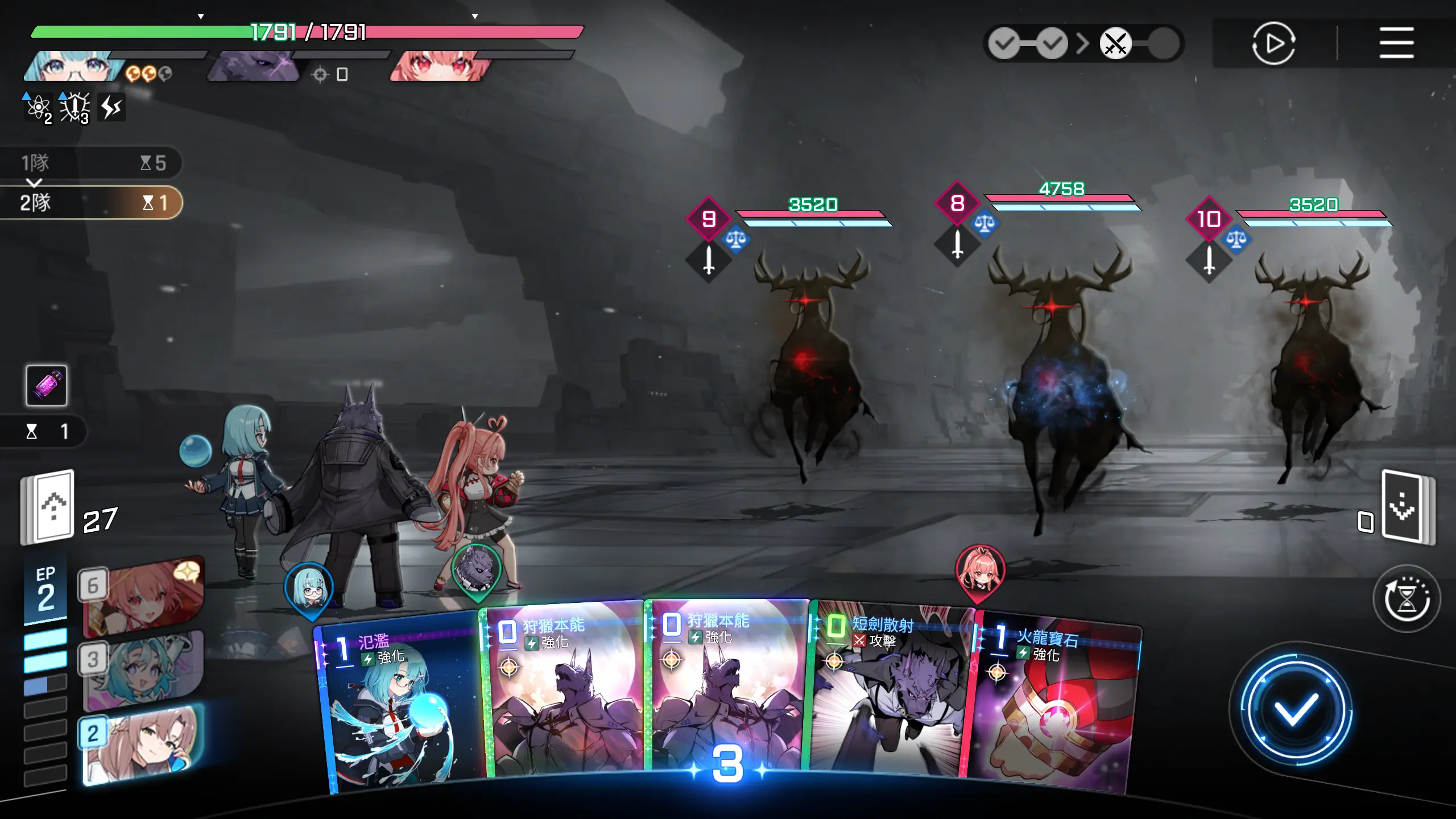 起手,可使用的卡牌的ap消耗为2点,有作战分析的水波的回复,实际可调用AP点为四点,所以可以用进攻选择一张1~2费的攻击卡牌,然后再使用攻防一体移动一击至手牌,这样可以多打出一些伤害。