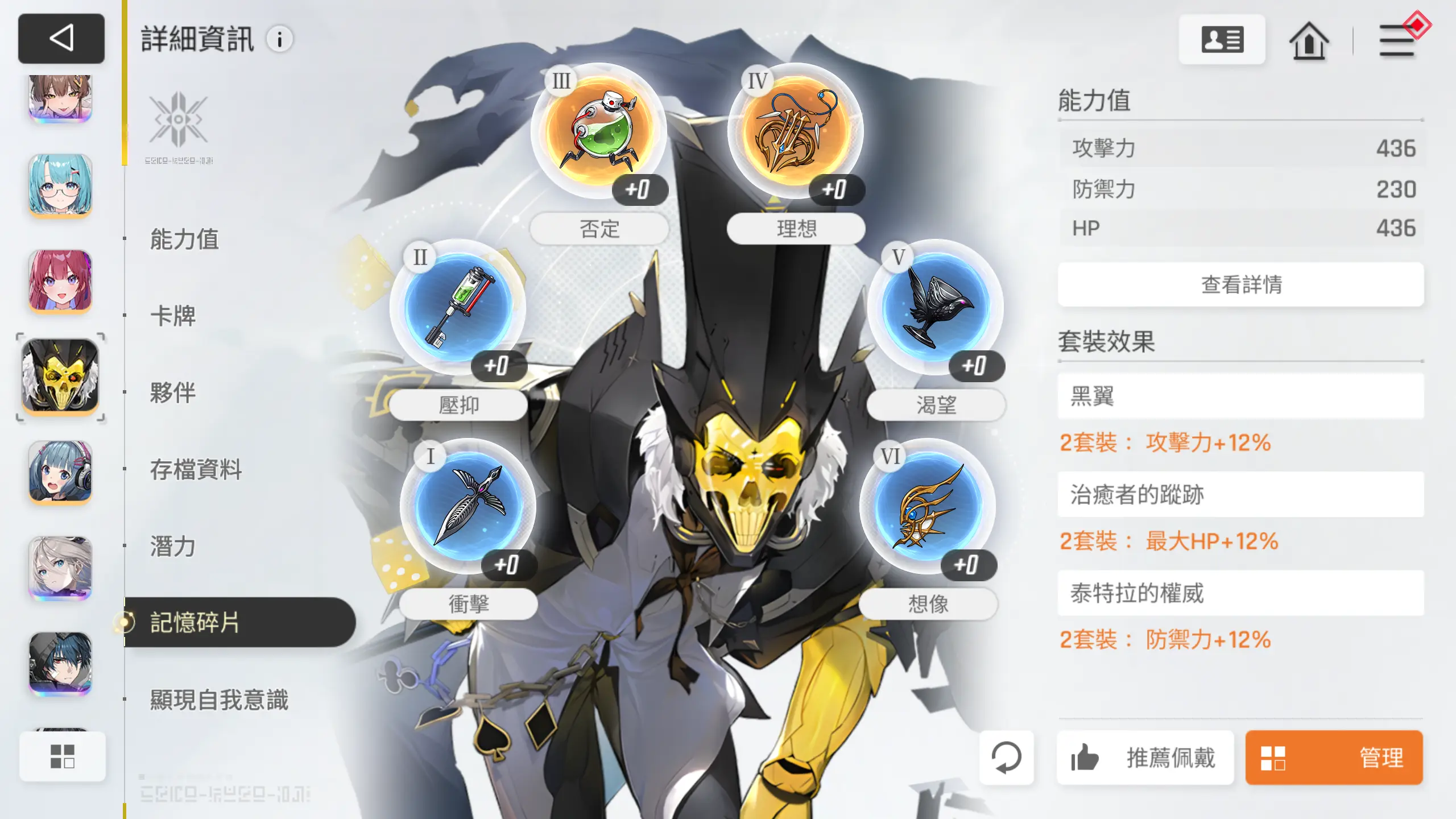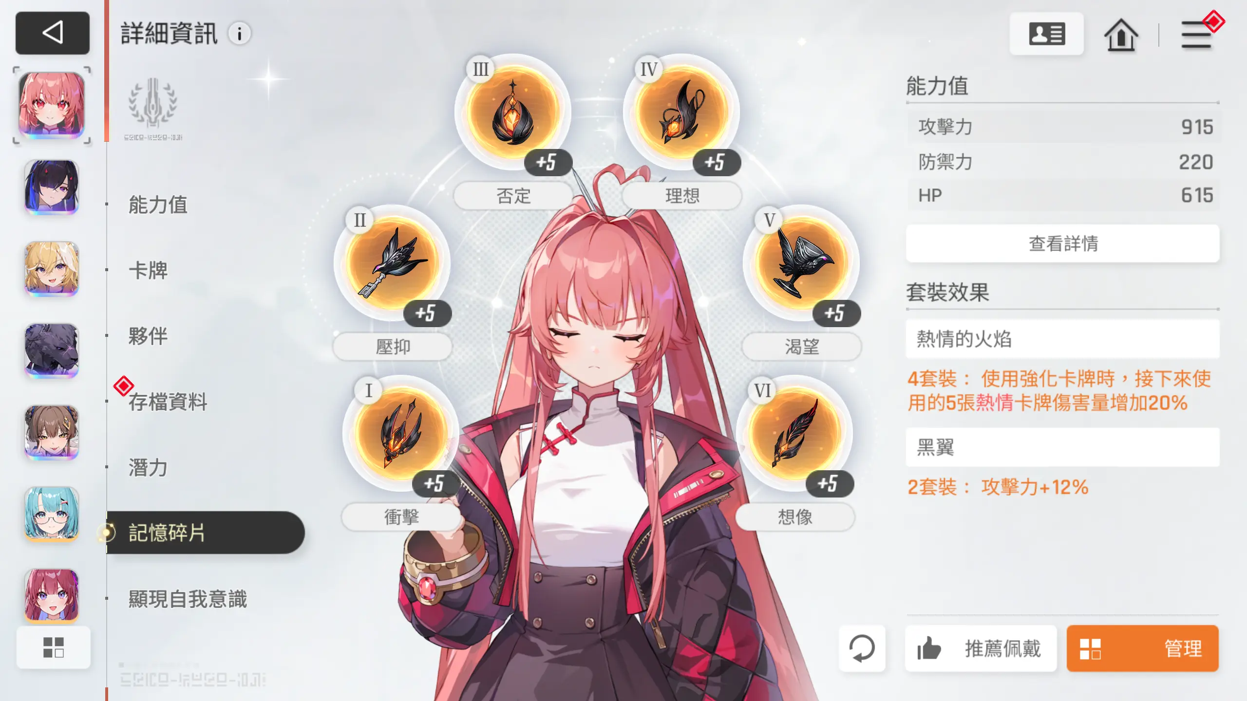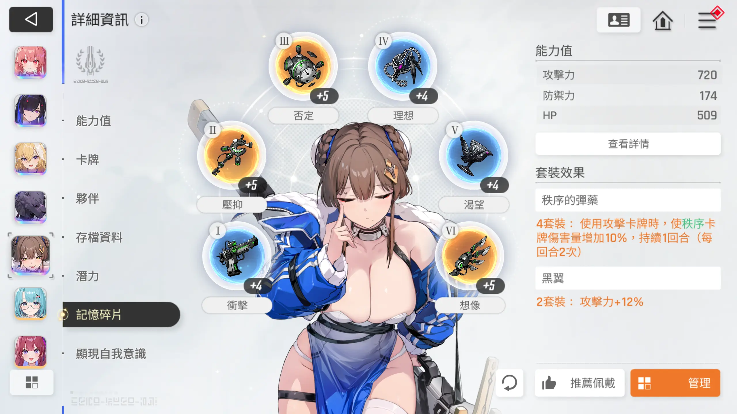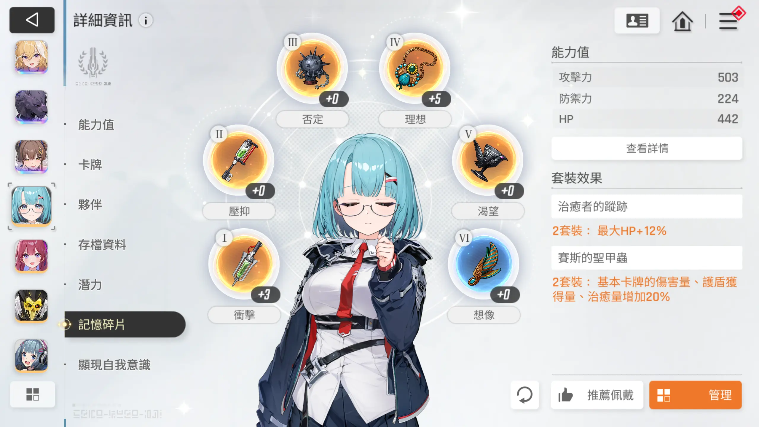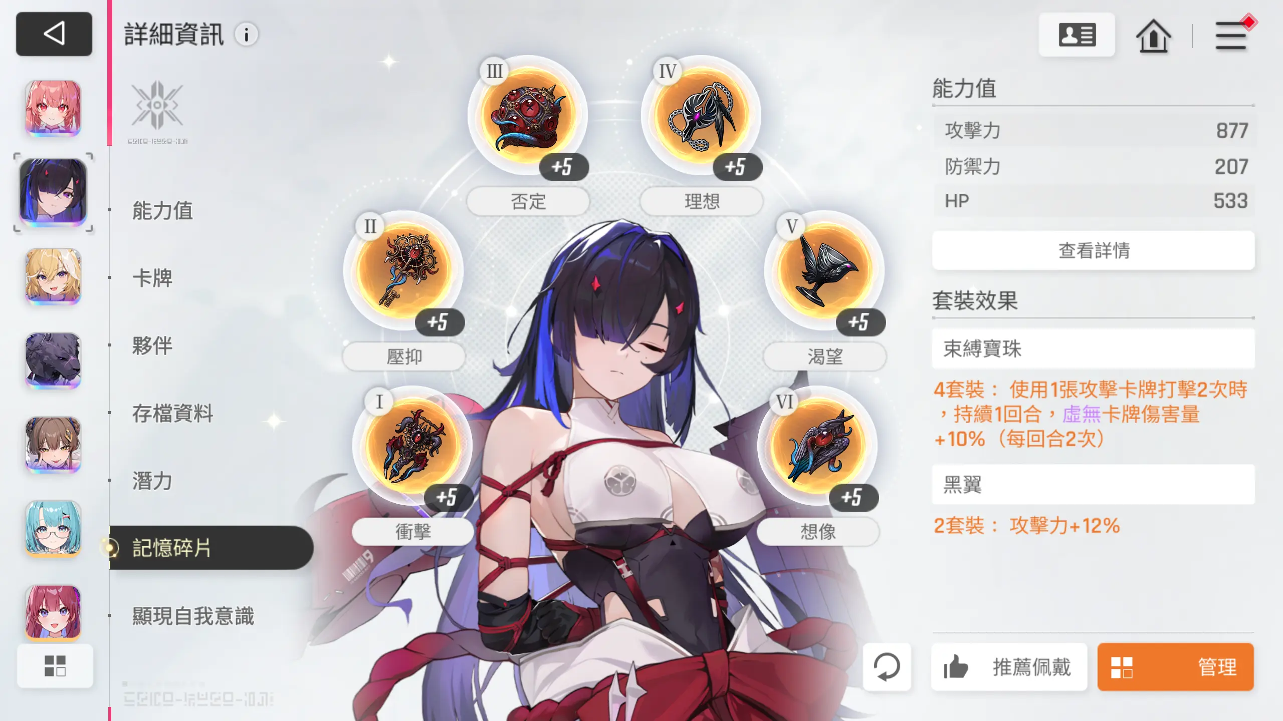 记忆碎片选择2+2+2即可,【千鹤】和【友纪】尽可能伤害最大化即可,【凯格乌斯】吃个套装效果就够了。