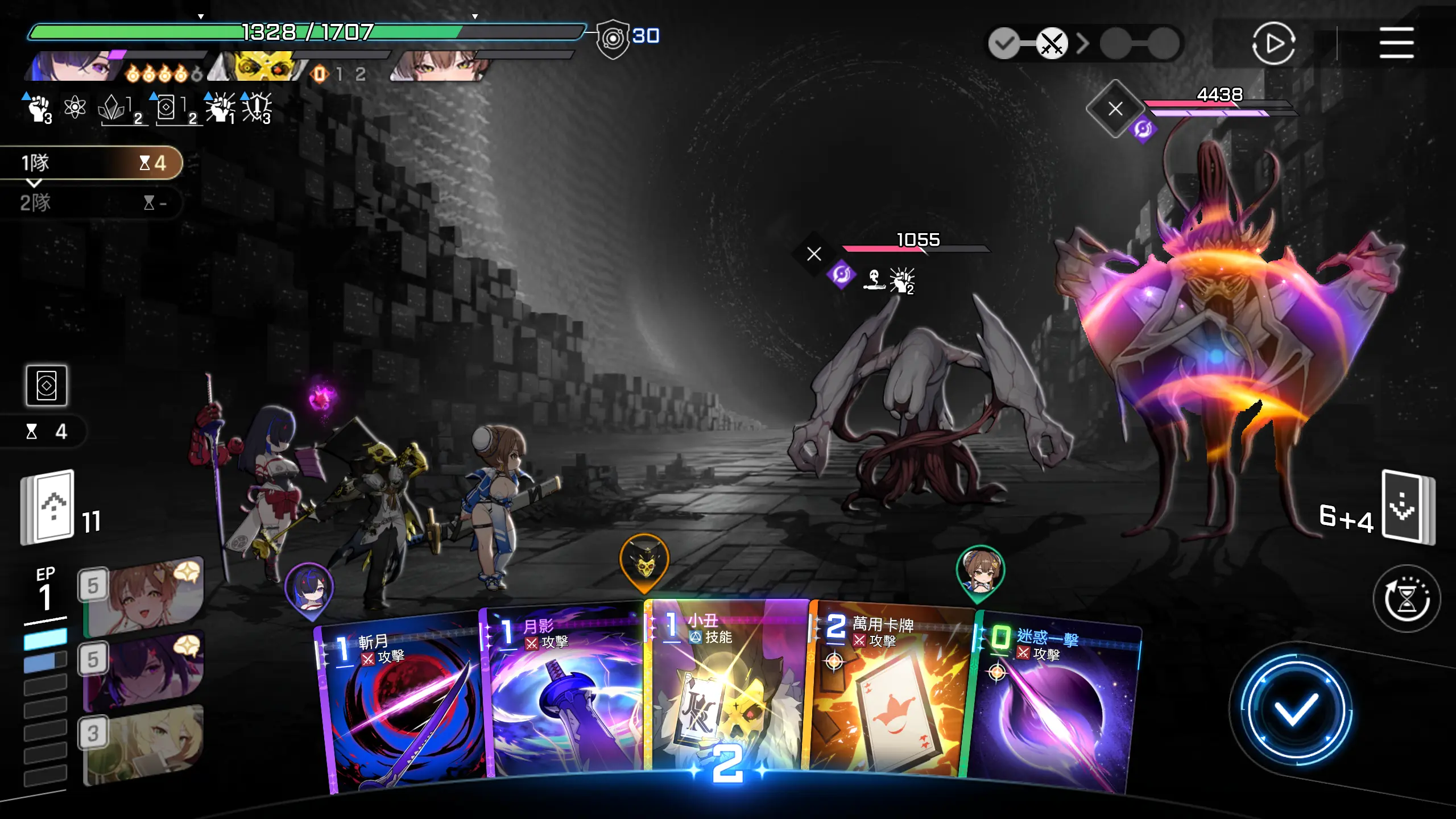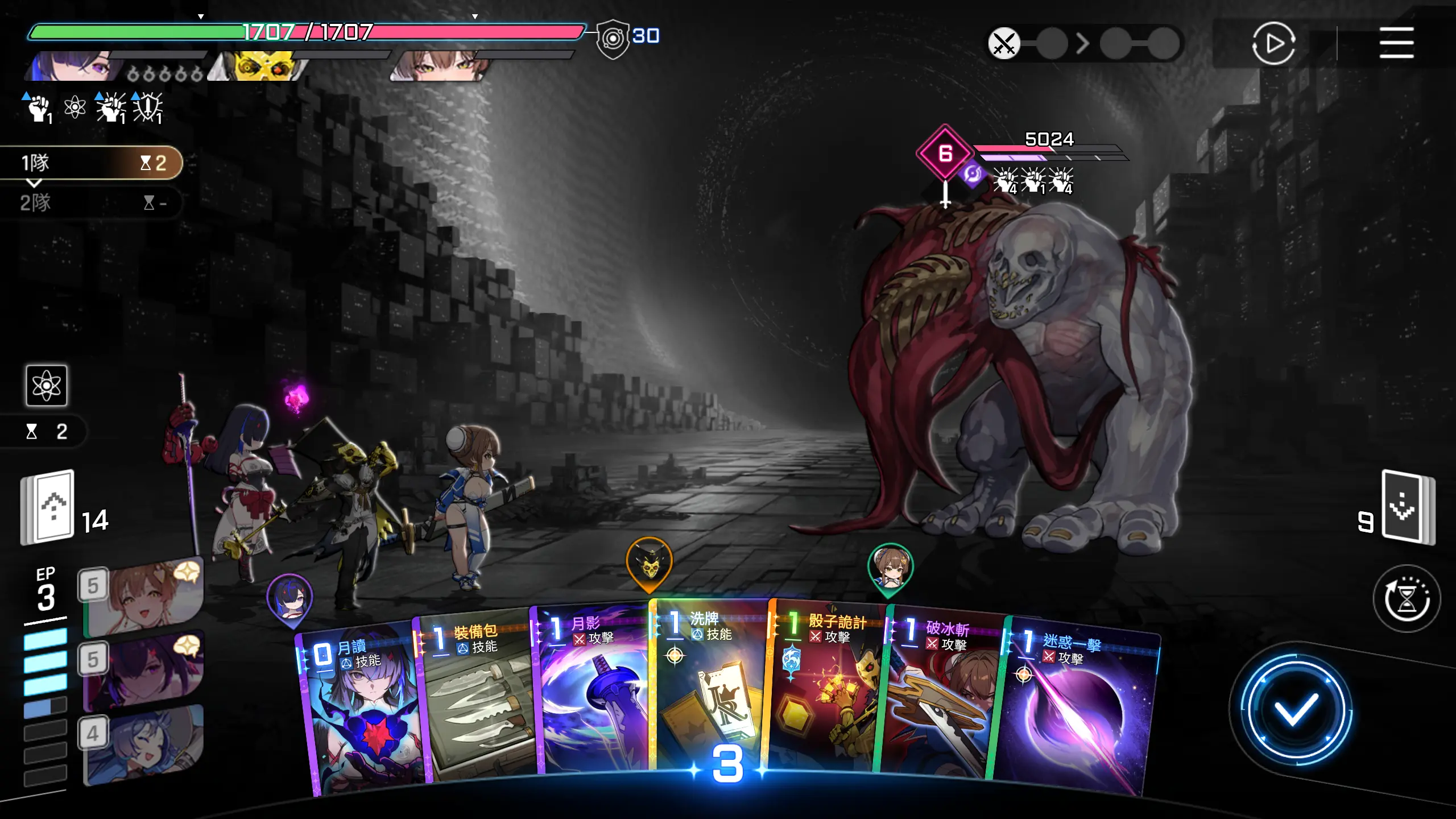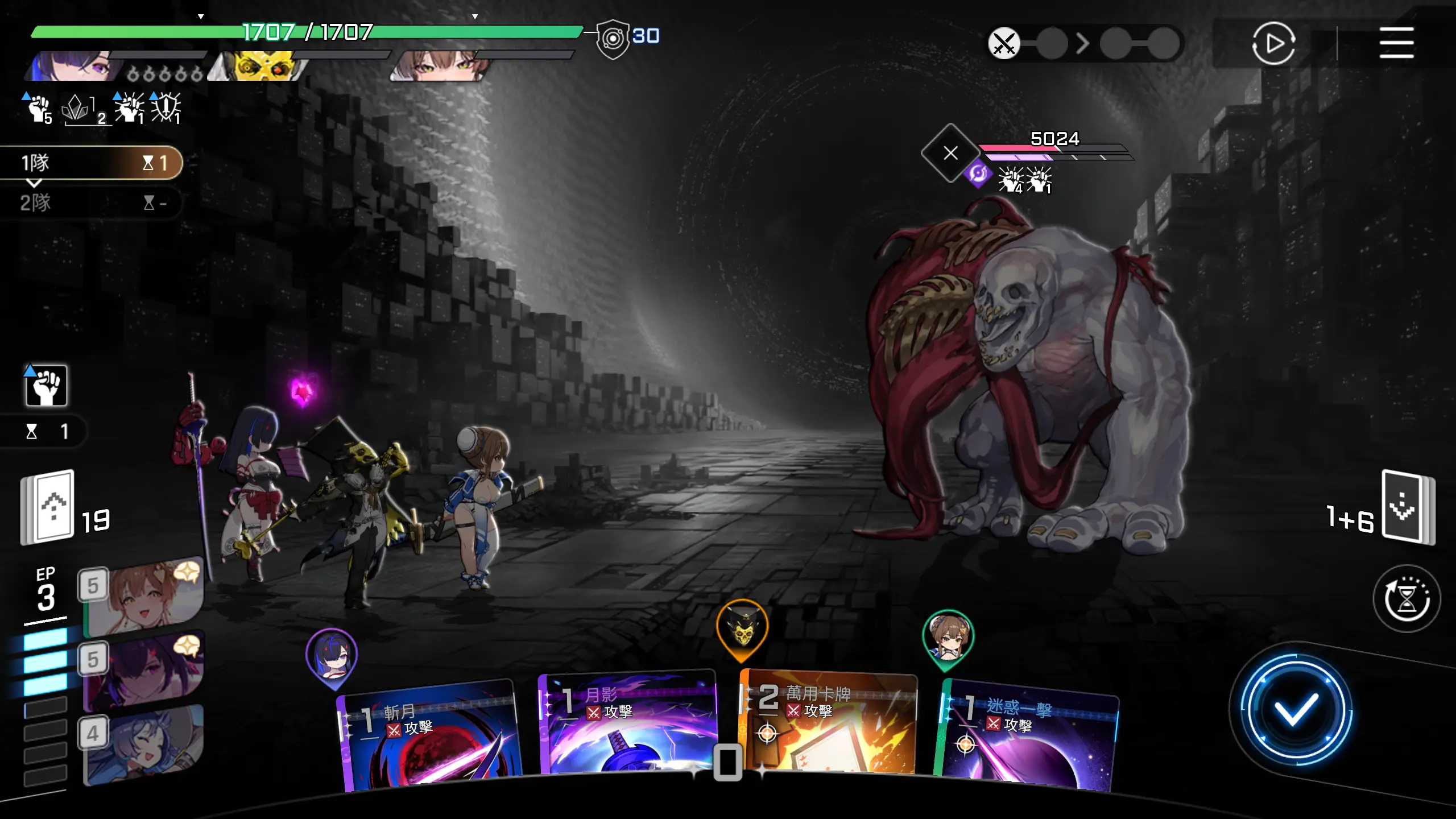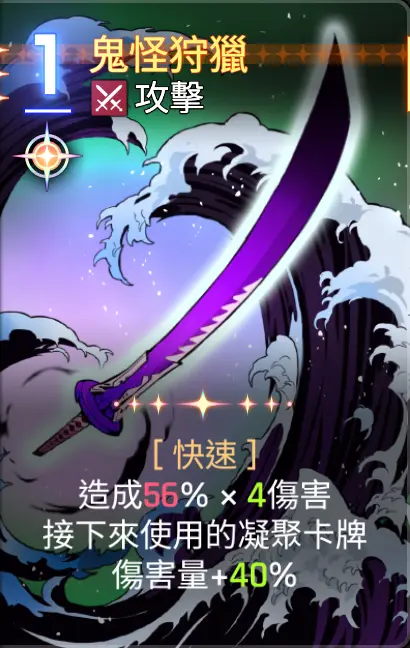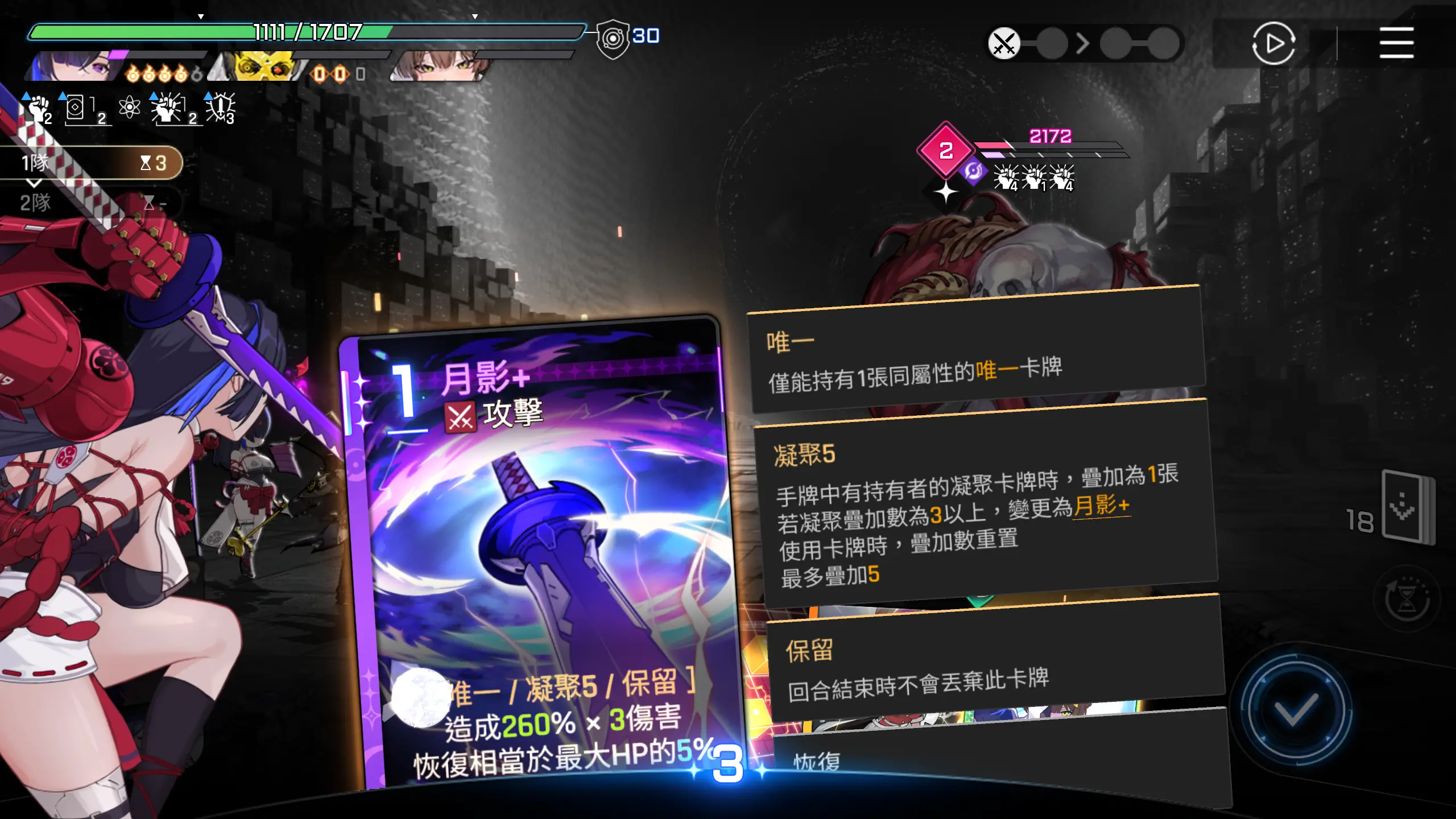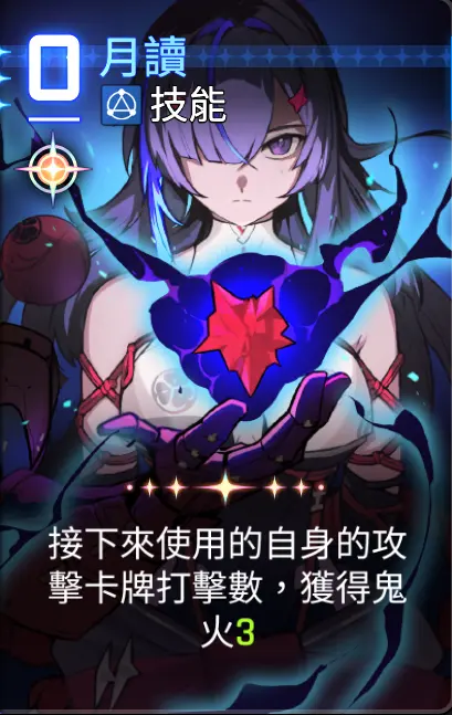 因为可以直接秒怪,所以优先把其他卡牌用一用,然后打出【月影+】,回合结束。
