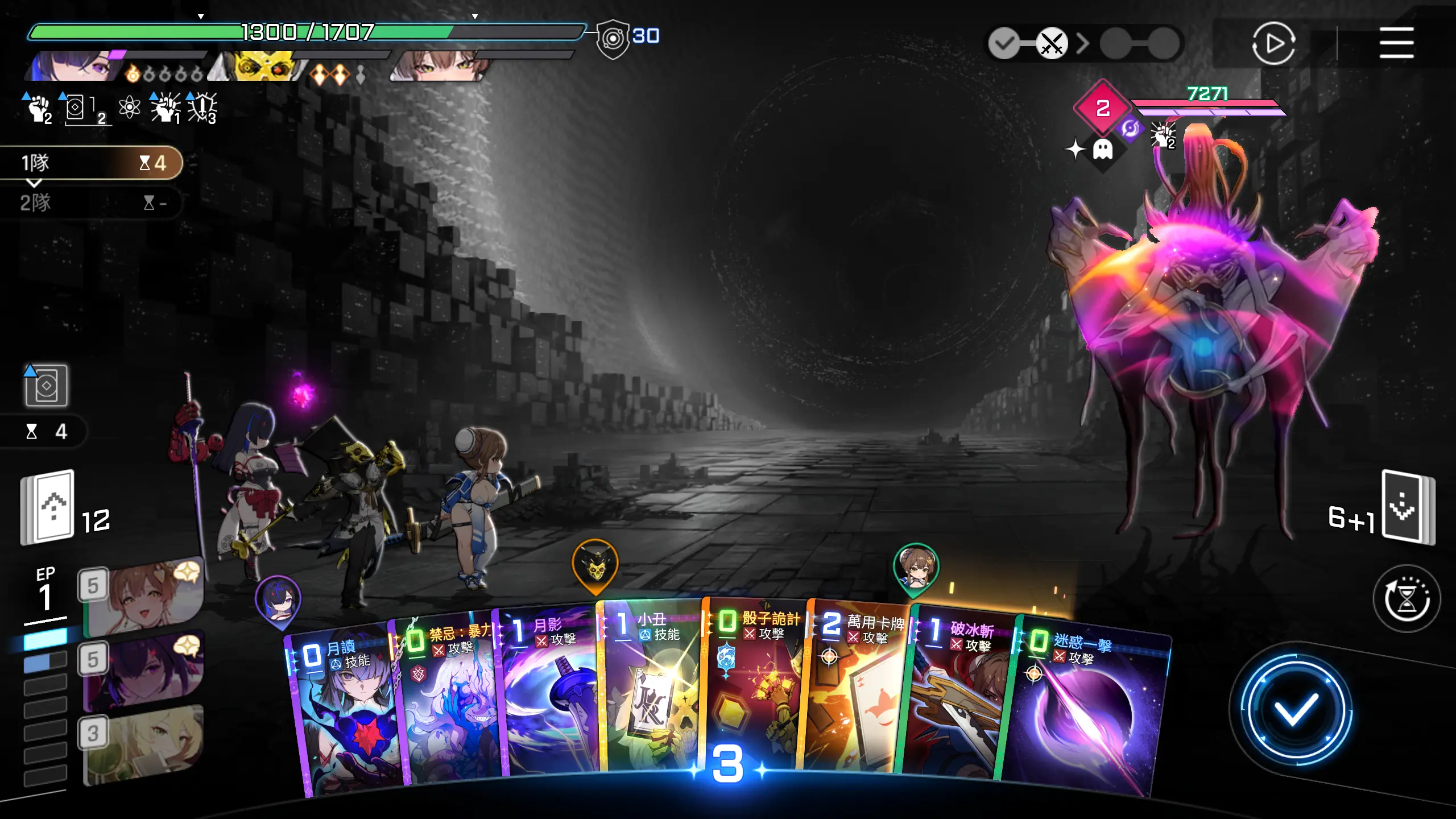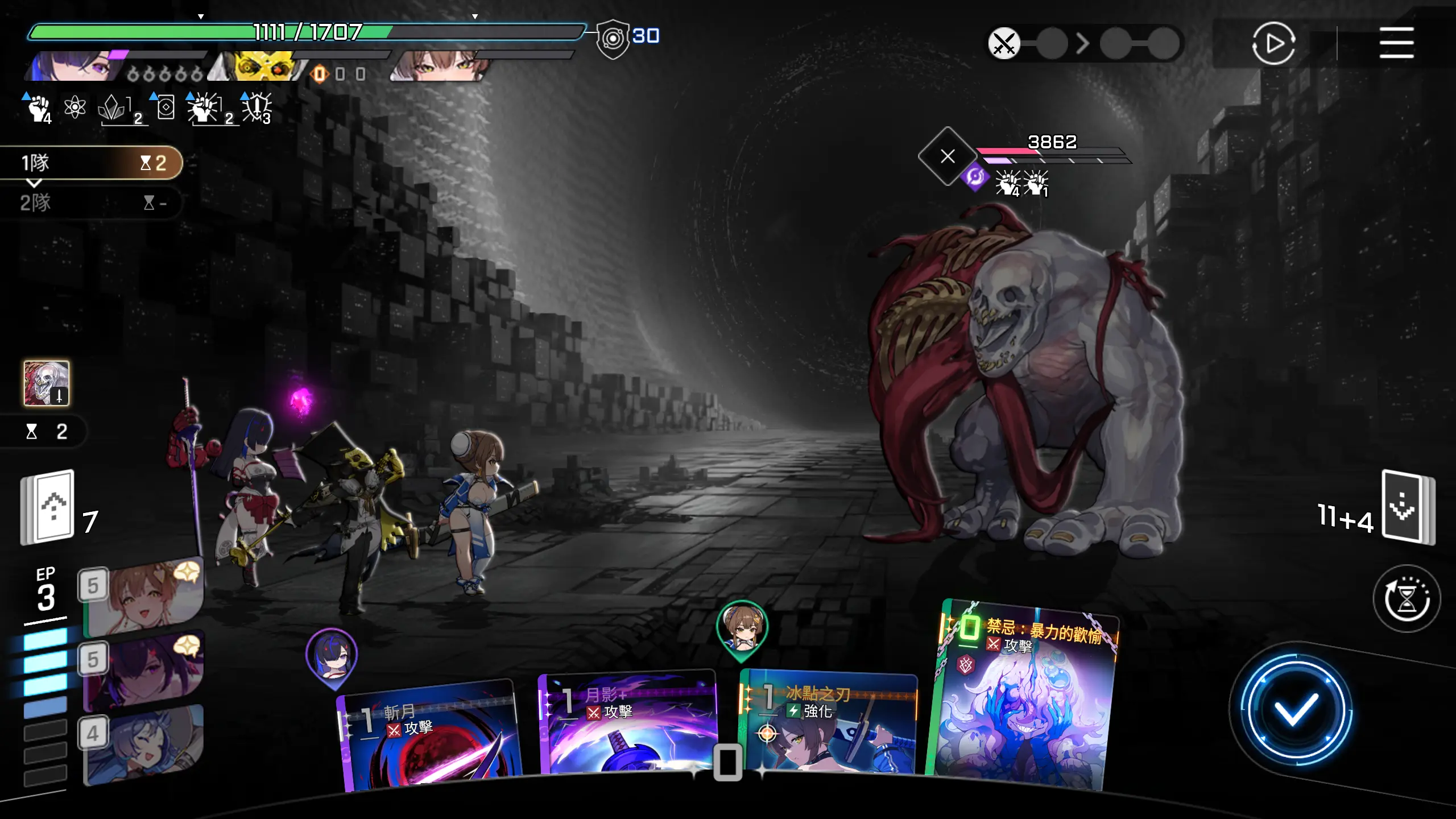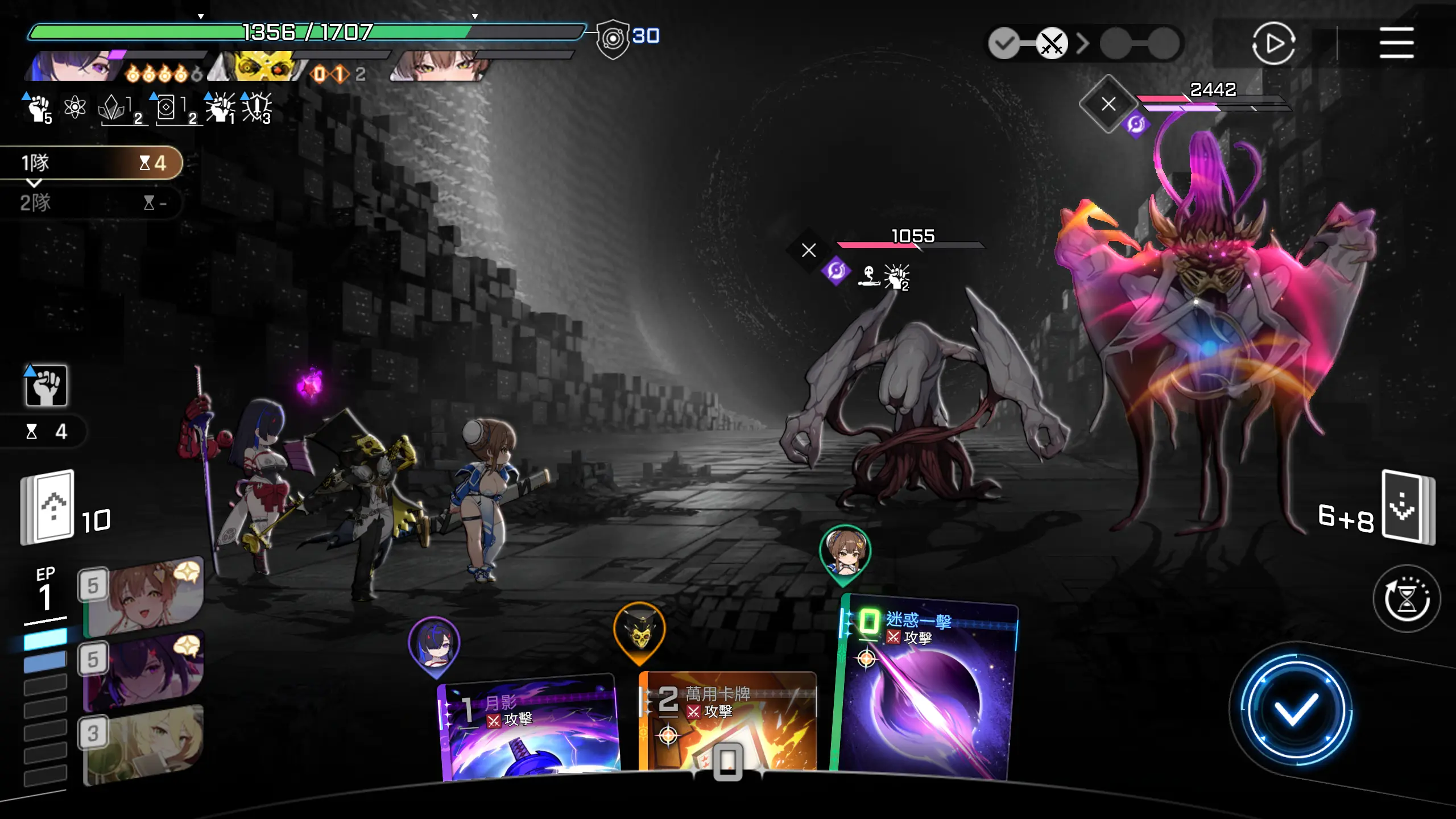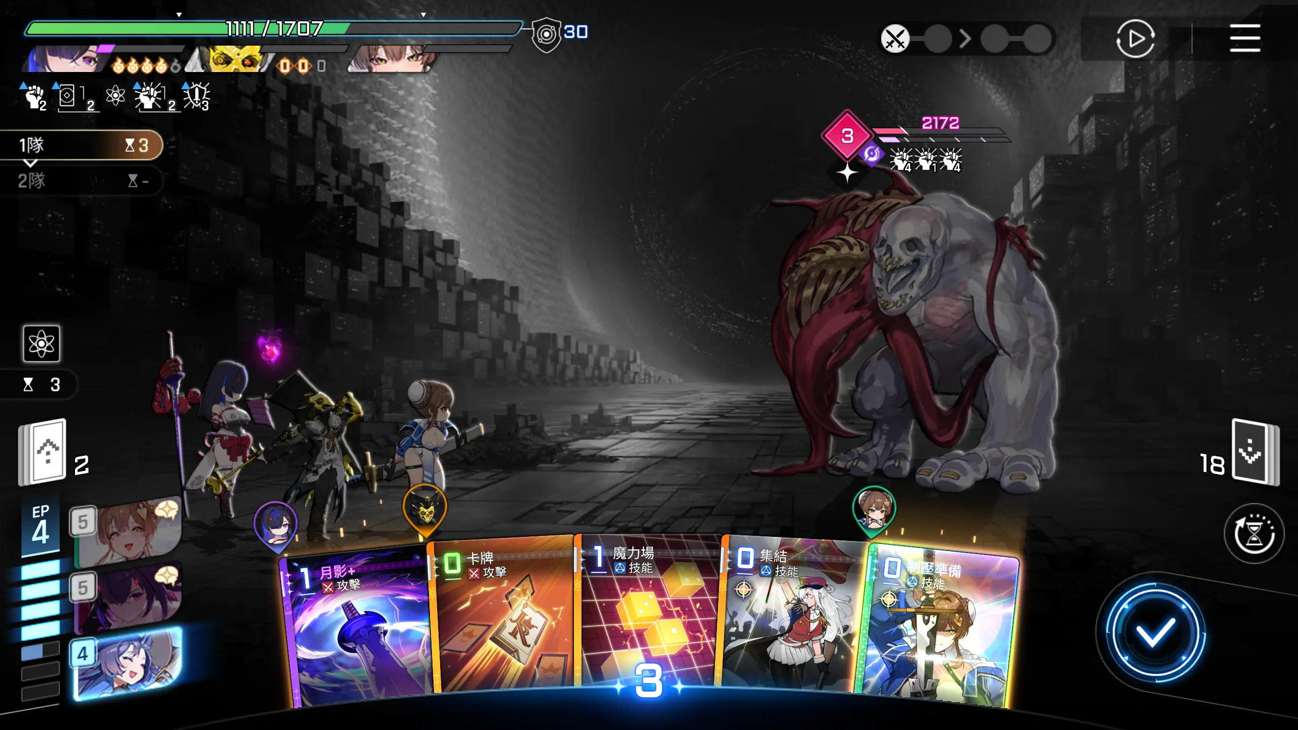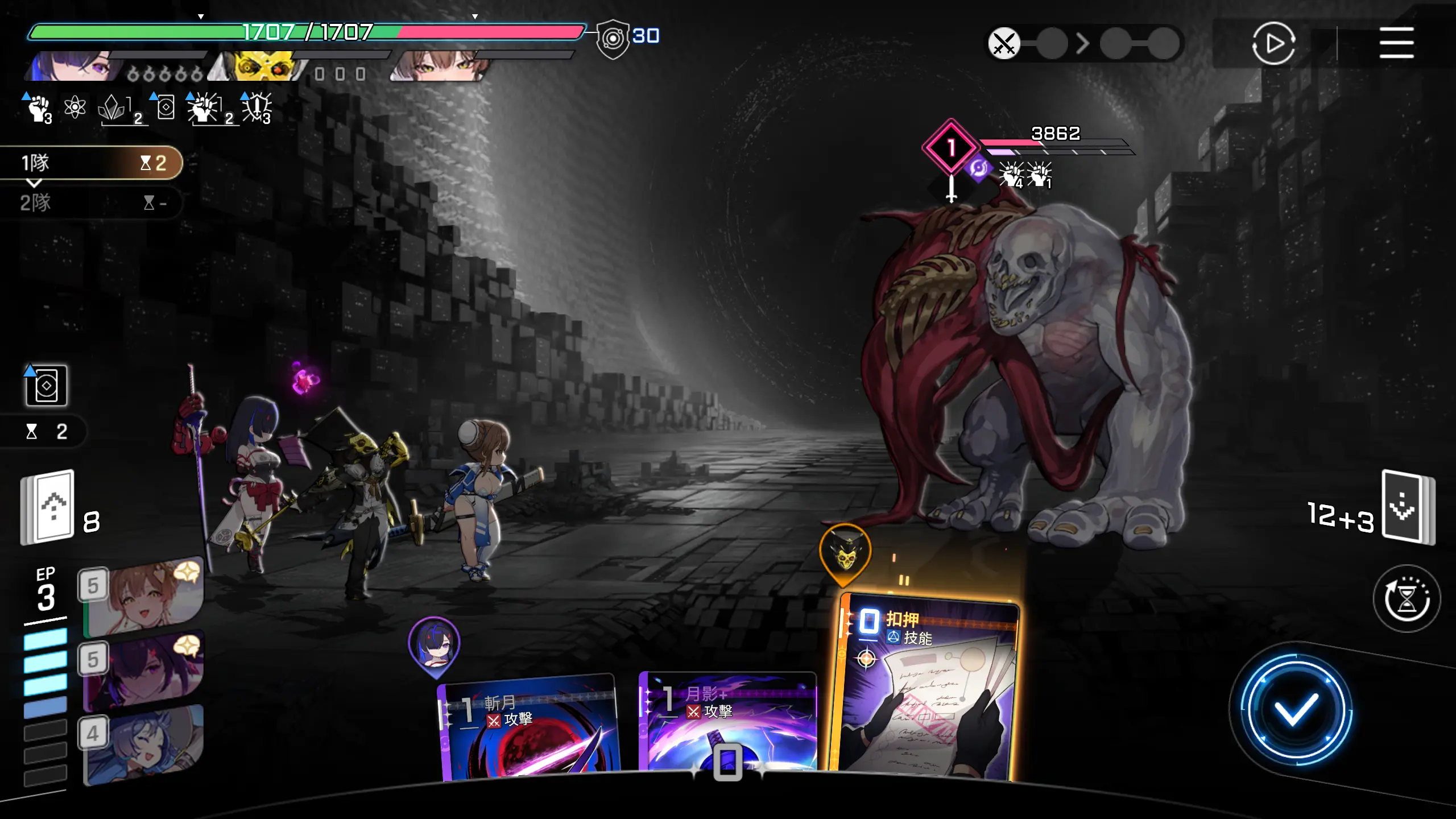 因为可以直接秒怪,所以优先把其他卡牌用一用,然后打出【月影+】,回合结束。