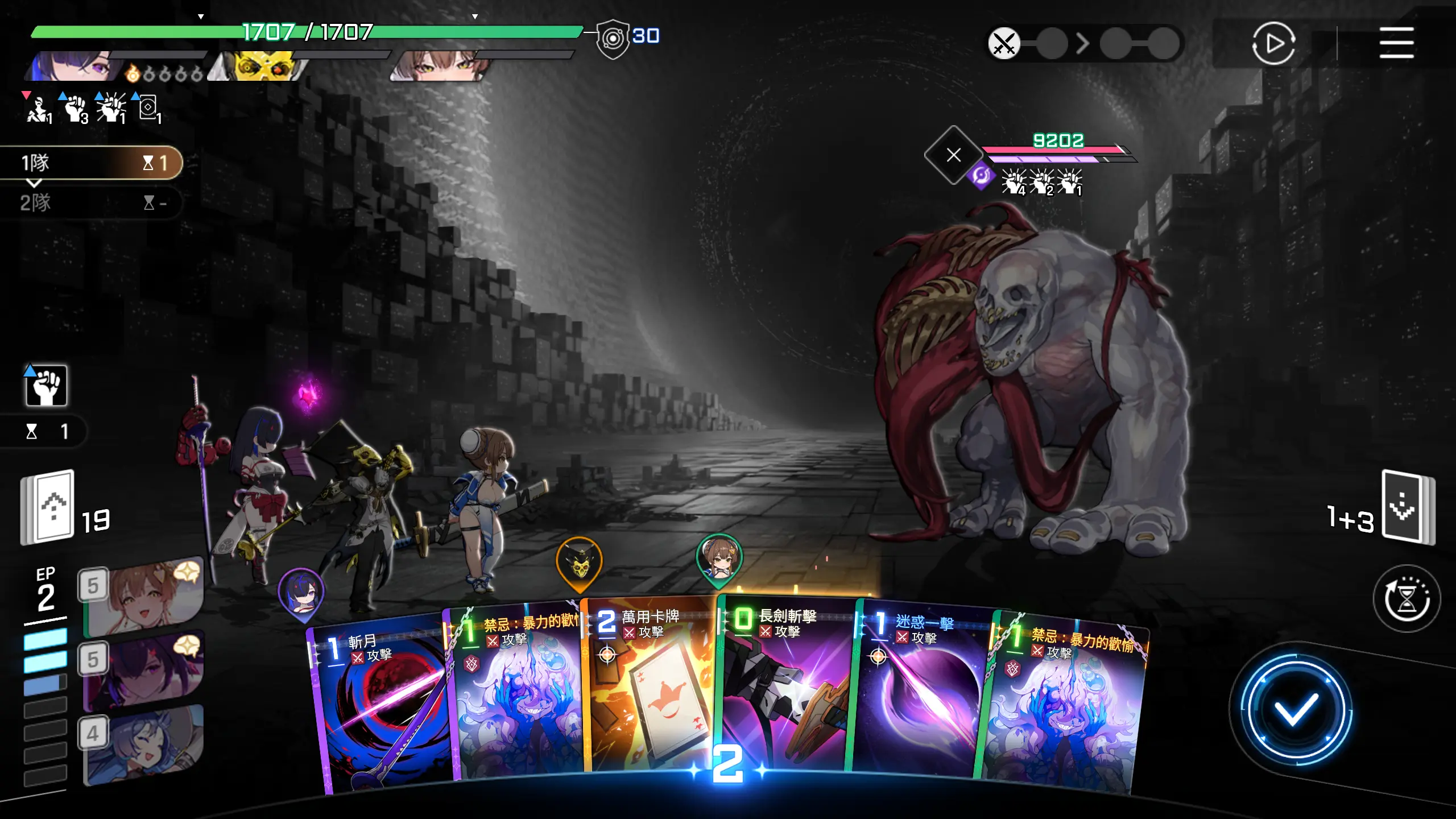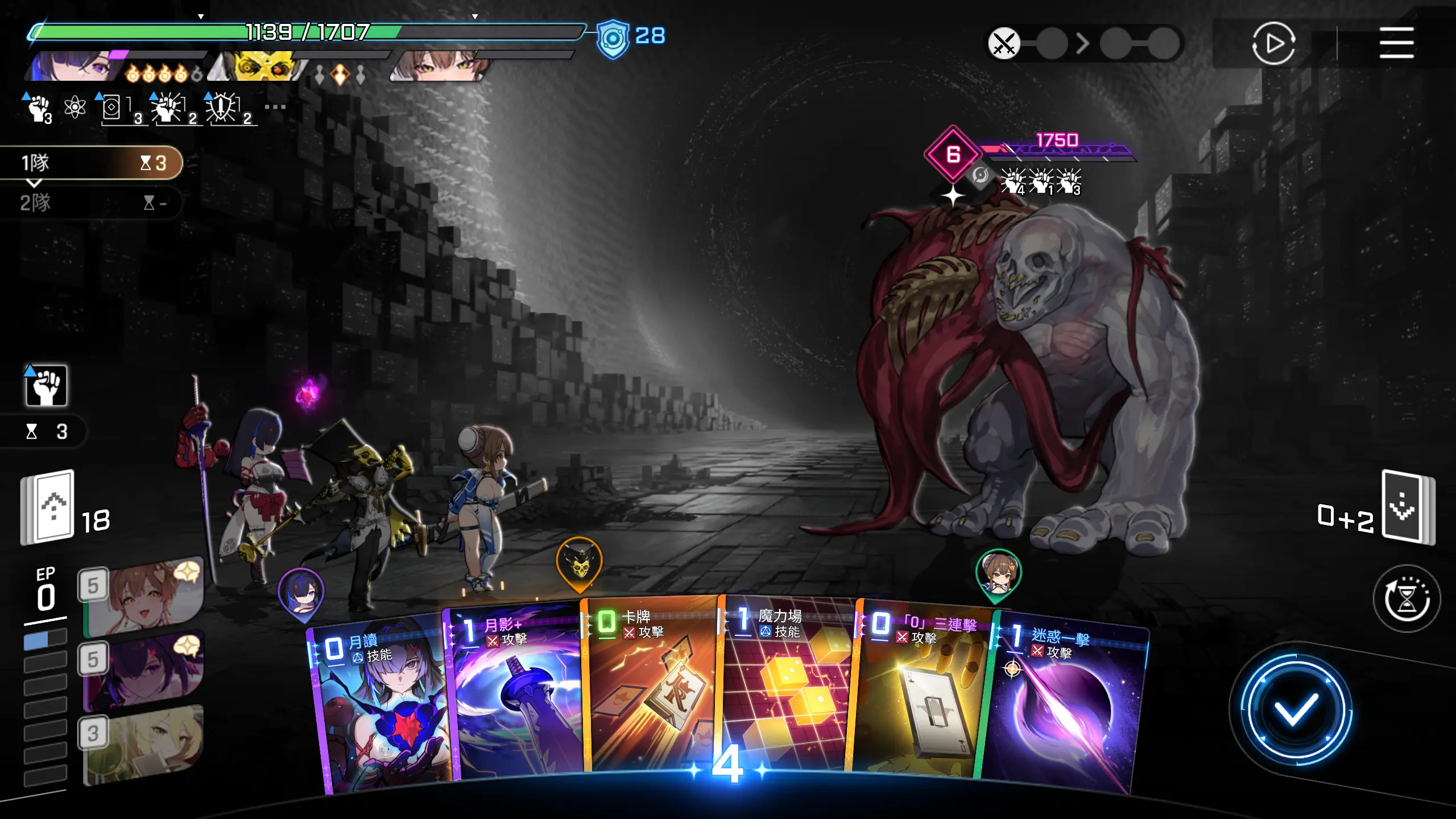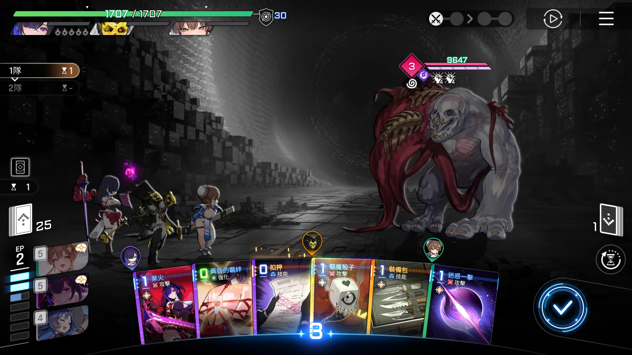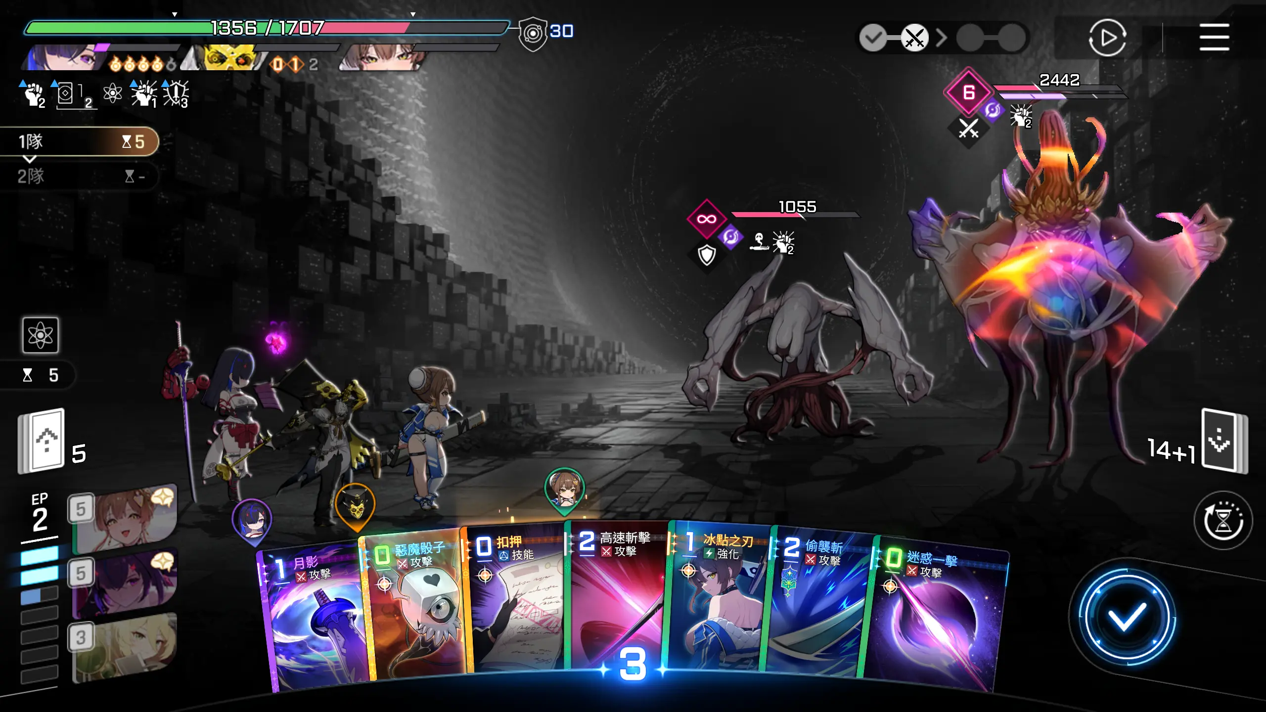 因为可以直接秒怪,所以优先把其他卡牌用一用,然后打出【月影+】,回合结束。