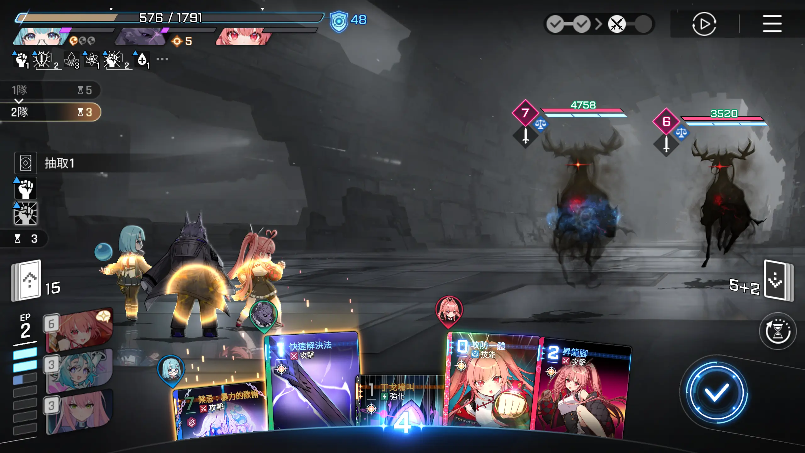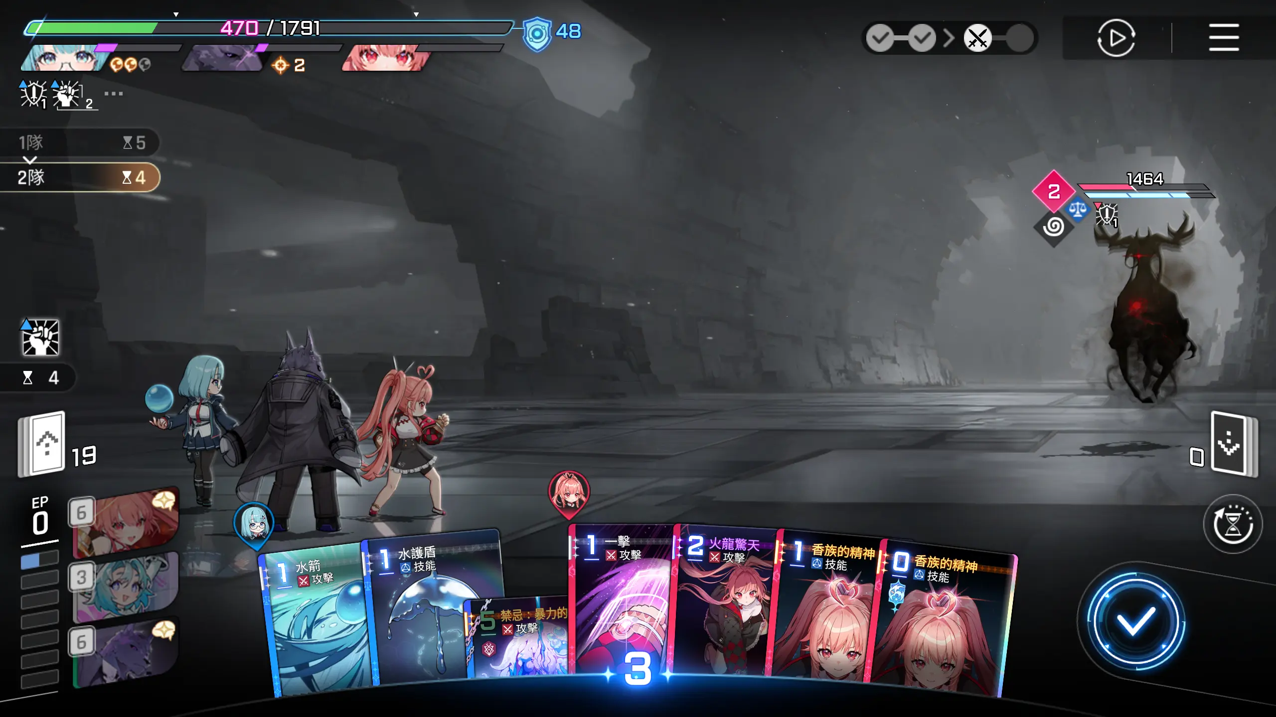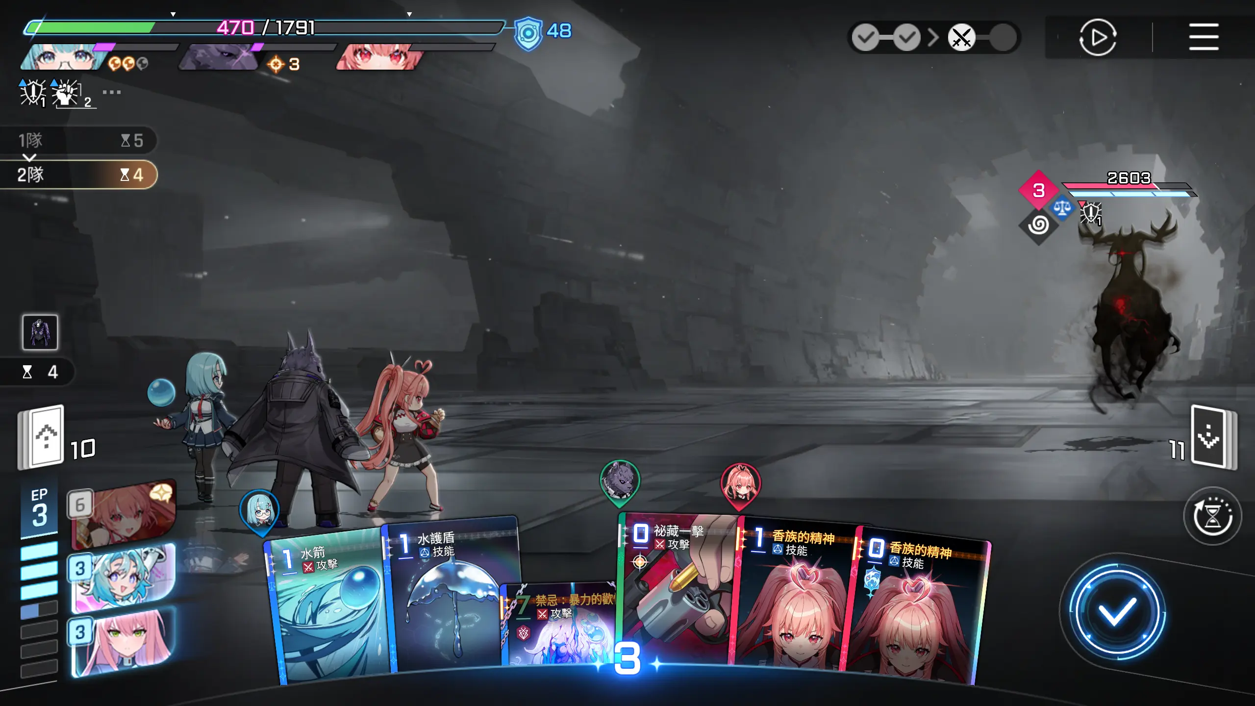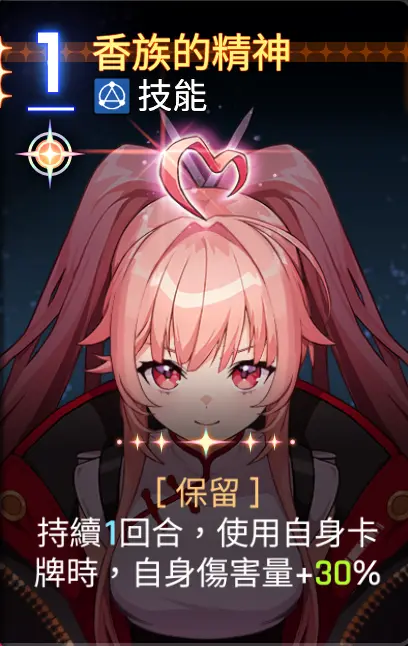 有惊无险,两张输出卡牌解决战斗,不需要使用香族的精神,这个怪会释放减士气的debuff,速战速决,回合结束。
