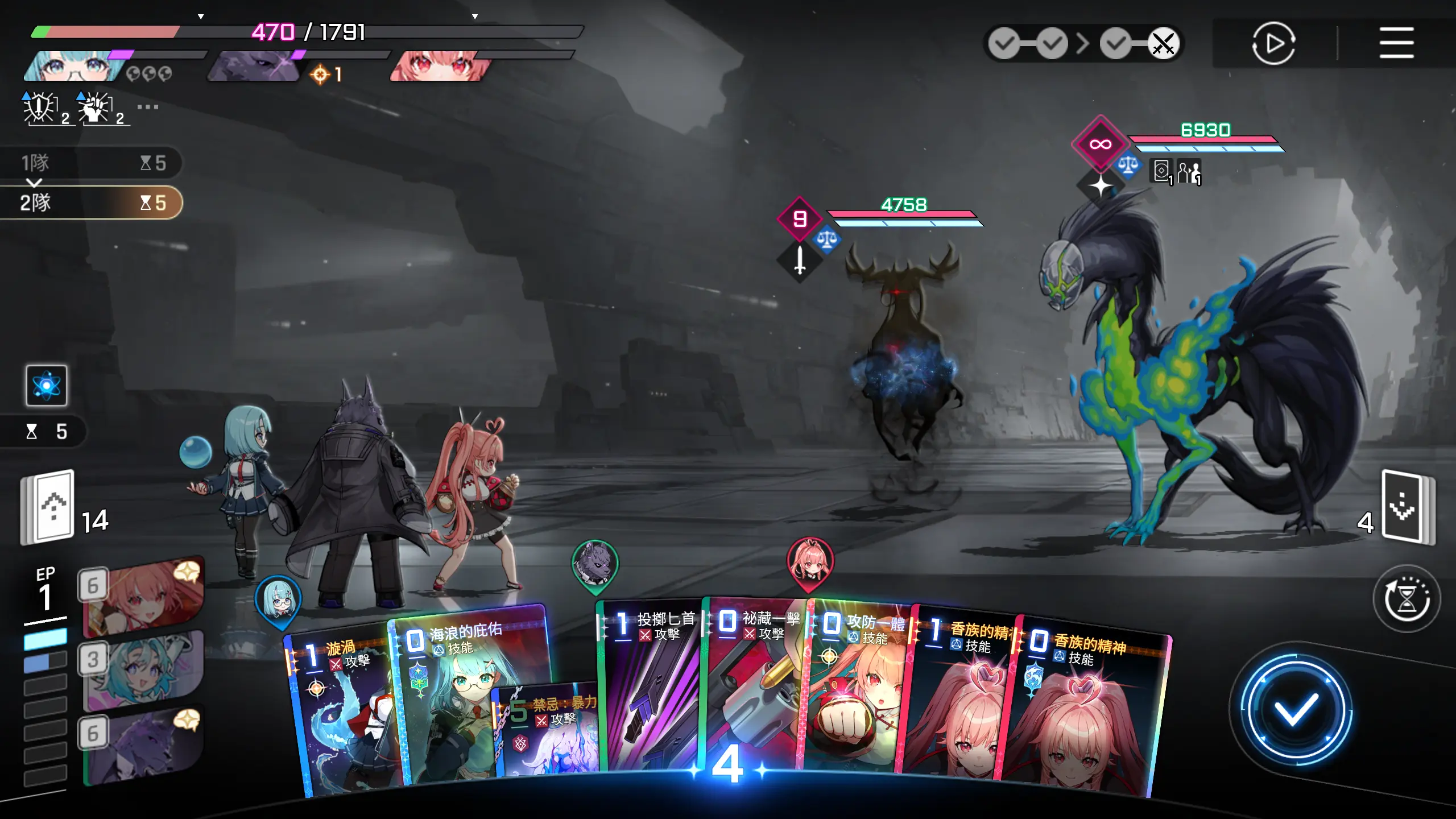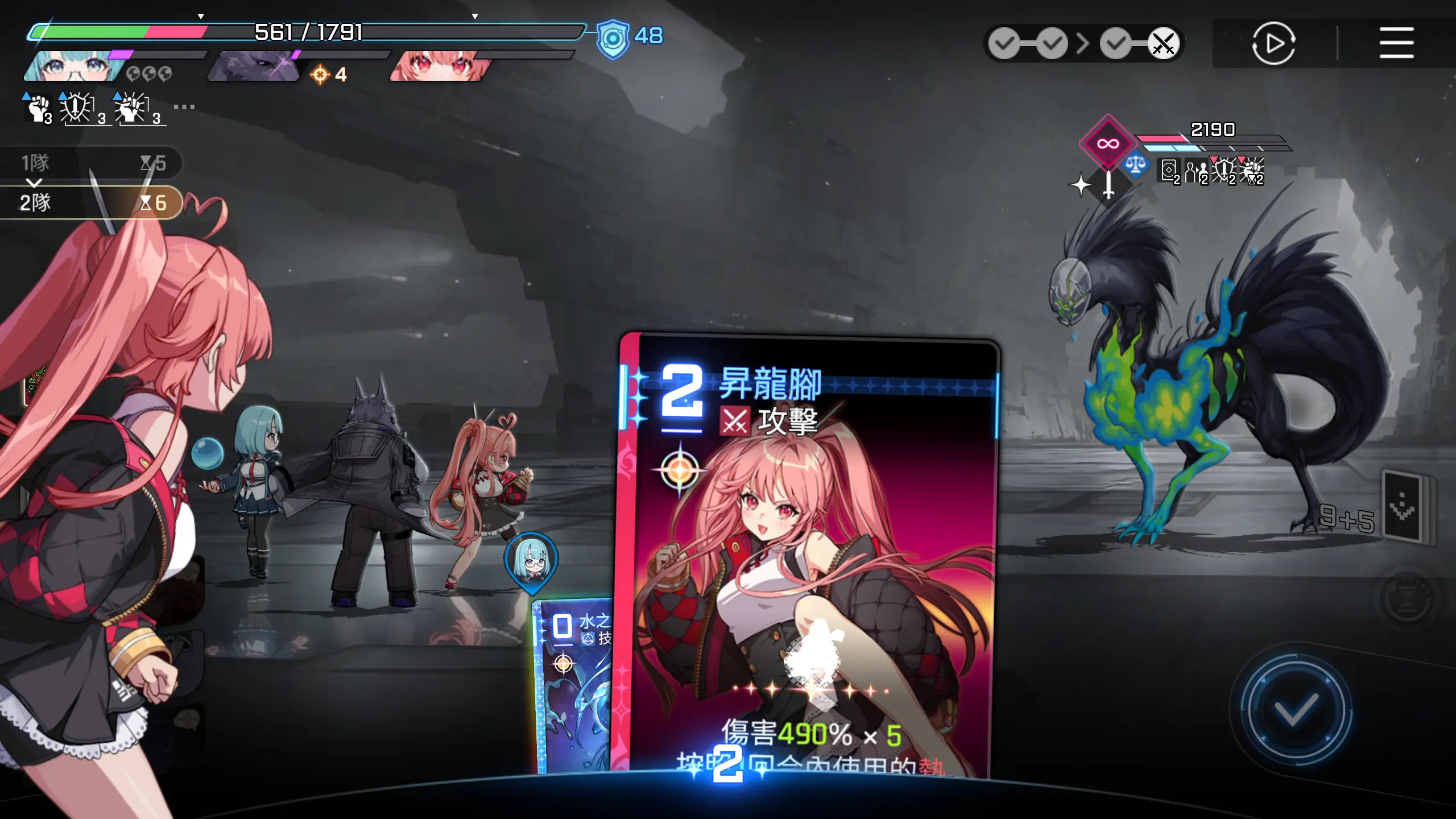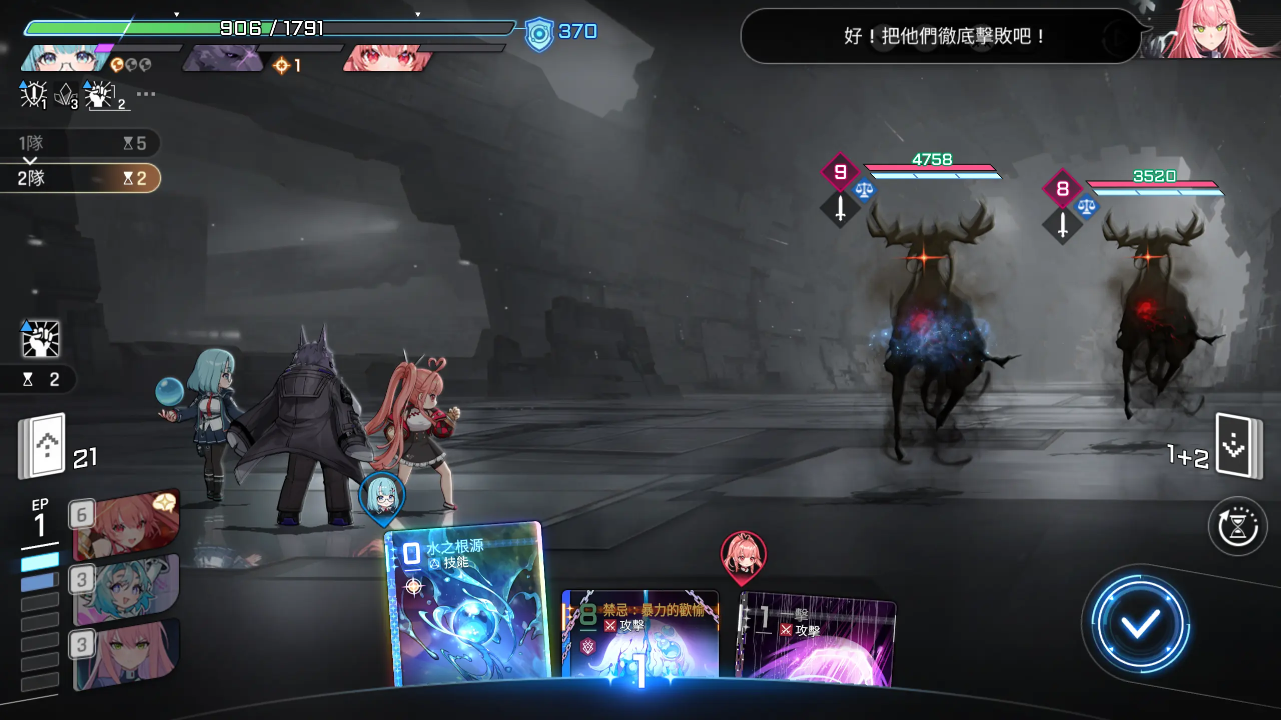 有惊无险,两张输出卡牌解决战斗,不需要使用香族的精神,这个怪会释放减士气的debuff,速战速决,回合结束。