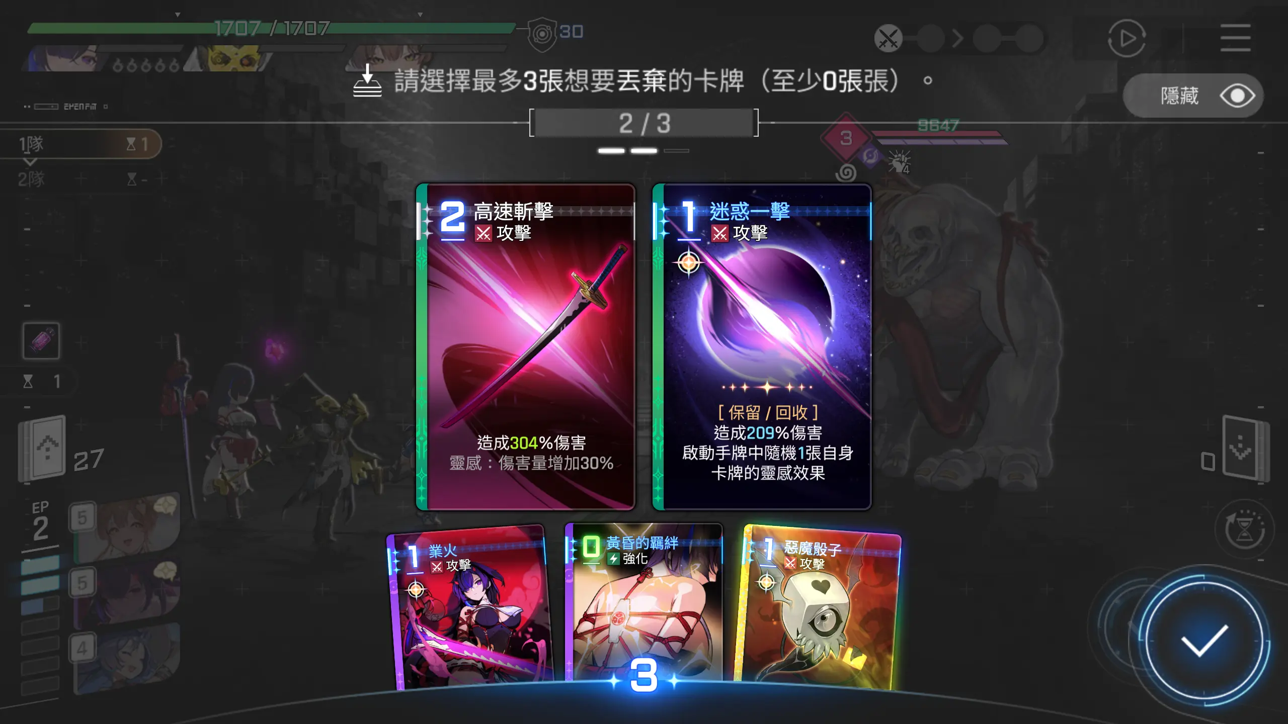 一堆攻击卡牌使用之后,还剩【秘藏一击】,因为保留伤害最大化,而且目前已经杀不死这个怪物了,就保留下回合使用。