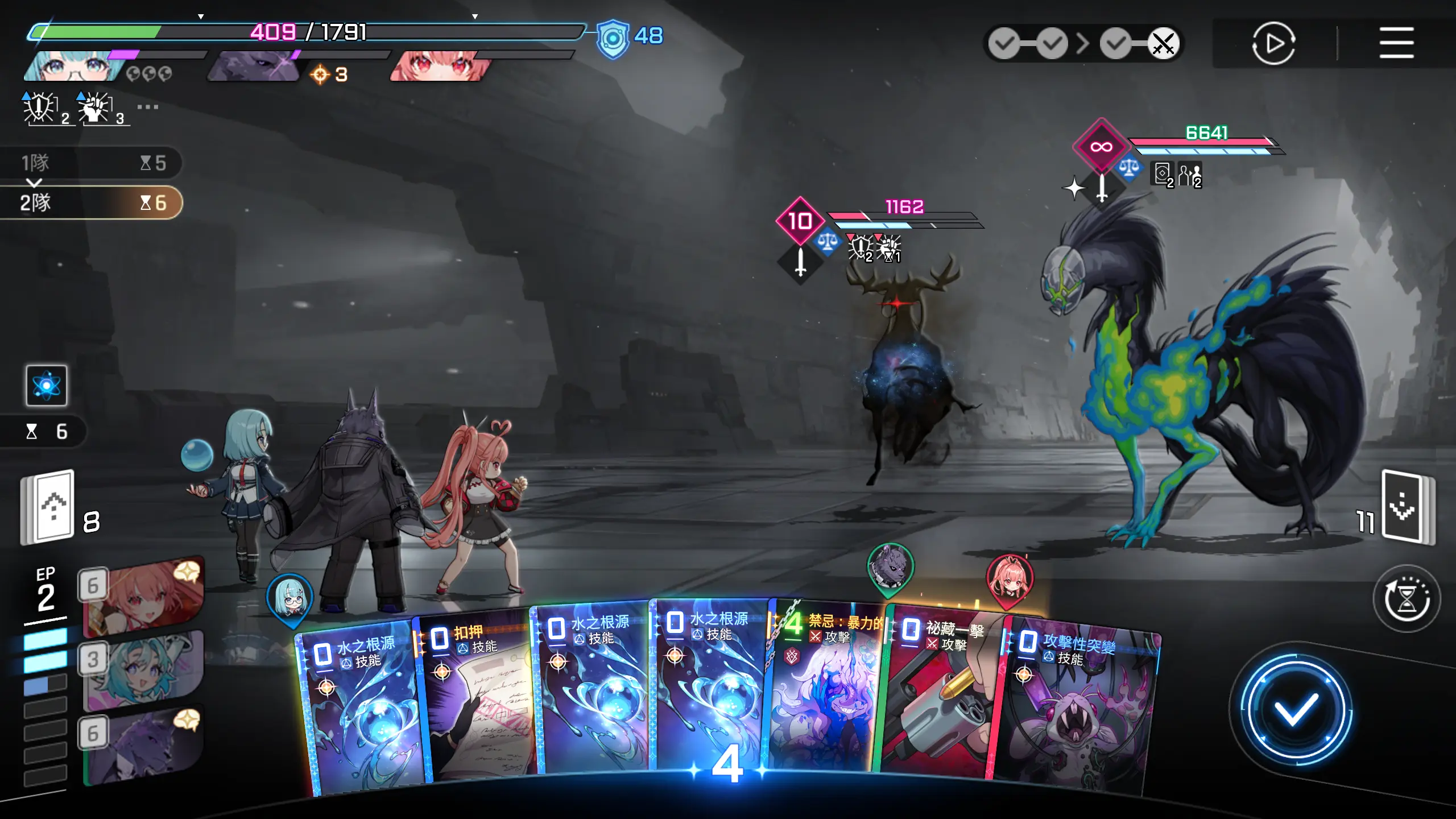 起手,开战卡牌较多,所以开局基本固定,而且AP点大概率会有富裕,可以像我一样使用雨果伙伴的技能,抽取一张强化卡牌并使用,