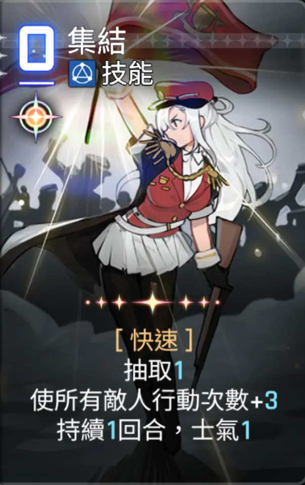 如果有条件,可以选择带中立词条1回合士气2的效果,比这个效果更好一些,神闪减费更佳。