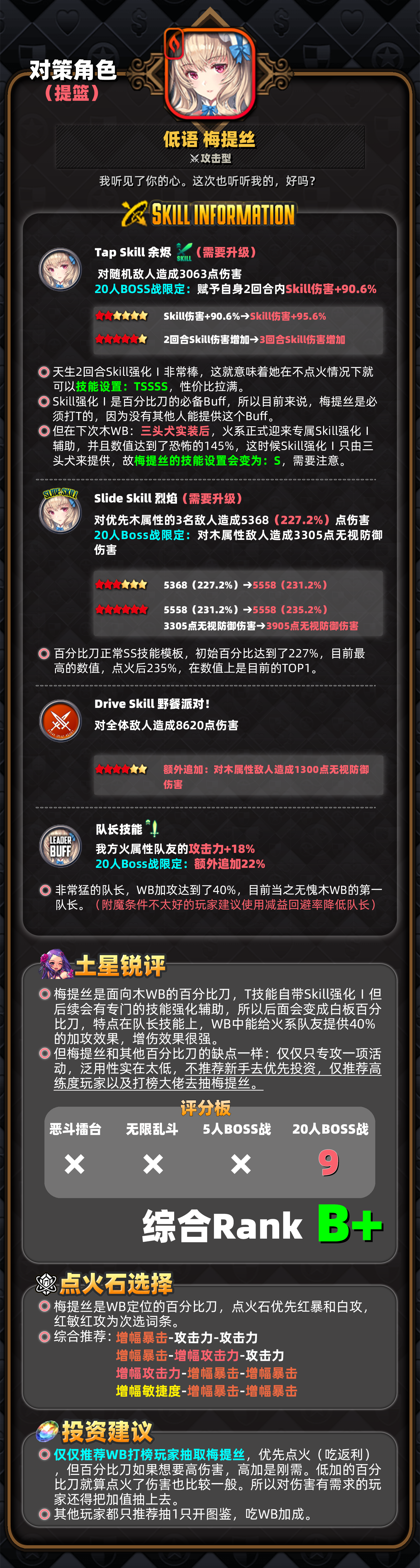 造成498(3063)伤害。对象为世界王时,增加自身Skill伤害+65(90.6)%,持续2回合