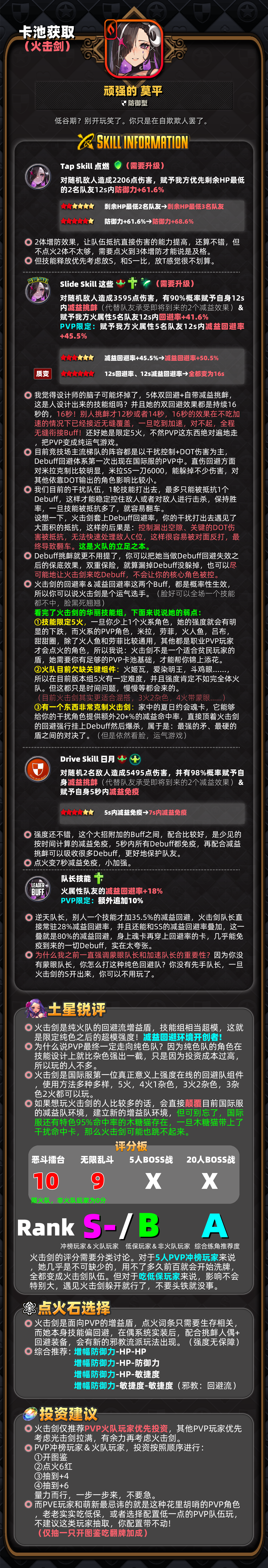 对1名随机敌人造成3695伤害,有90%的机率赋予自身减益挑衅(代替盟友承受2个减益),持续12秒,及5名火属性盟友迥避率+41.6%, 持续16秒。PvP中, 5名火属性盟友的减益回避率+50.5%,持续16秒