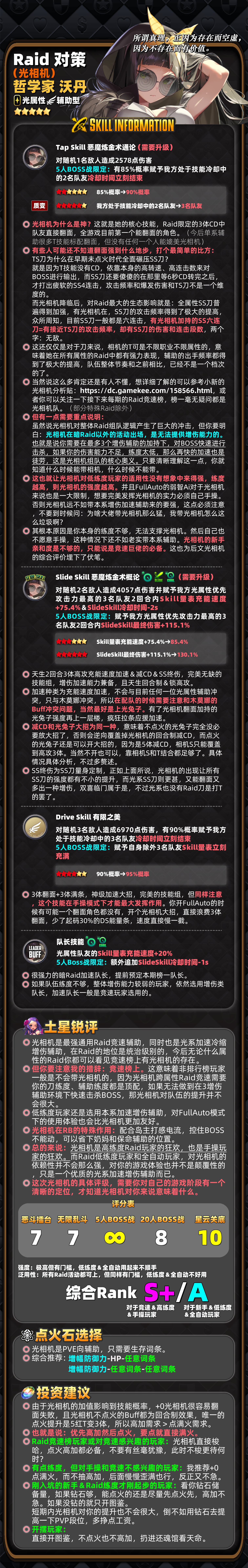 赋予光属性盟友Skill量表充能速度+20%(在副本中,光属性盟友Skill冷却时间-1秒)