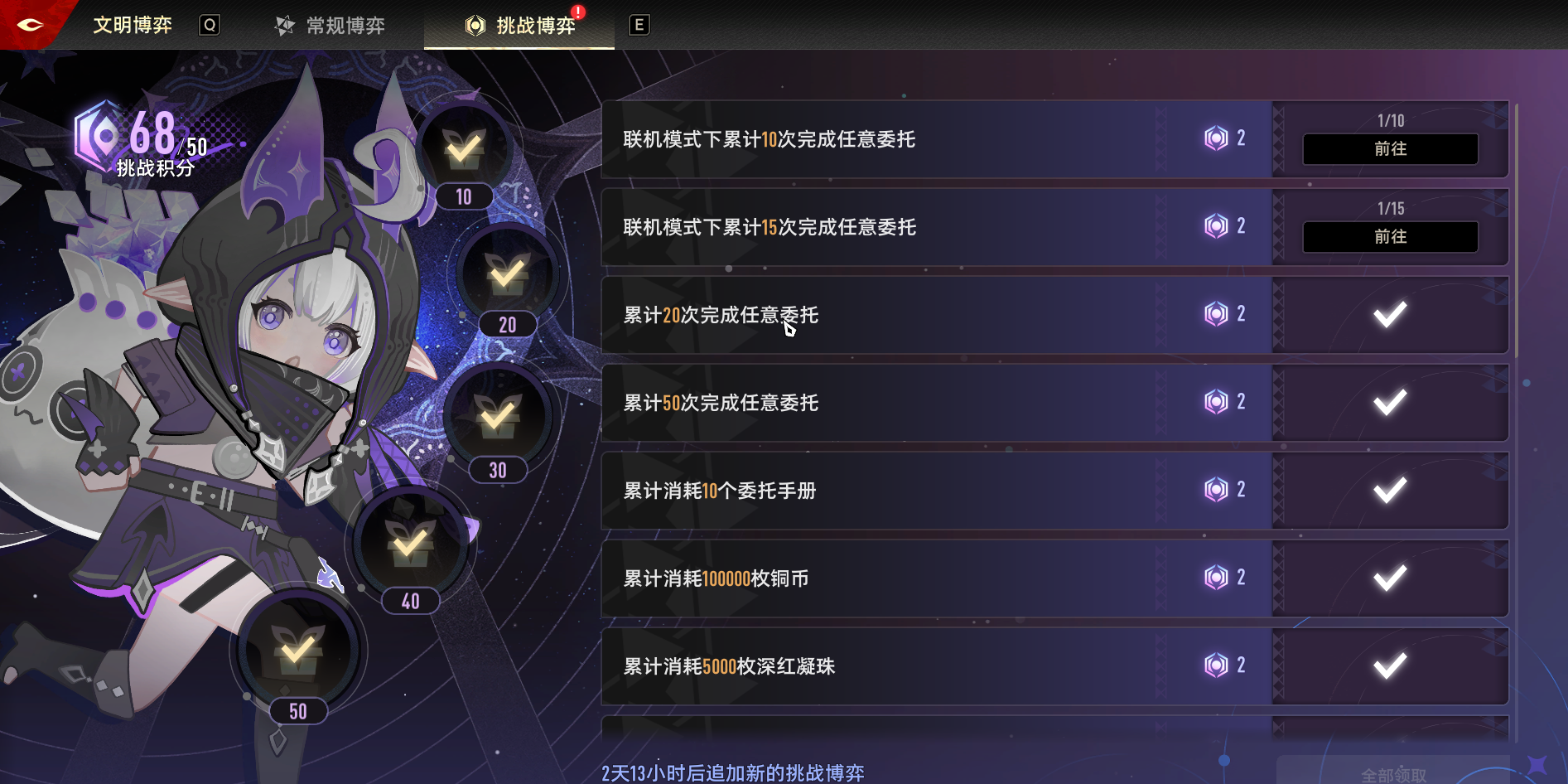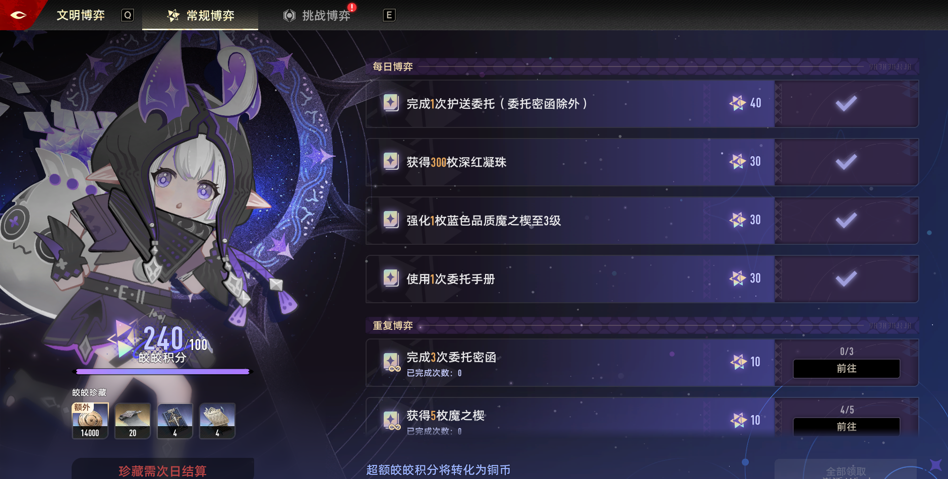 常规博弈的任务分为每日博弈和重复博弈,两者都可以获得积分,拿满100点就可以基本完成,积分的奖励会在第二天结算。后续每多拿积分在第二天结算时就只会多拿一点铜币。综合来说这个铜币收益很低,不过顺手就能做所以无所谓。总体也没太好的东西,主要就是顺手拿20密函碎片。