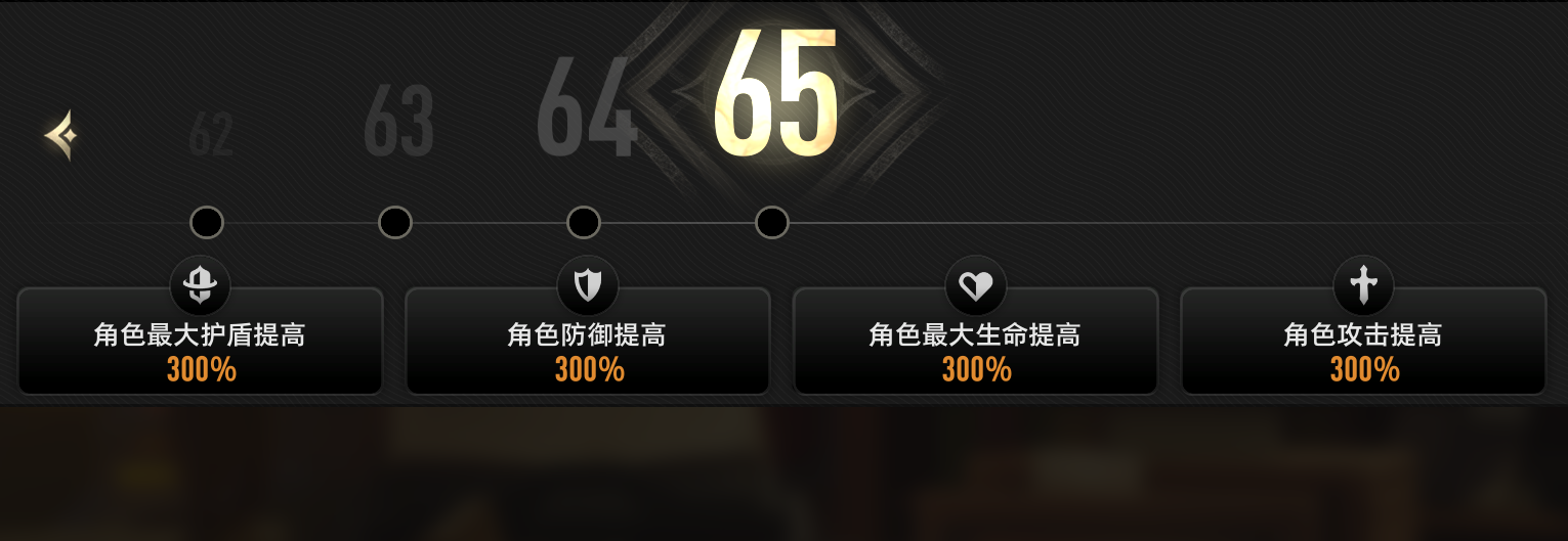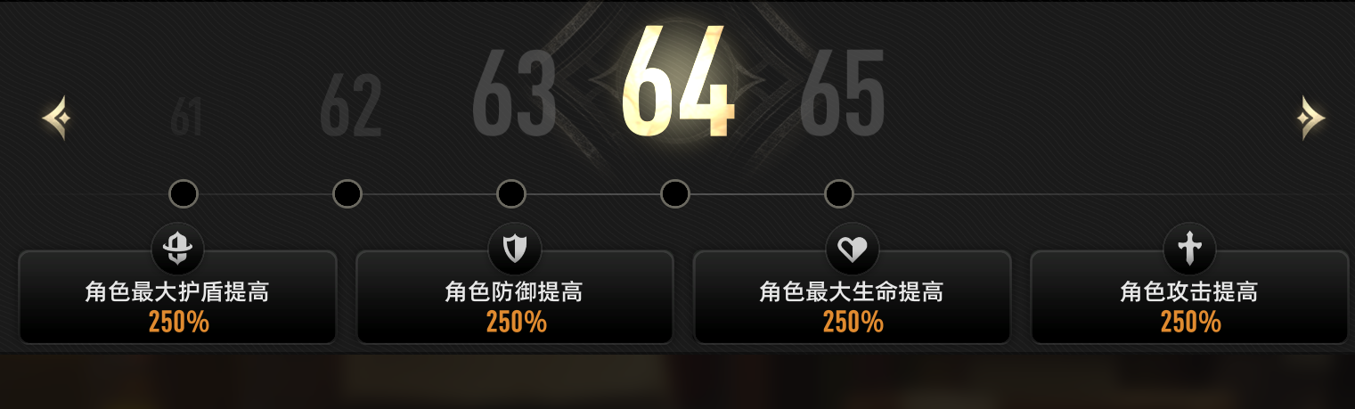 历练等级给的加成也很多。有4种属性,护盾,防御,生命,攻击。历练15级开始45级解锁完全部
