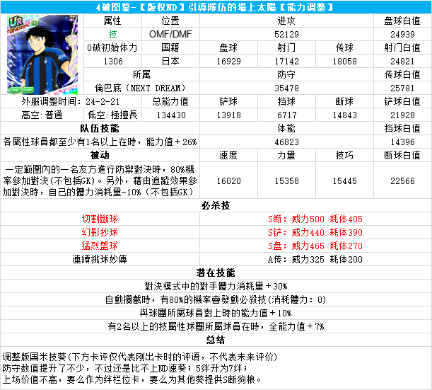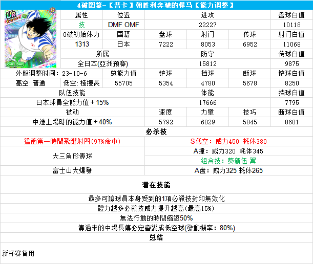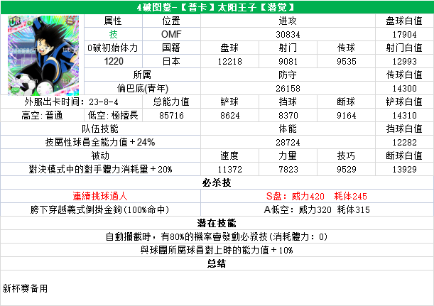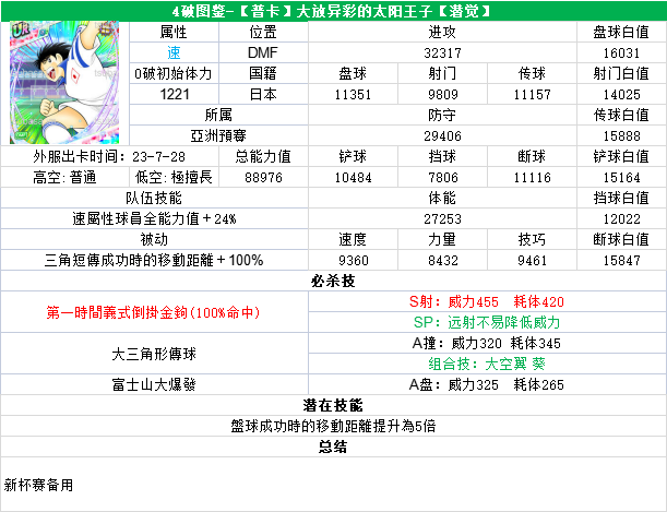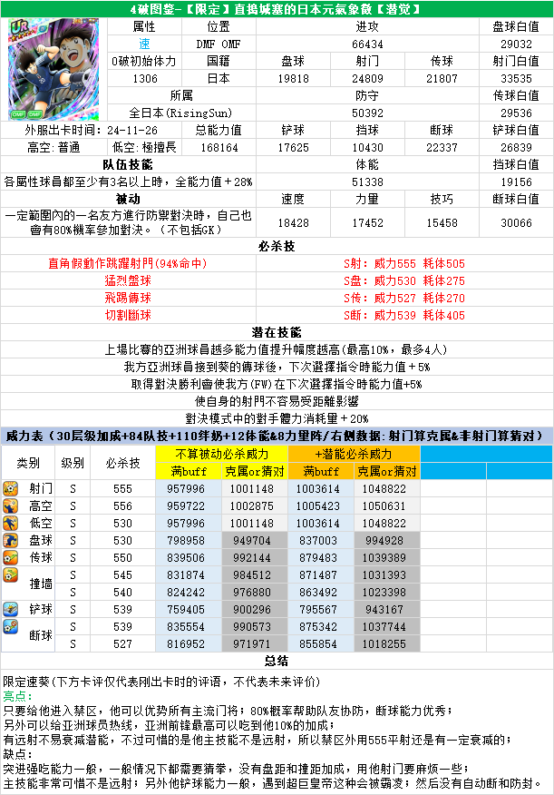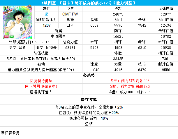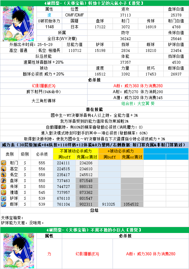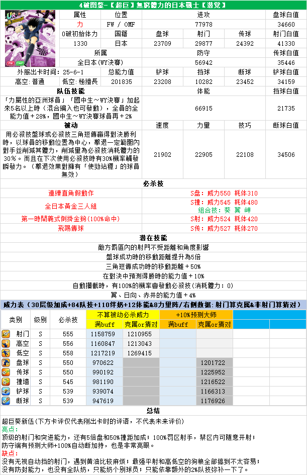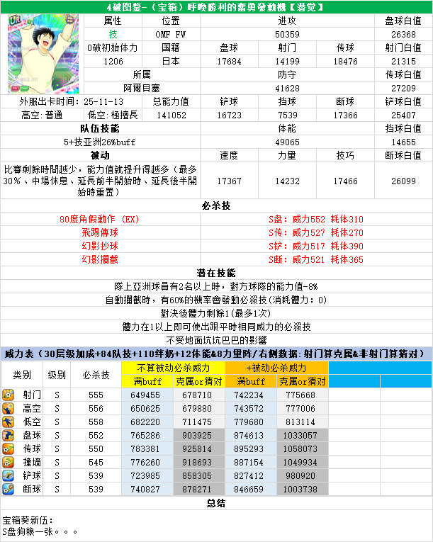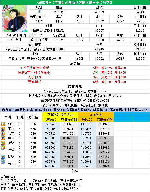 葵新伍葵新伍所有技能卡:葵新伍技能库:(点击链接可跳转im数据网,查看射门命中率等信息)https://tsubasa.im/global/zh/character/skills/?id=20葵新伍传授P点技能库:(点击链接可跳转im数据网,查看射门命中率等信息)https://tsubasa.im/global/zh/character/inherit_cost/?id=20