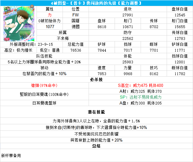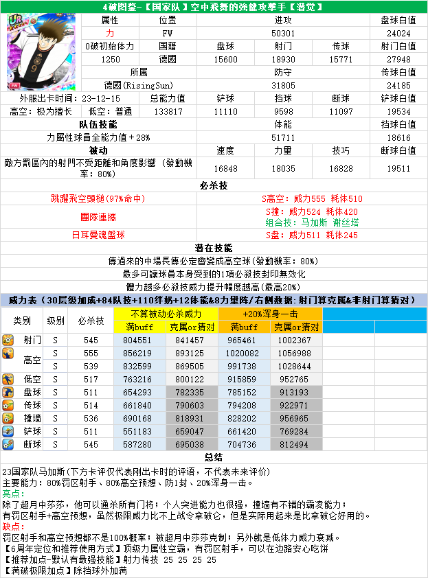曼弗雷德·马格斯(马加斯)马加斯所有技能卡:马加斯技能库(点击链接可跳转im数据网,查看射门命中率等信息)https://tsubasa.im/global/zh/character/skills/?id=206马加斯传授P点技能库(点击链接可跳转im数据网,查看射门命中率等信息)https://tsubasa.im/global/zh/character/inherit_cost/?id=206