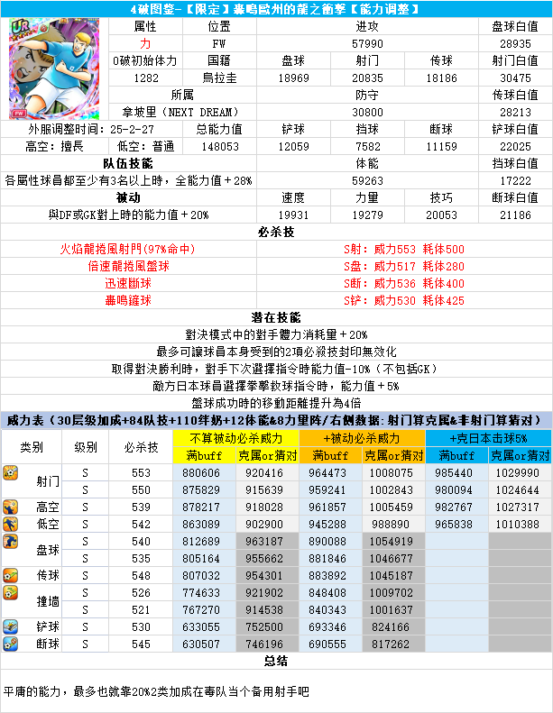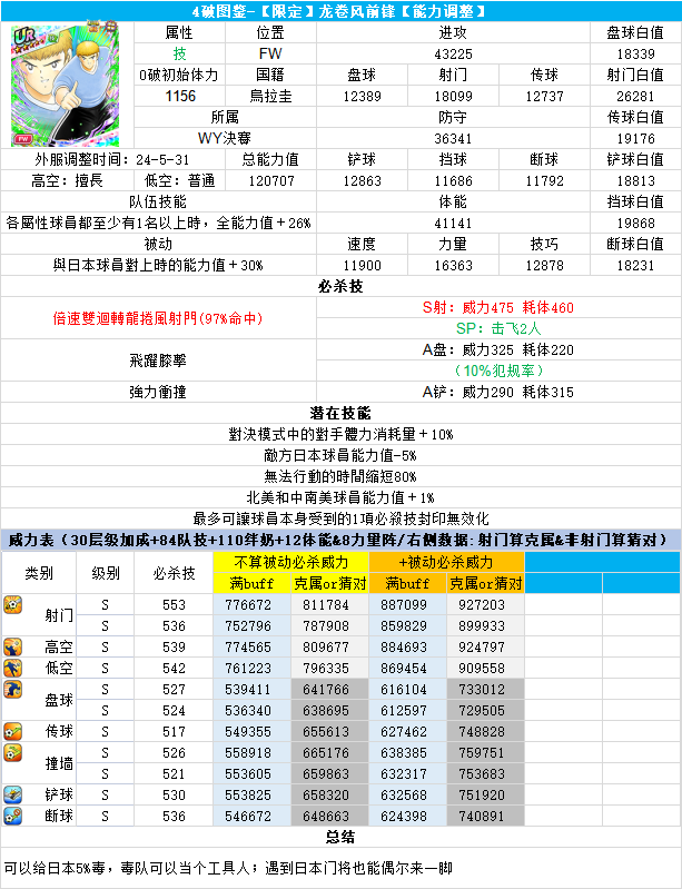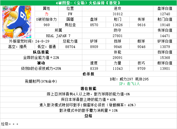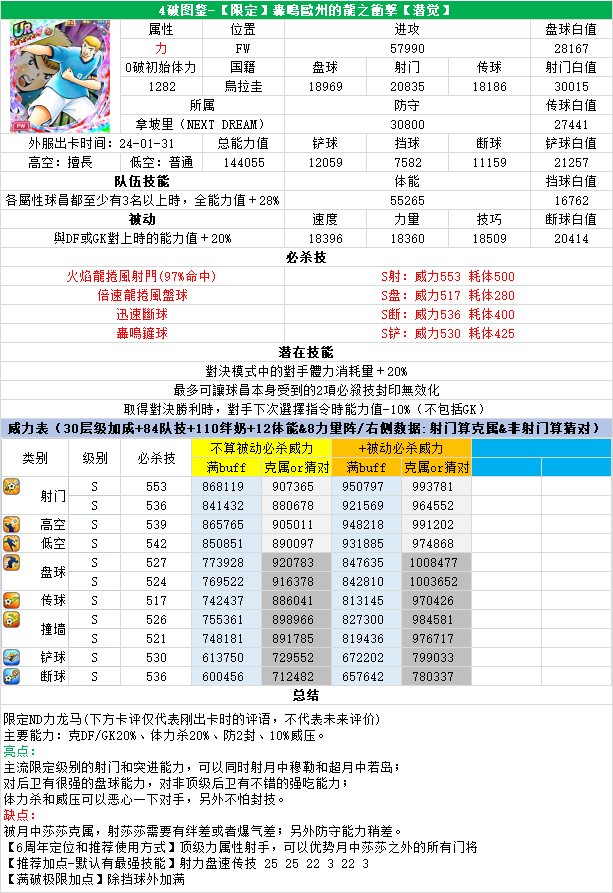 火野龙马龙马所有技能卡:龙马技能库(点击链接可跳转im数据网,查看射门命中率等信息)https://tsubasa.im/global/zh/character/skills/?id=281龙马传授P点技能库(点击链接可跳转im数据网,查看射门命中率等信息)https://tsubasa.im/global/zh/character/inherit_cost/?id=281