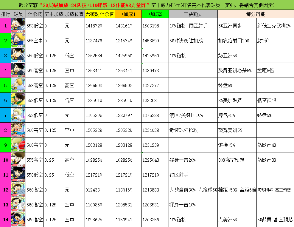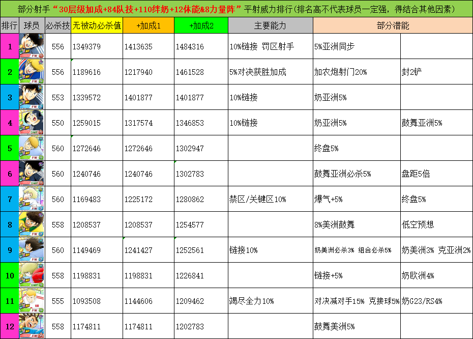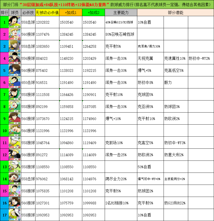门将&射手必杀威力排行PS:必杀排名高不代表球员一定强,一定要结合被动和潜能的触发条件一起判断。这里使用外服4破数据:30层级加成+84队技+110绊奶+12体能&8力量阵: 门将必杀威力排行(手机浏览可点击图片放大,查看更清晰) 门将必杀排行 球员平地必杀威力排行(手机浏览可点击图片放大,查看更清晰) 球员平射必杀排行