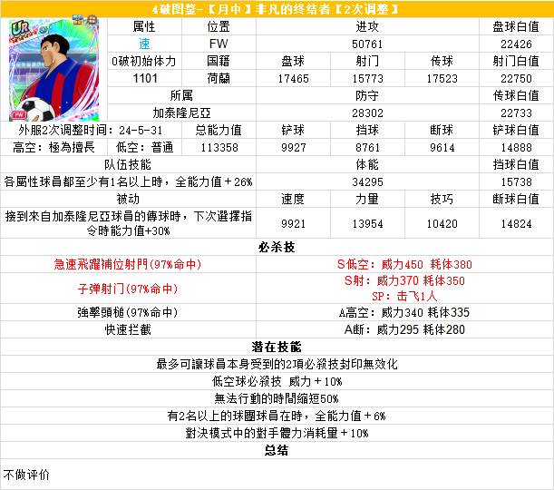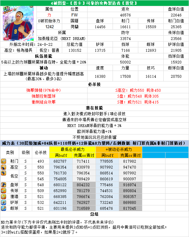 莱卡尔莱卡尔所有技能卡:莱卡尔技能库(点击链接可跳转im数据网,查看射门命中率等信息)https://tsubasa.im/global/zh/character/skills/?id=415莱卡尔传授P点技能库(点击链接可跳转im数据网,查看射门命中率等信息)https://tsubasa.im/global/zh/character/inherit_cost/?id=415