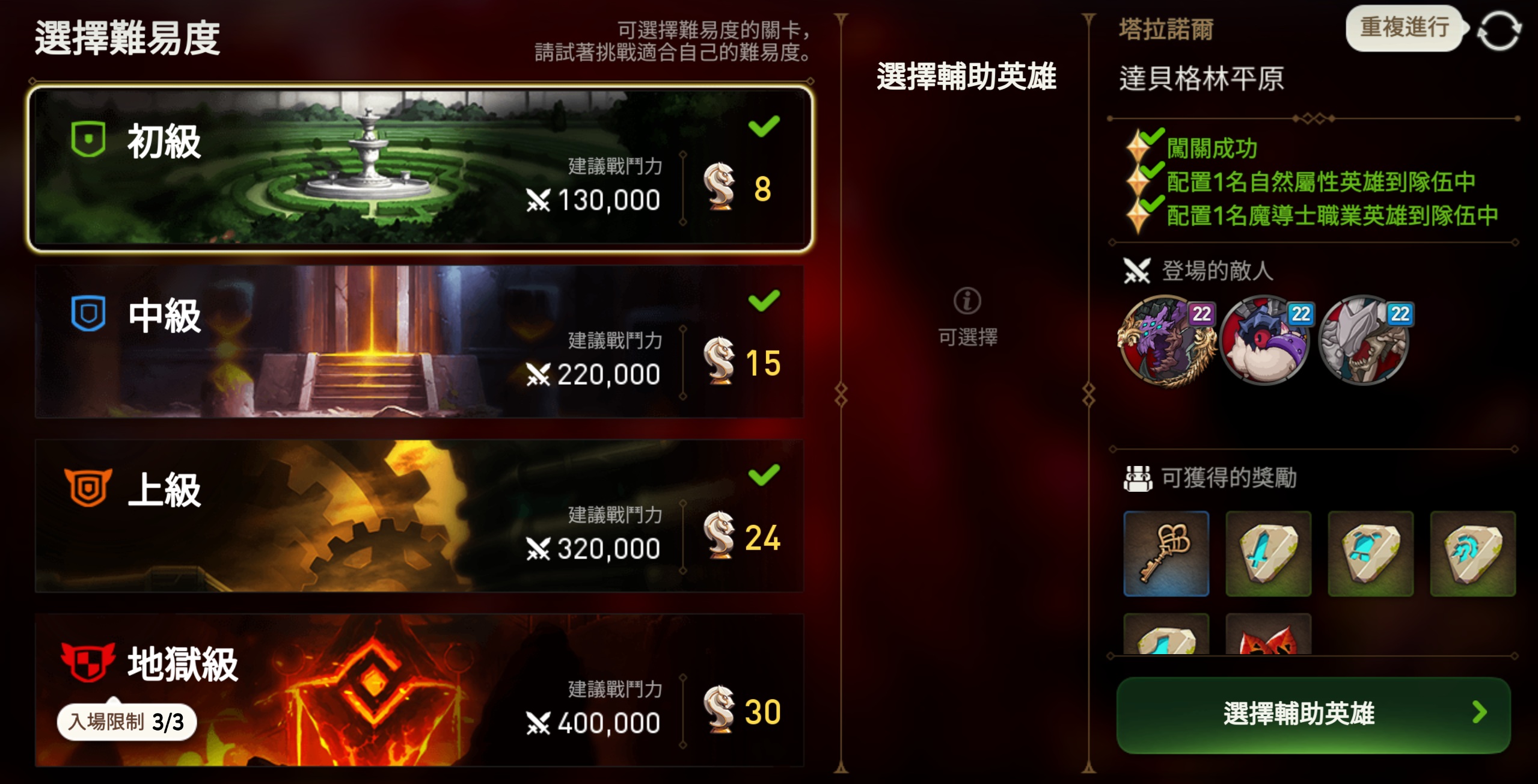 - 期間內地獄級難易度只可完成闖關3次,可在難易度選擇介面確認剩餘次數。