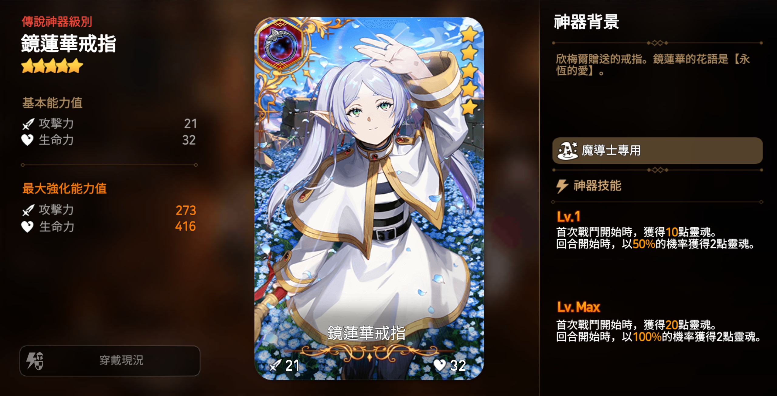 ※ 【鏡蓮華戒指】神器僅能在「芙莉蓮&鏡蓮華戒指限定召喚機率UP!」獲得。