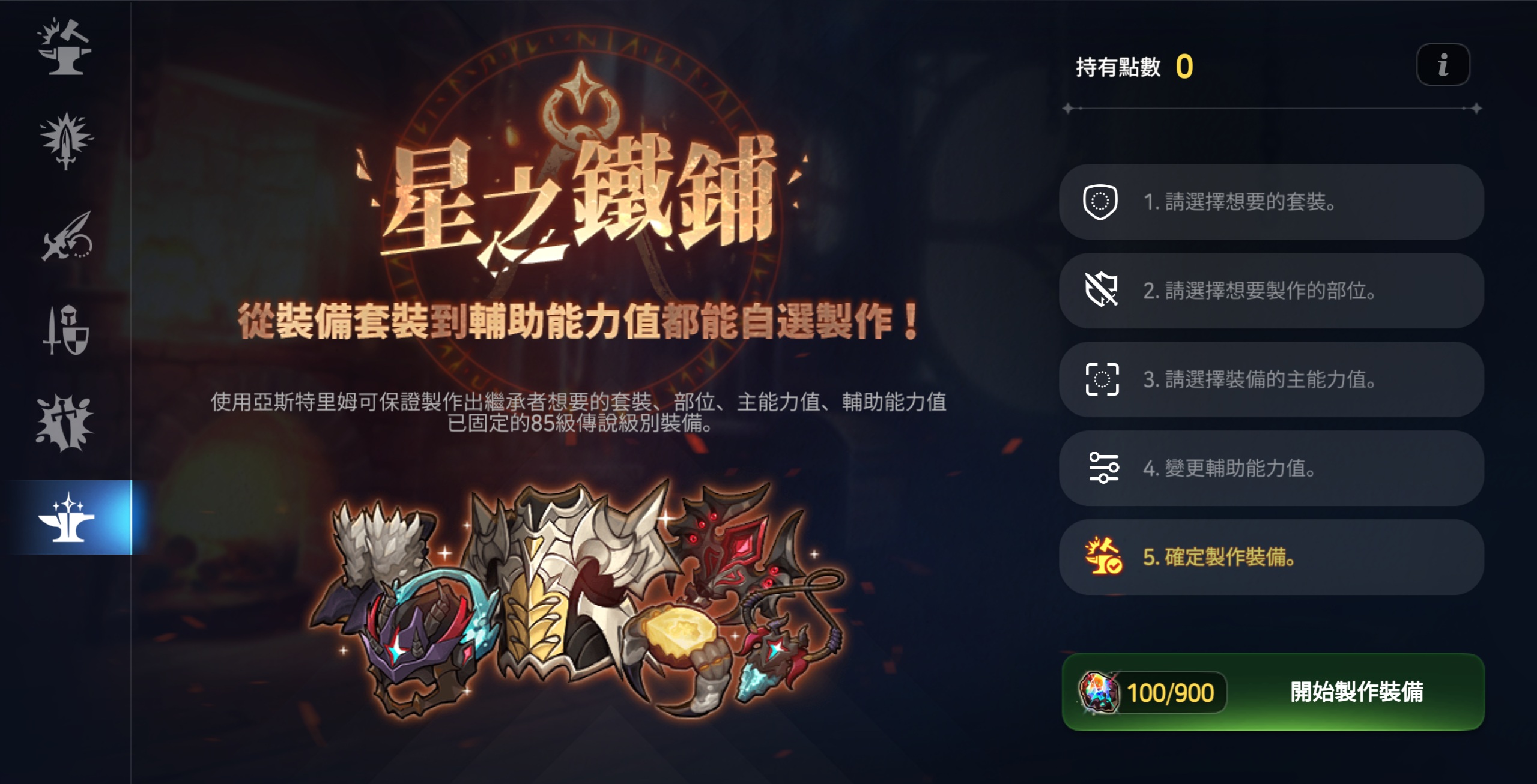 - 進入星之鐵鋪時,可挑戰製作1種想要的裝備。