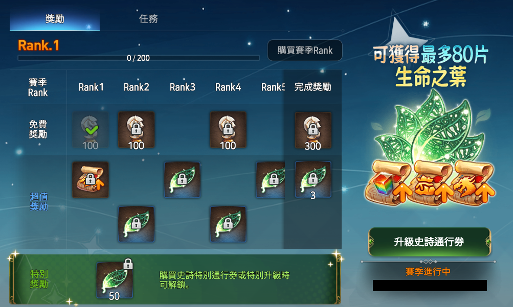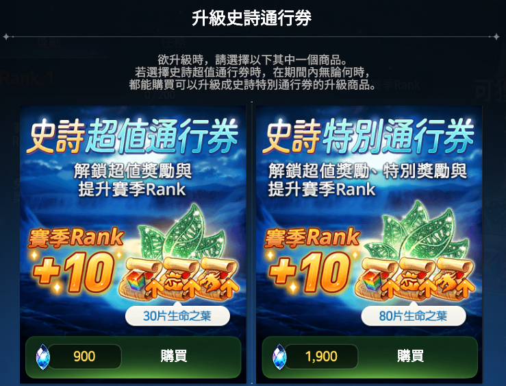 ※ 在領取史詩通行券獎勵期間,也可以購買史詩通行券升級商品,但無法獲得史詩通行券的經驗值。