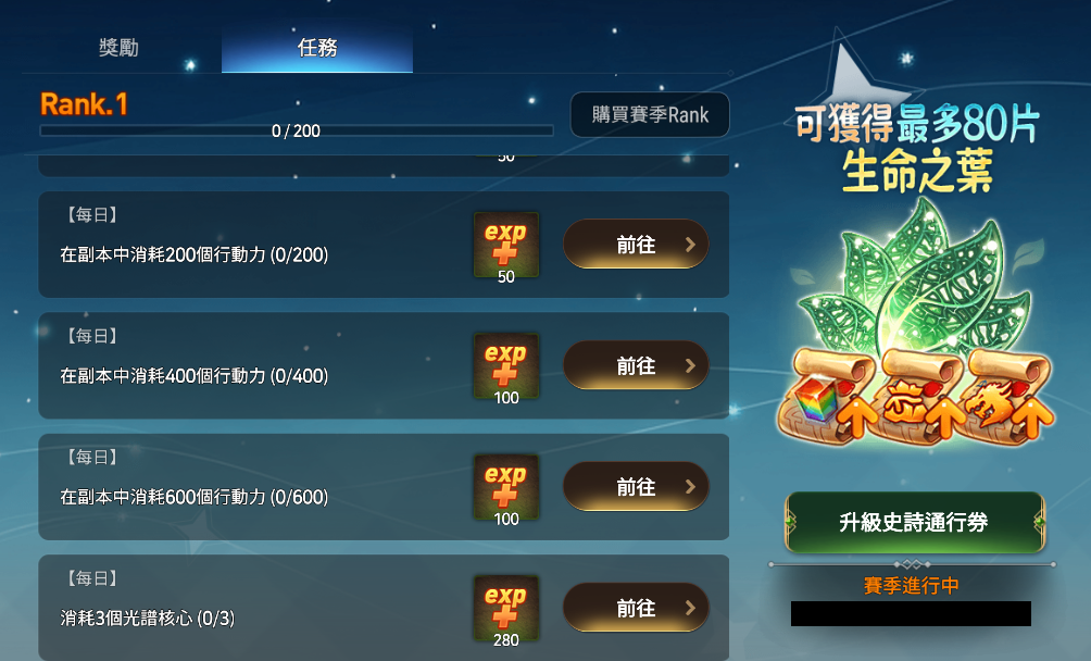 完成獎勵 | 行動力 | 300 | 生命之葉 | 3 | | |