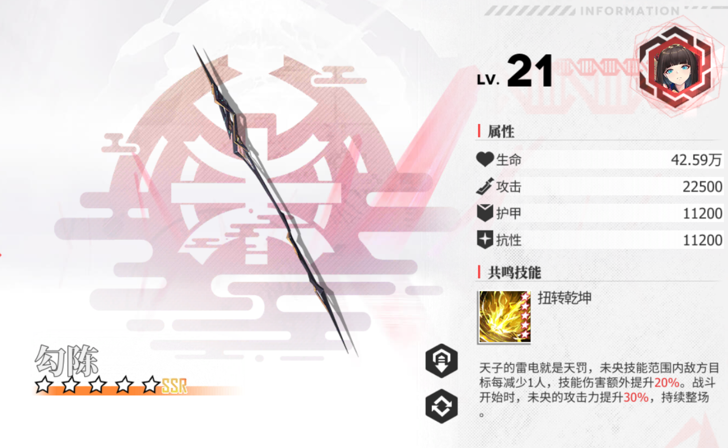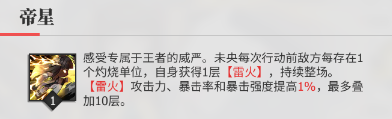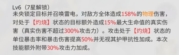 敌方每存在一名带有【灼烧】状态的单位,自身就可以获得一层雷火,雷火会提升未央的攻击力、暴击率、暴击伤害。因为这个层数是永续的,并且可叠加,只要获得就会存在到战斗结束,所以这使得未央在持续作战中会愈战越强。