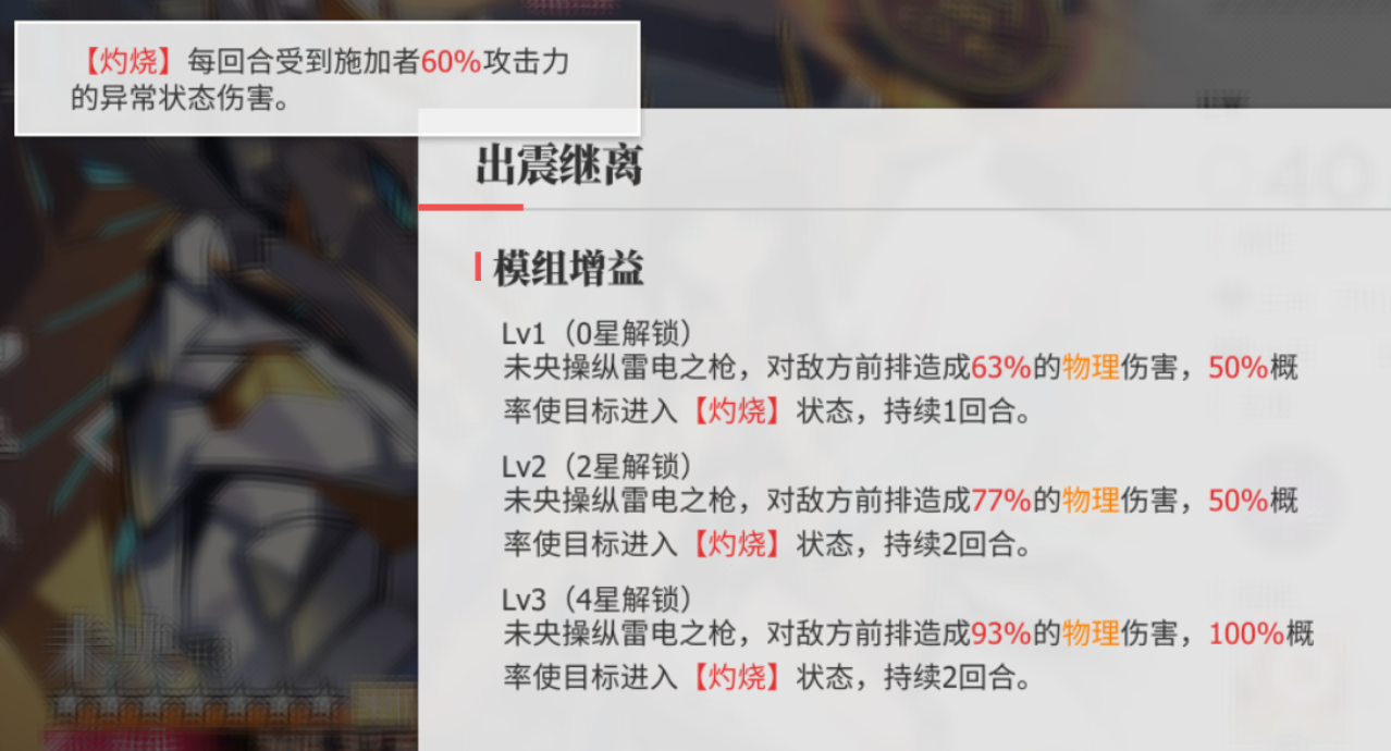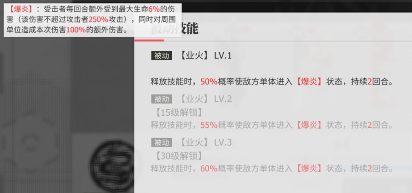 针对敌方前排的AOE攻击,在攻击的同时会使对方进入【灼烧】状态,可见就算没有队友帮助,她自己也是一名给对方添加灼伤状态的好手。虽然4星后【灼烧】会稳定命中,但在实战中应用场合不多,不用刻意追求。