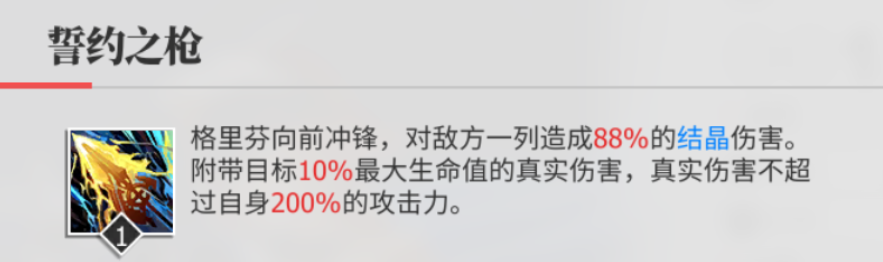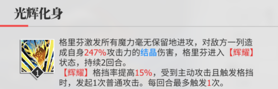 格里芬的主要伤害来源是释放技能进入【辉耀】状态后的“反击”,在此期间每次格挡都会触发一次普通攻击,由于格里芬的普攻可以造成敌方血量百分比的真实伤害,所以可以通过多次触发反击来对敌人造成高额伤害。