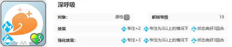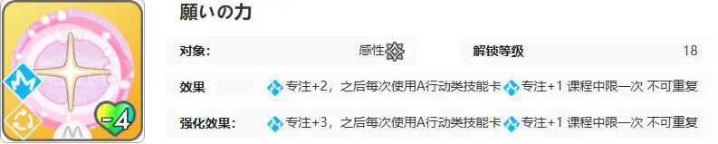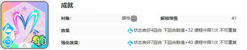 8费,强化后7费。其实绝好流在育成中能够保持体力溢出,魅惑の視線和演出計画功不可没。如果你选择单走这张,体力是否够用,依旧无法保证。当然,魅惑+这张能够保持上课期间几乎覆盖完成绝好调的状态,对于小刀蹭刀非常有帮助。
