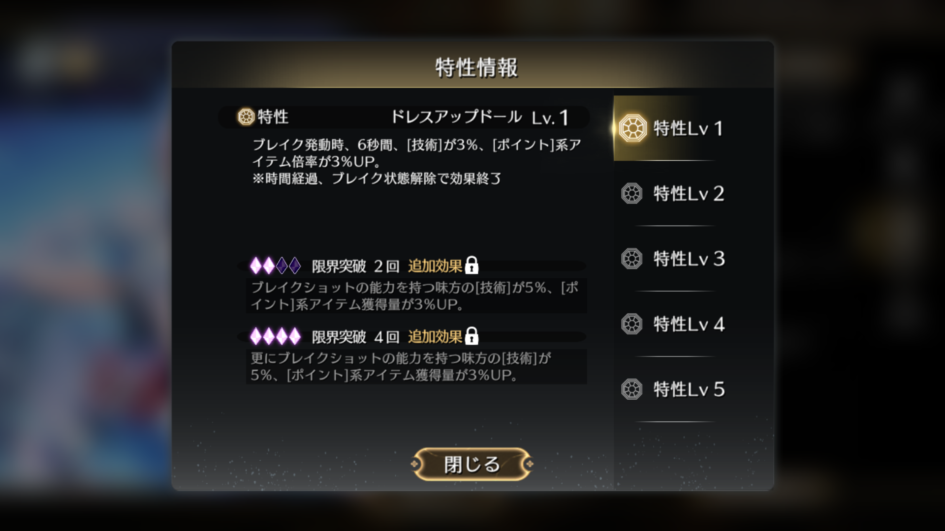Lv.5 Break发动时,在12秒内提升[技术]数值5%,[点数]类道具倍率提升6%。