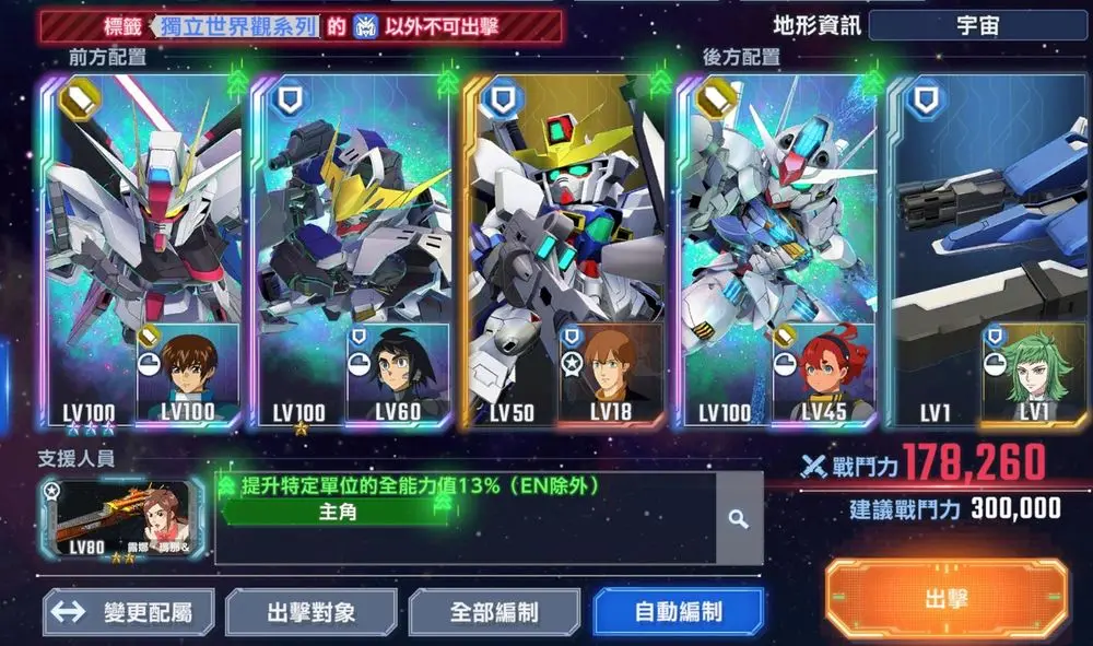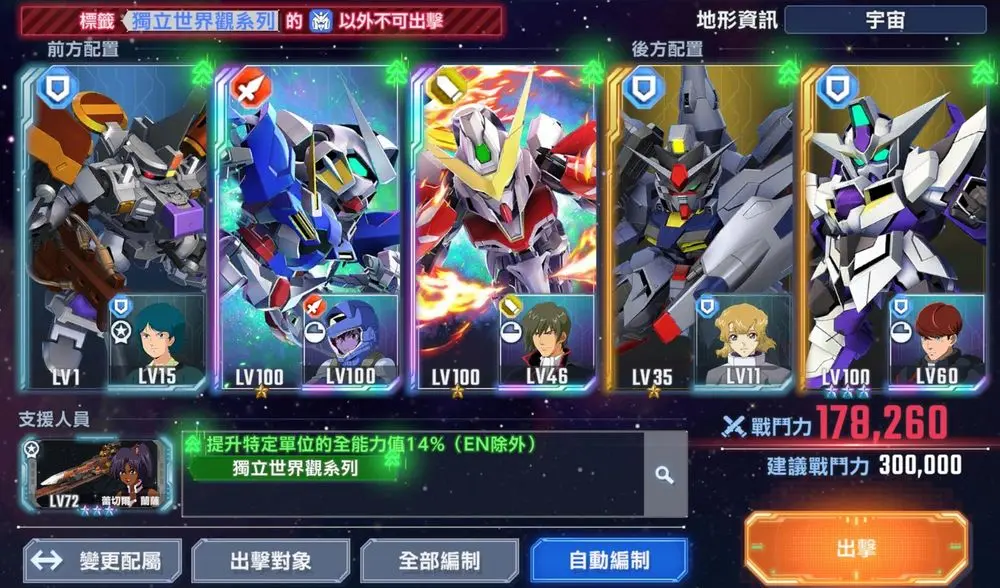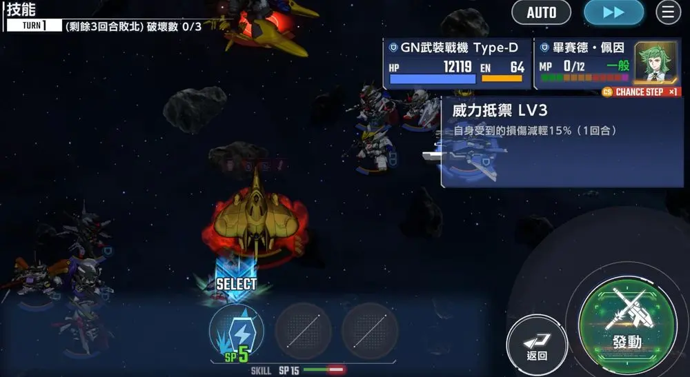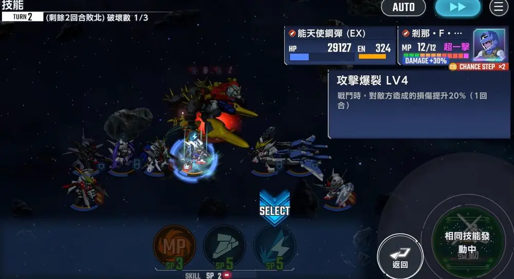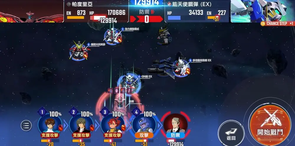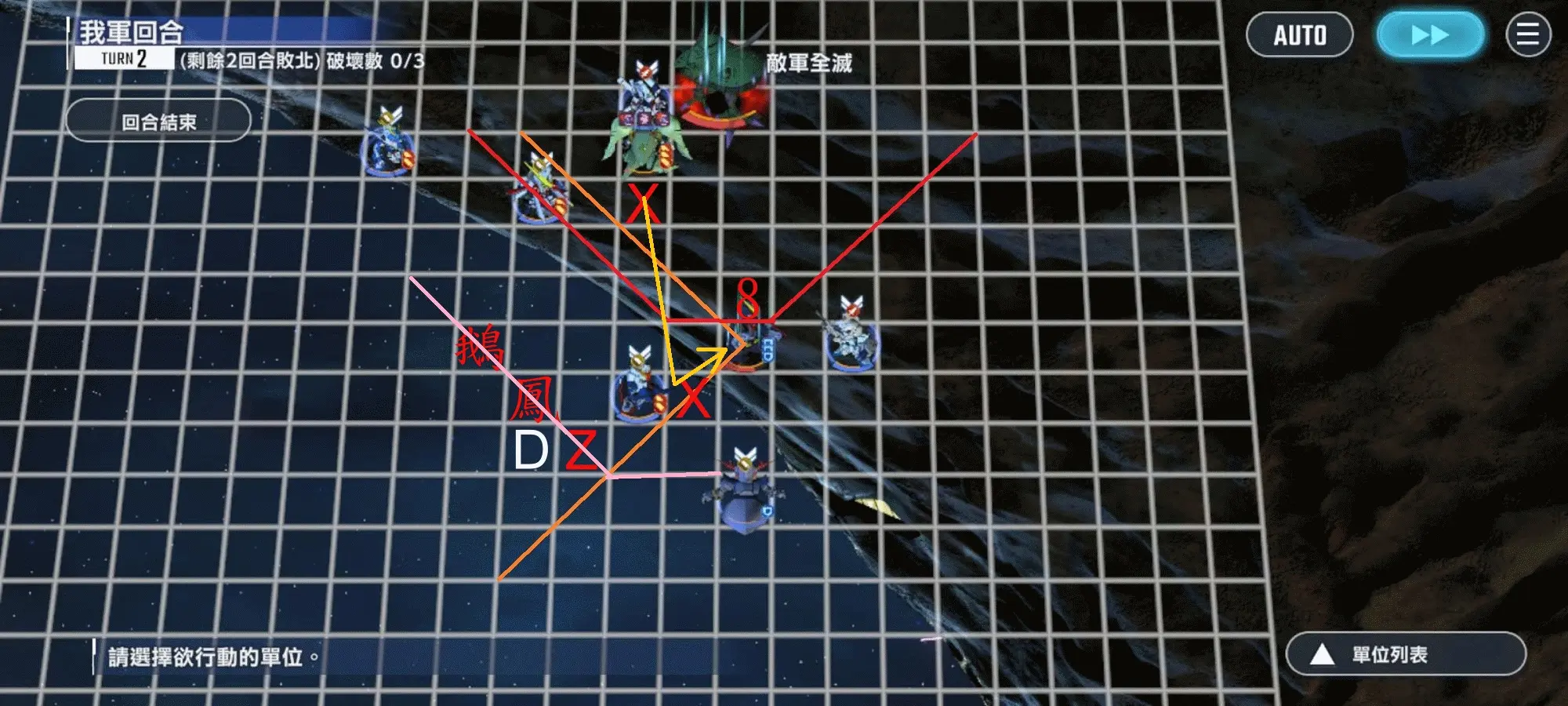 第二回合类似顺序,但因为先前残血角色不少,可以抓恶魔钢弹的2、5格反击以外的范围去上DEBUFF,并扣住所有援护在EXIA反击的回合做大量的援护伤害输出