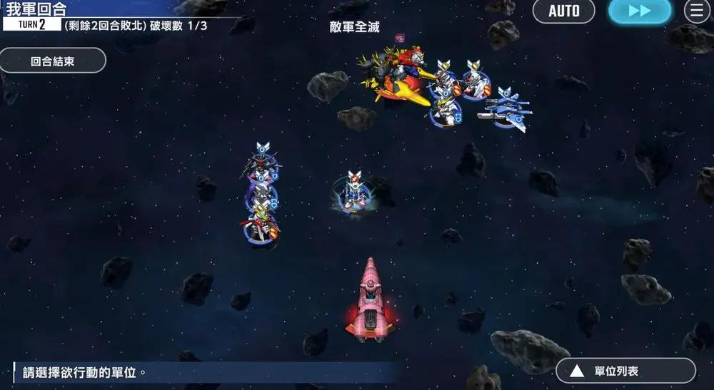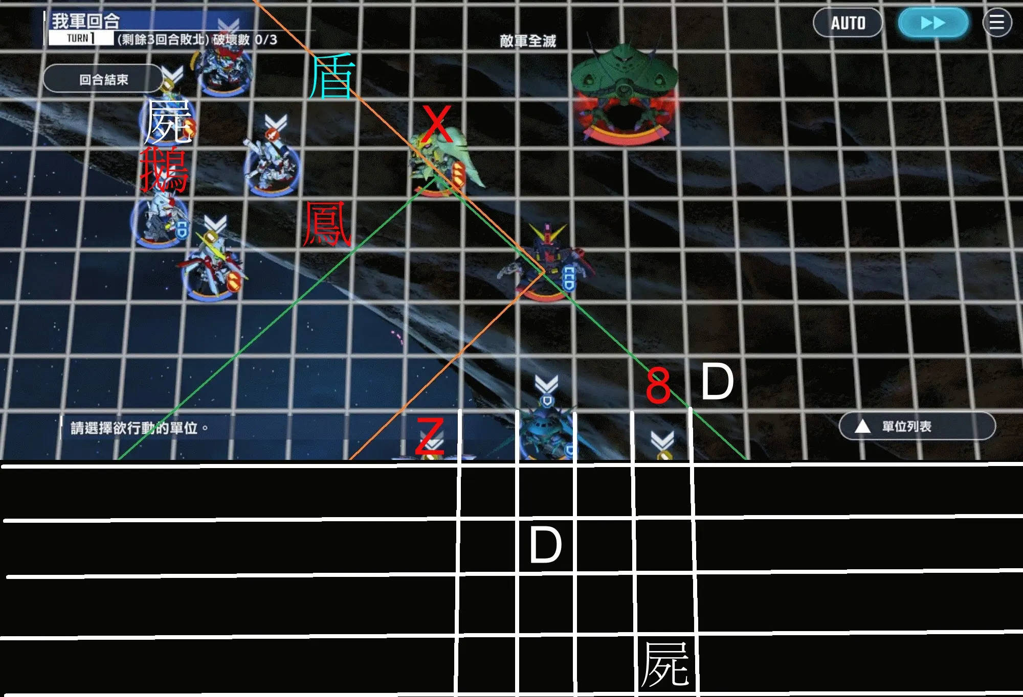 第三回合自由MAP打X钢战舰,其他人站空隙打恶魔后EXIA收头,1.5钢打X钢战舰触发三个援护DEBUFF并降攻光荣牺牲(千万不要贴身不然对面会防御)