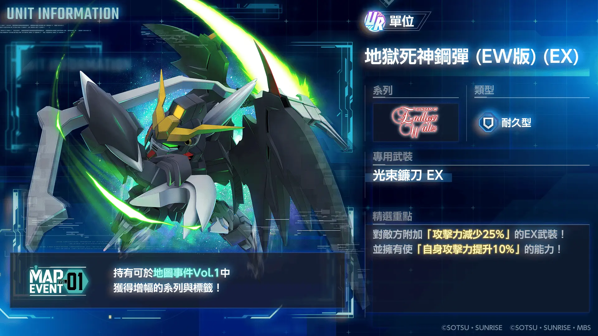 UR「地狱死神钢弹(EW 版)(EX)」/UR「迪欧‧麦斯威尔(EW 版)」于精选机体补给中限期登场,并有 UR「制作攻击钢弹(全装备型)(EX)」/UR「岭司」以及 UR 支援人员「露克蕾琪亚‧诺因&超音速运输机」等新阵容陆续登场。