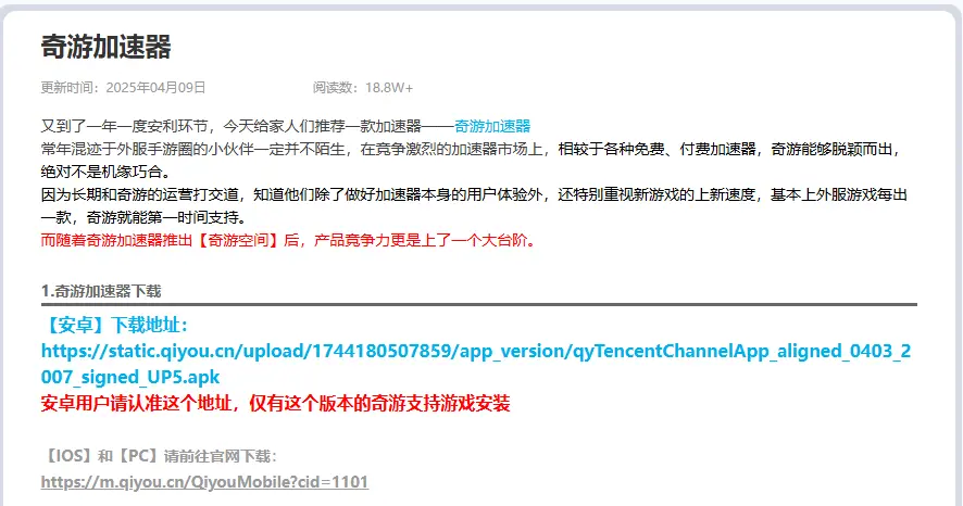 第一步:Gamekee内找到【奇游手游加速器】下载页面进行安装 【奇游加速器】专业版-支持游戏下载